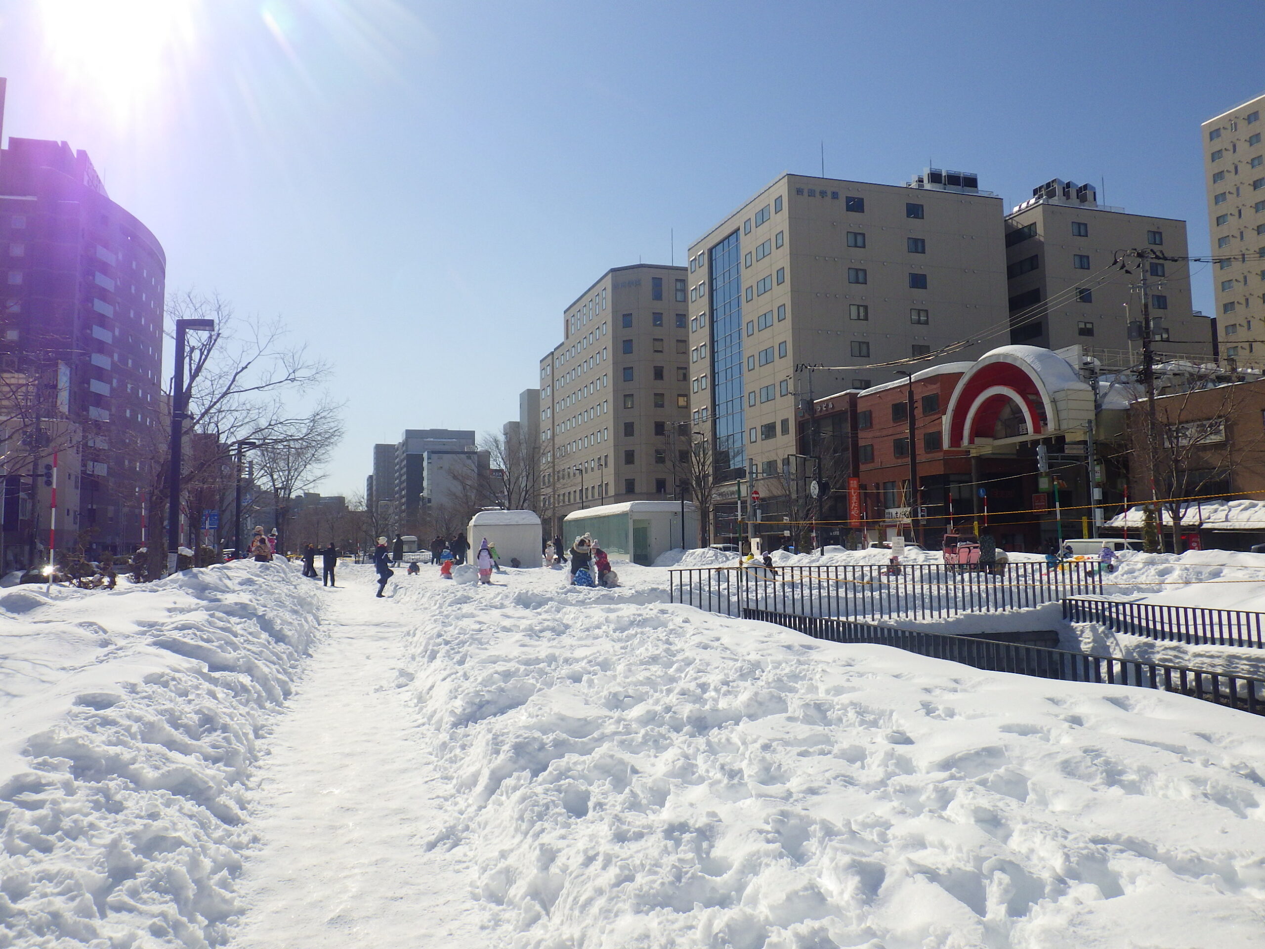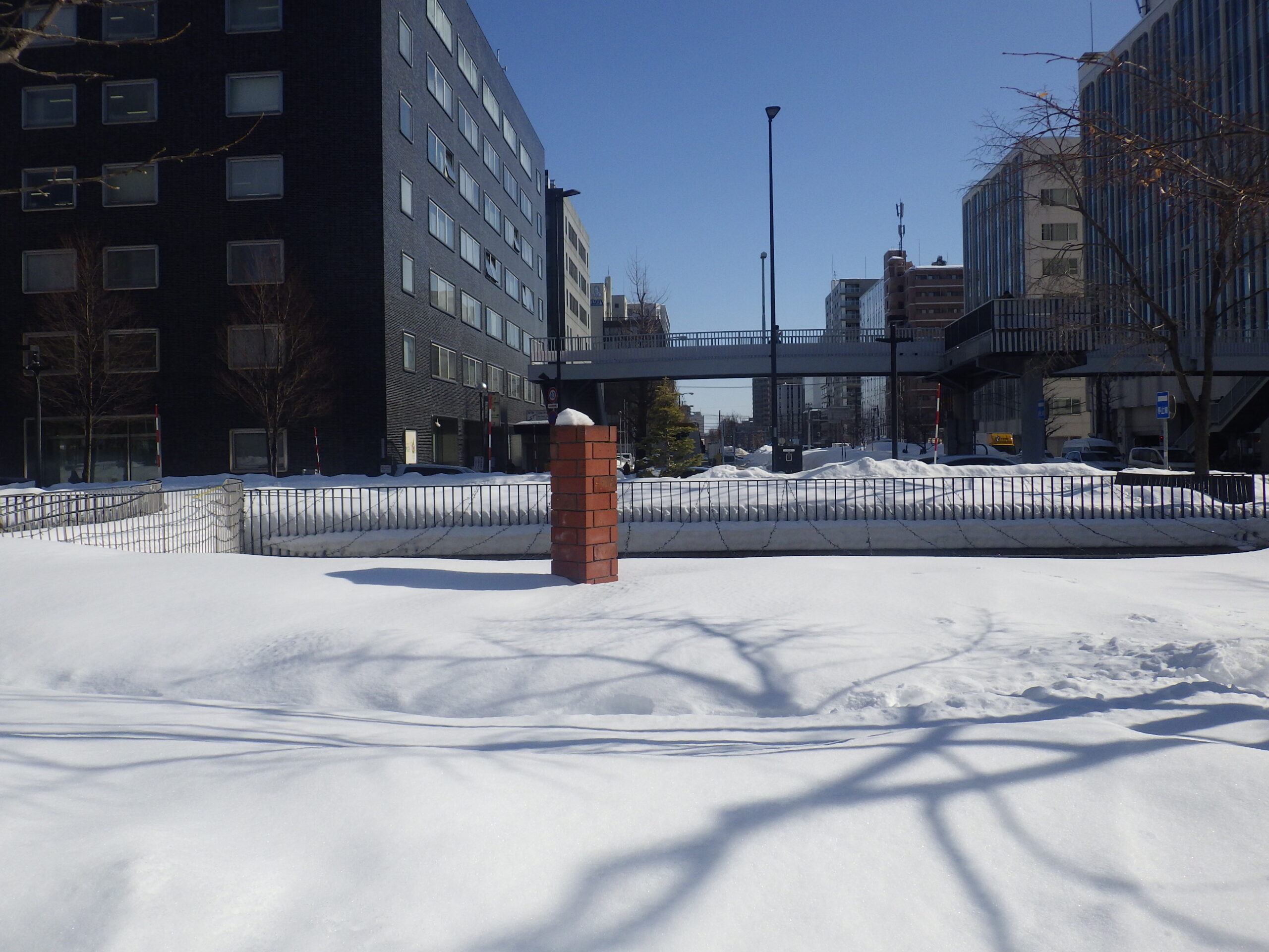 2月25日火曜日、2月もそろそろ終わりに近づいてきました。 気温も5度まで上がったようです。 大通ブロック、スノーリング横の彫刻「たけくらべ」の積雪の様子です。 ずいぶん雪が降り積もりました。 こちらは、昨年2024年2月28日のたけくらべの積雪の様子です。 雪の量はほとんど変わらないですね。 雪のない時の「たけくらべ」、高さは169㎝です。半分近くが雪に埋まっているようですね。 南1条です。 狸二条広場では、たくさんのこどもたちや観光客のみなさんが、雪で遊んでいました。