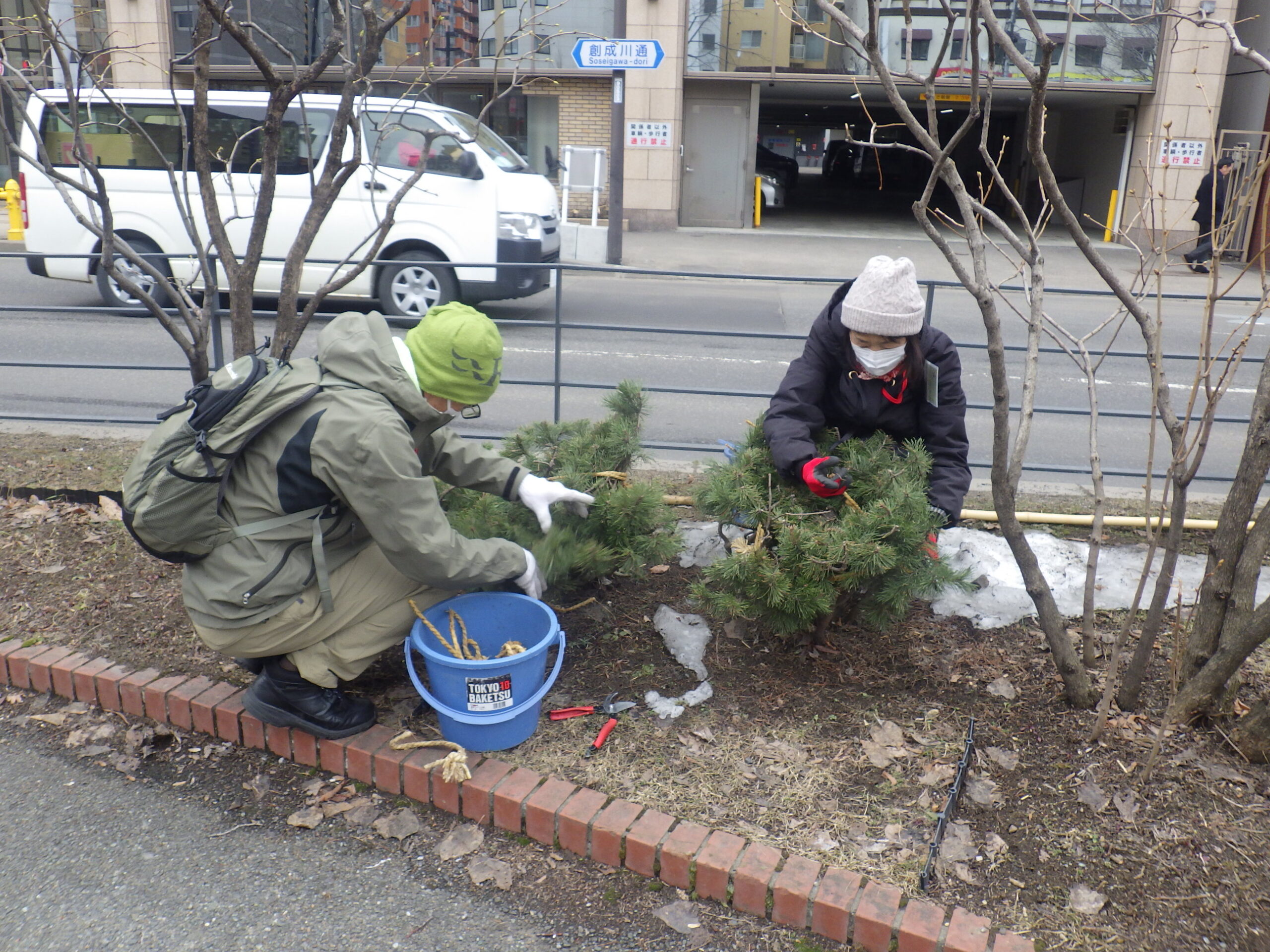 4月2日火曜日、街中の温度計は8度を示していましたが、冷たい風と曇り空に寒さを感じる中、お助け隊も活動開始です。 昨日の植物ボランティアに引き続き、ライラックの冬囲い外し。 そして雪から顔を出しているモンタナマツの冬囲いも外しました。 お助け隊では、今日から新メンバーが加わり、楽しみながら1年間作業を続けていきます。
