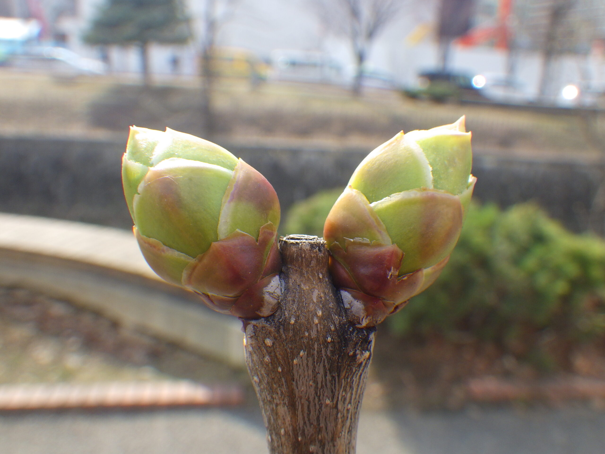 4月10日木曜日、16度まで気温が上がったようです。 芝生斜面の中のチオノドクサもつぼみを付けていました。 南2条の芝生斜面の下で1輪だけ開花しているのを発見! この暖かさが続けば、次々に開花しそうですね。 南2条東側のチシマザクラのつぼみです。まだ堅そうですが、ずいぶん膨らんできました。 ライラックの芽です。 開花が待ち遠しいですね。 ヘメロカリスの花壇でも、かわいい芽がたくさん出ていました。 植物の成長とともに、雑草たちも元気に伸びそうです。 また雑草との果てしない戦いが始まります。