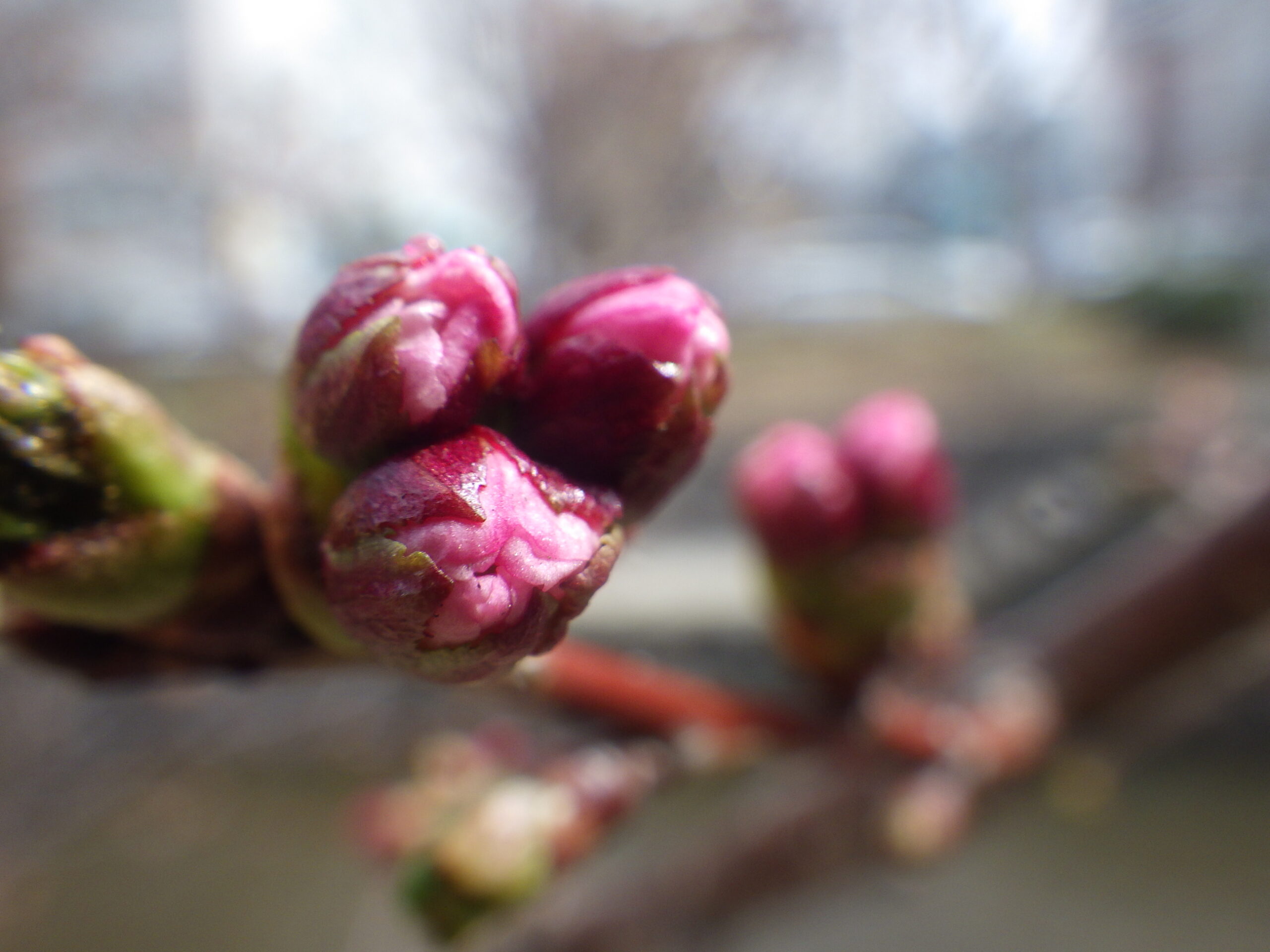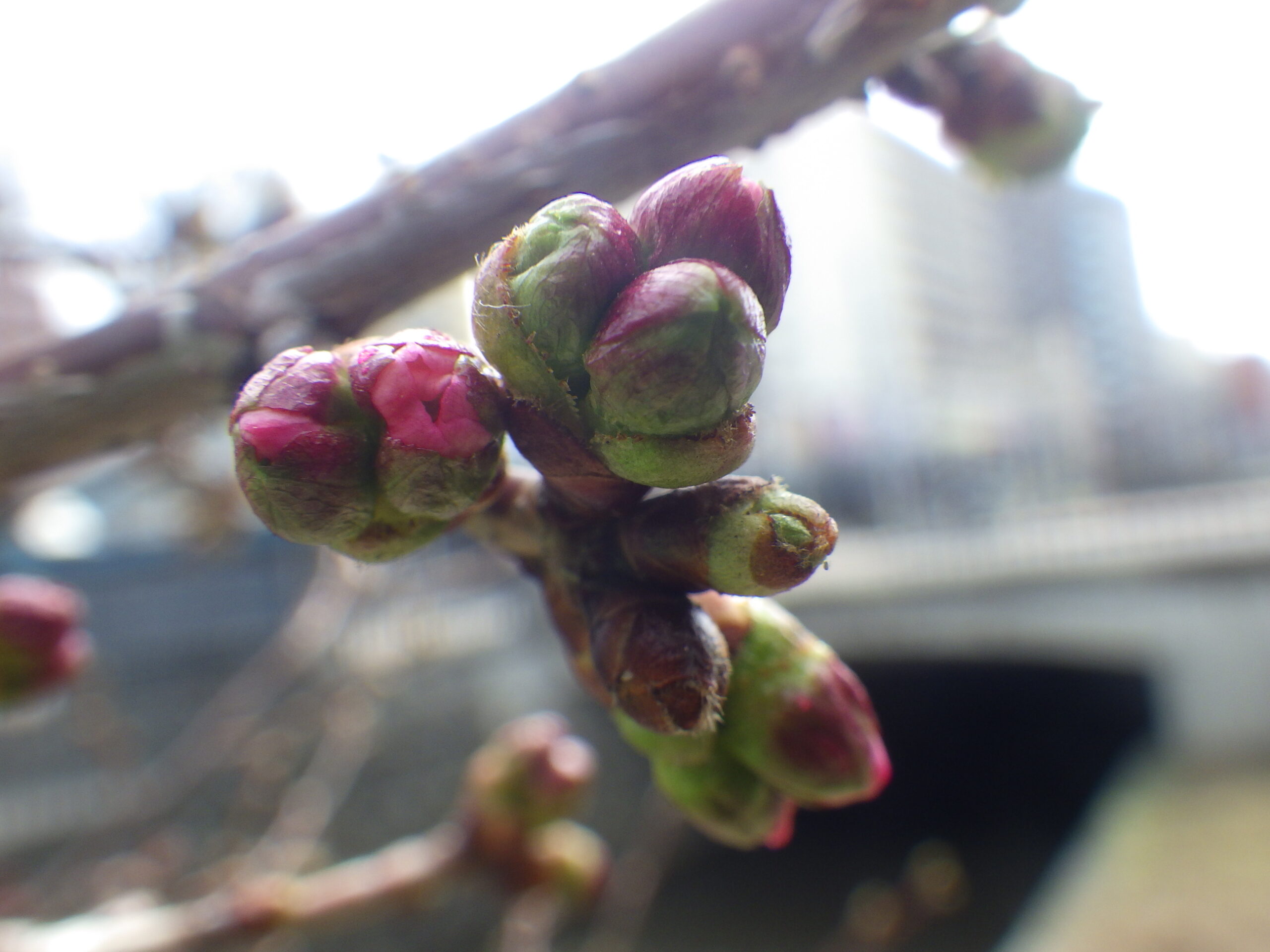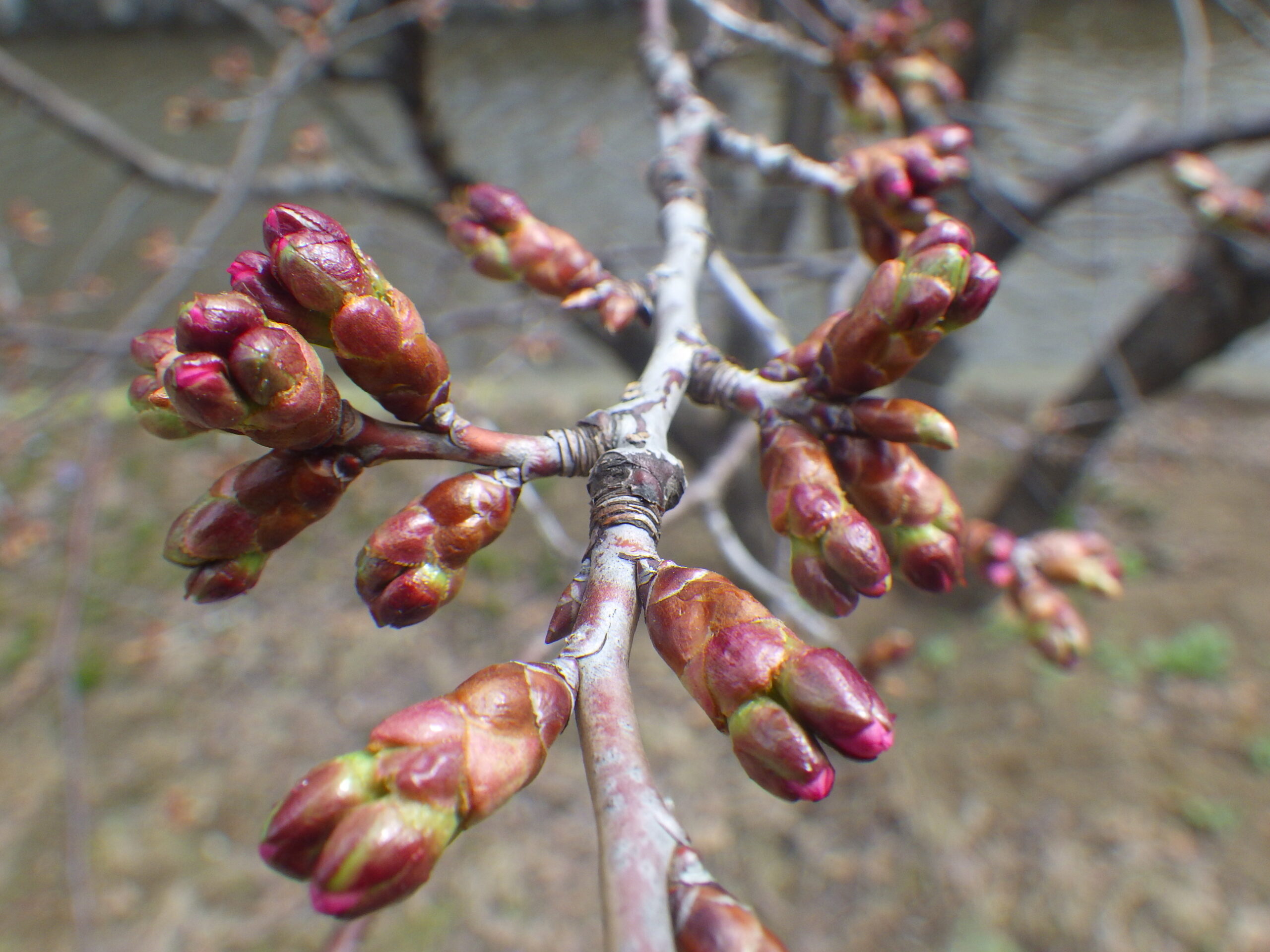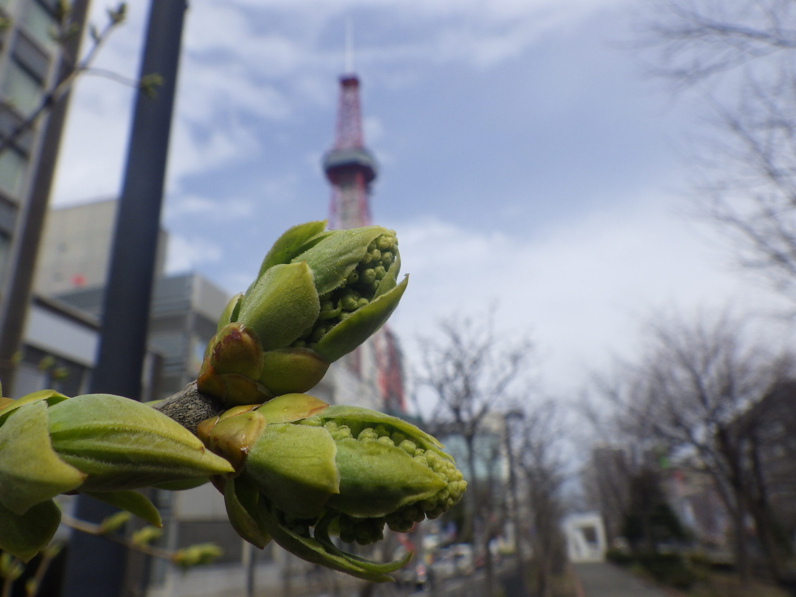 4月14日月曜日、南2条西側のチシマザクラのつぼみがピンク色に色づいていました。