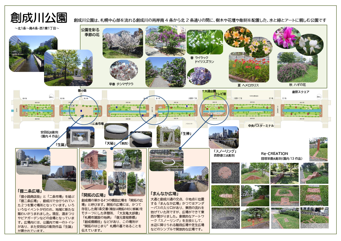 創成川公園では、4月24日木曜日から10月31日金曜日まで、スタッフが公園の色々なお話をしながら一緒に歩く「創成川公園まるわかりガイドツアー」を開催します。