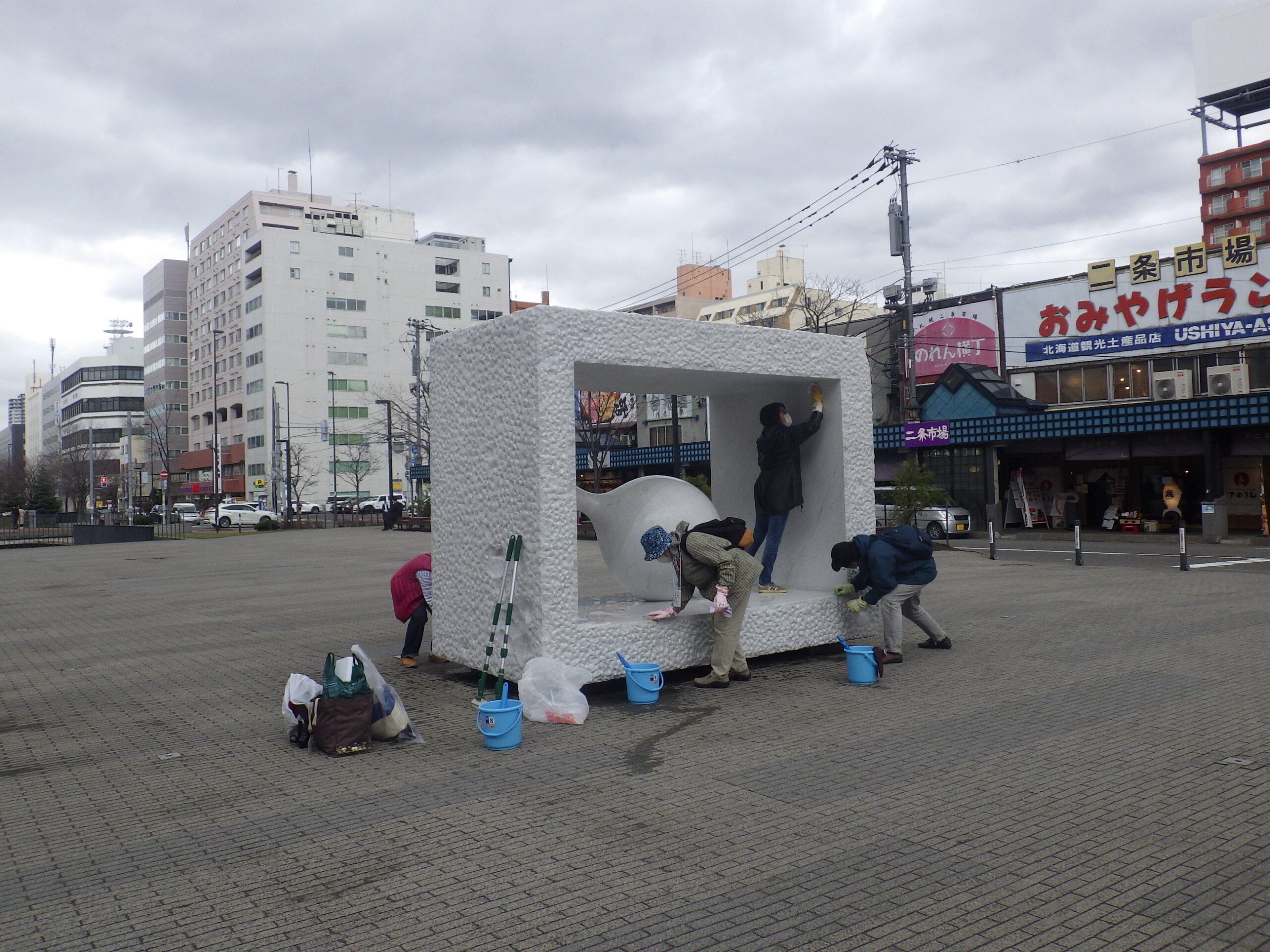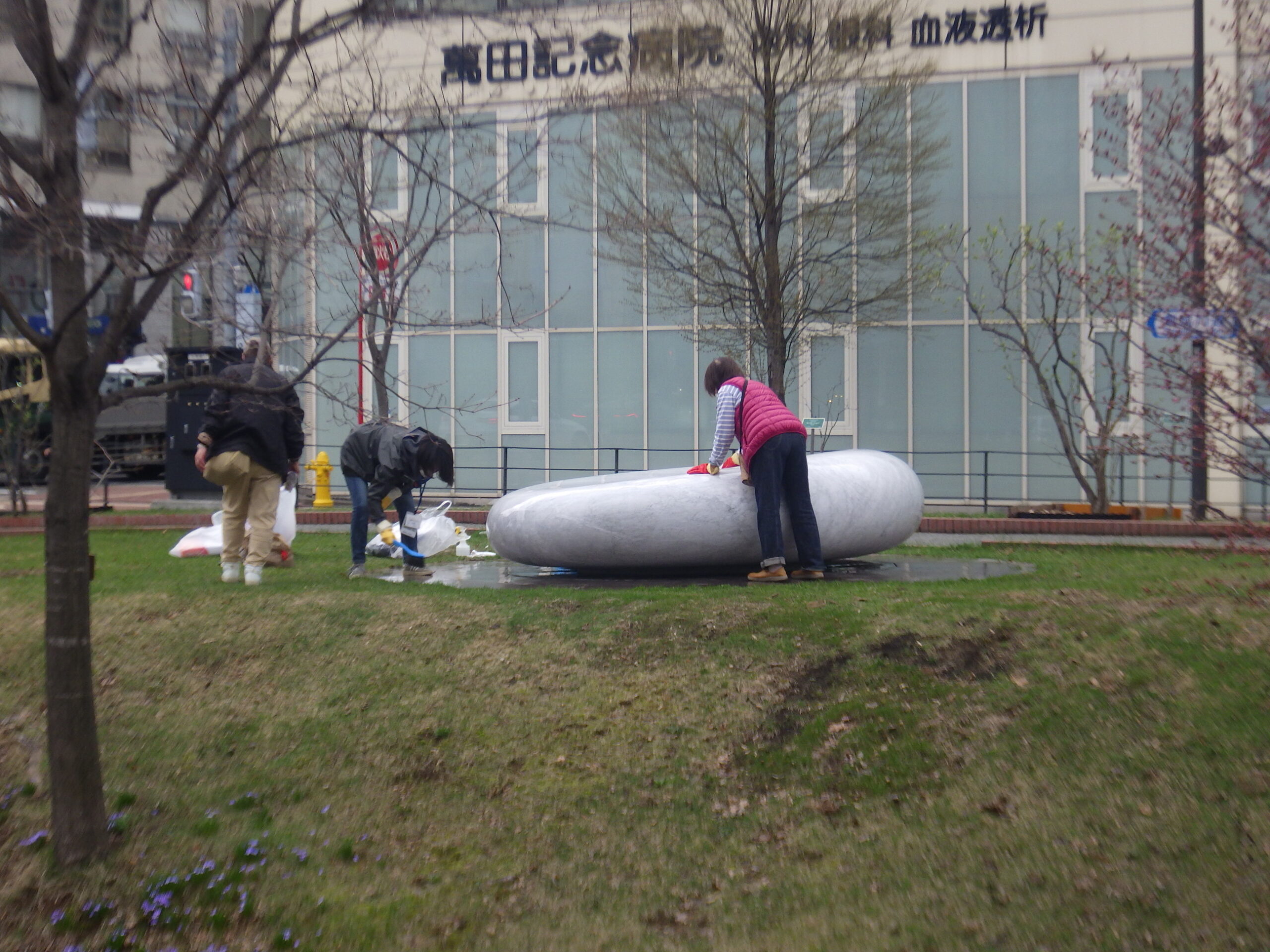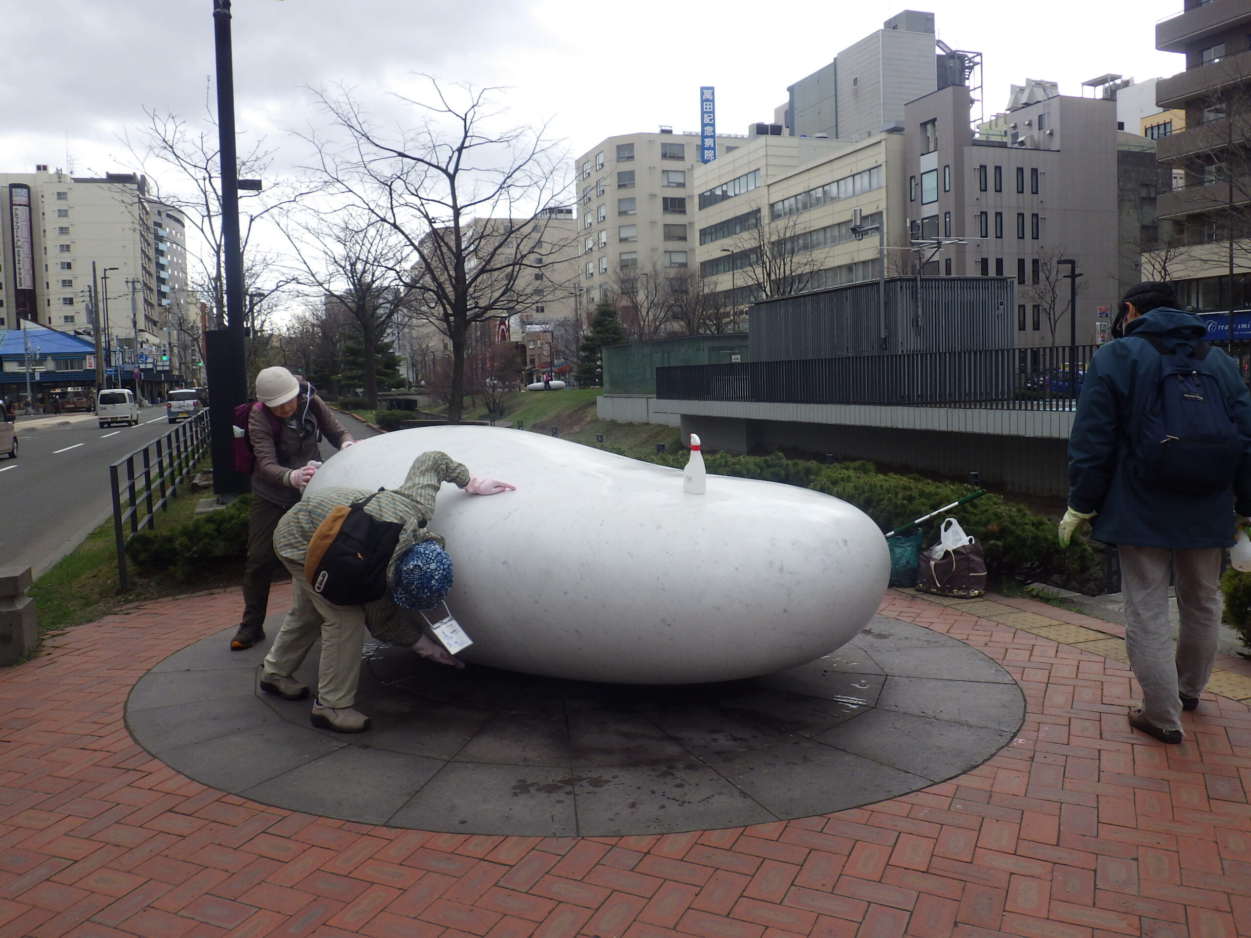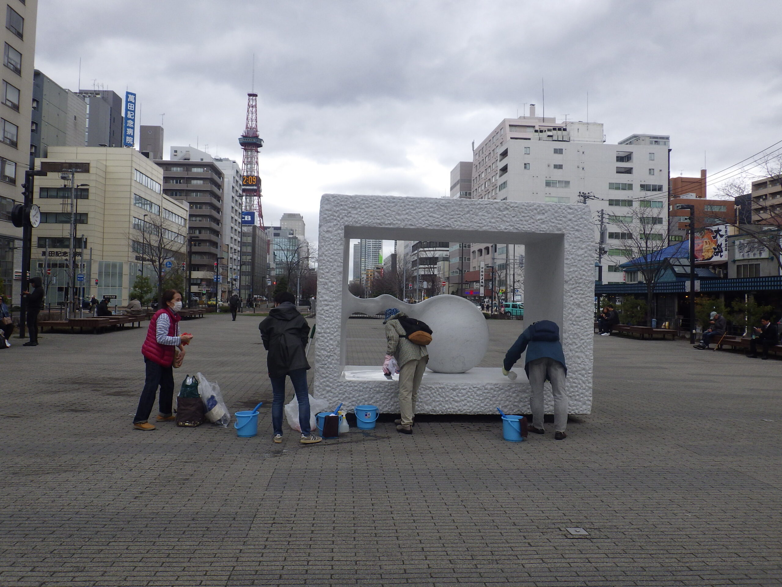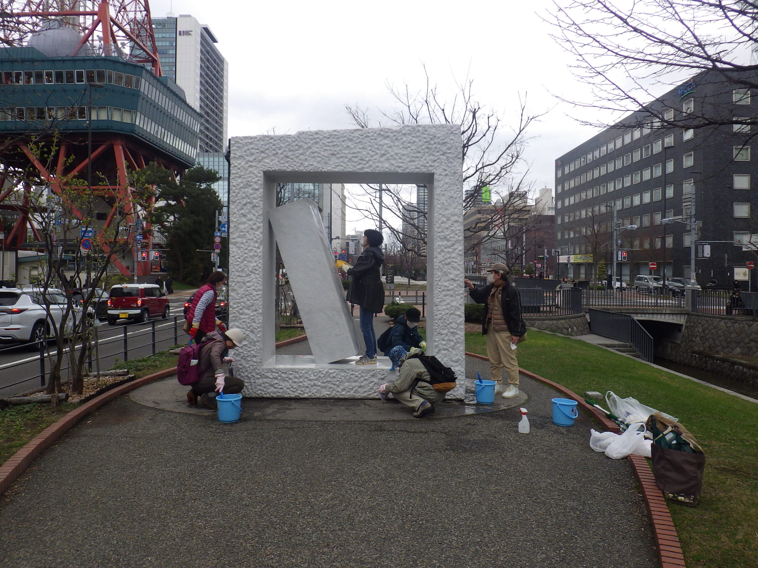 4月19日土曜日、安田侃さんの4つの彫刻の清掃を毎月行ってくれる彫刻清掃ボランティア「創成川ポポロ」のみなさんの活動が始まりました。 まだ冬ごもりのシートが外されたばかりなので、そんなに汚れてはいないようですが、皆さん丁寧にお掃除していきます。 南2条西側の天秘 南2条日東側の天秘 最後は南1条の生棒です。 今年も1年間、よろしくお願いします。