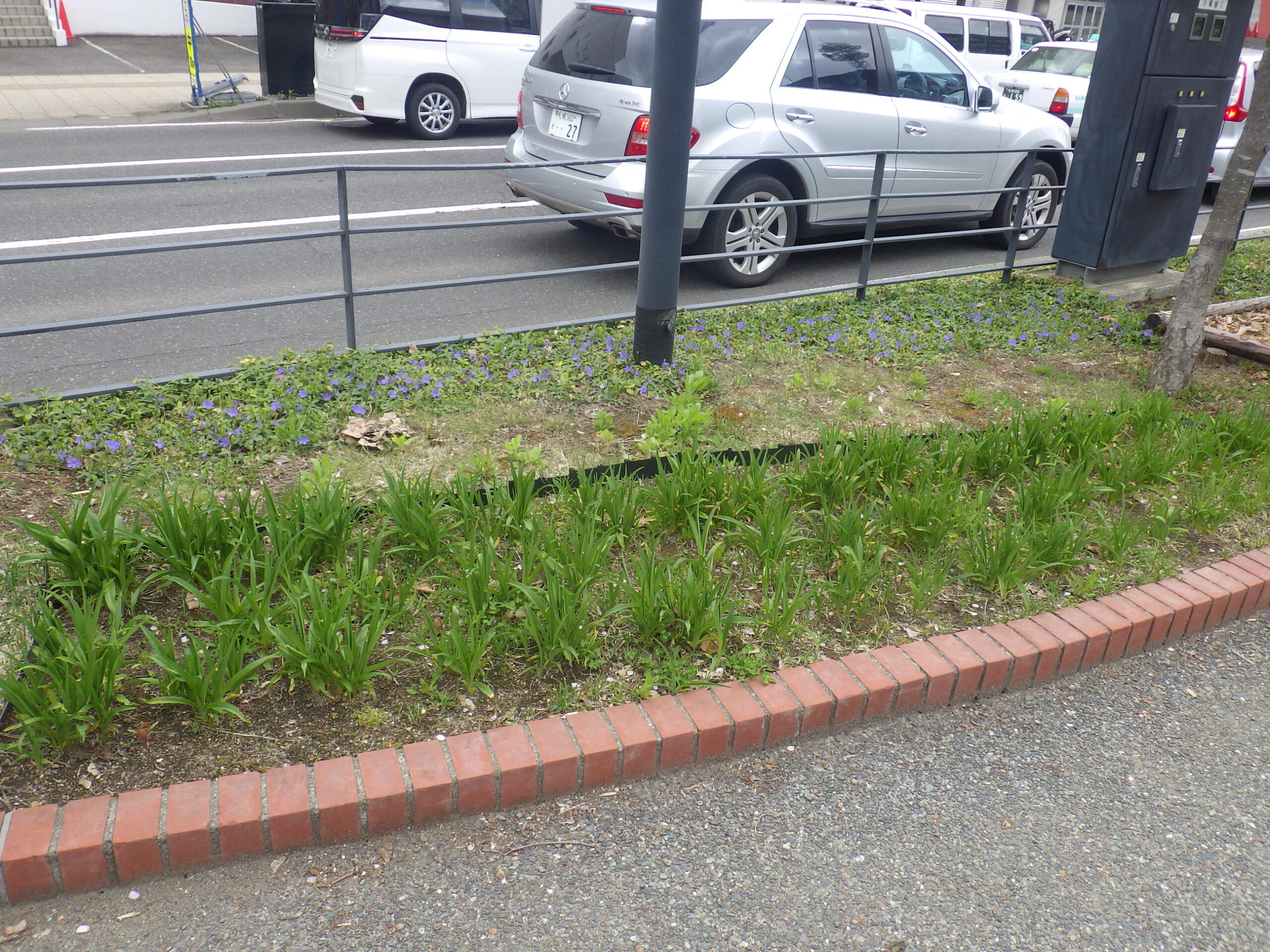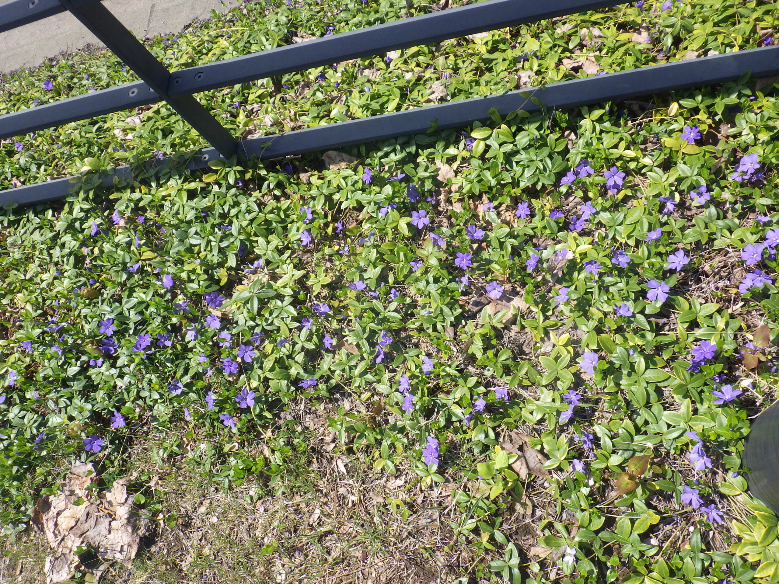 道路側に沿ってたくさんの花をつけているのは「ビンカミノール」です。