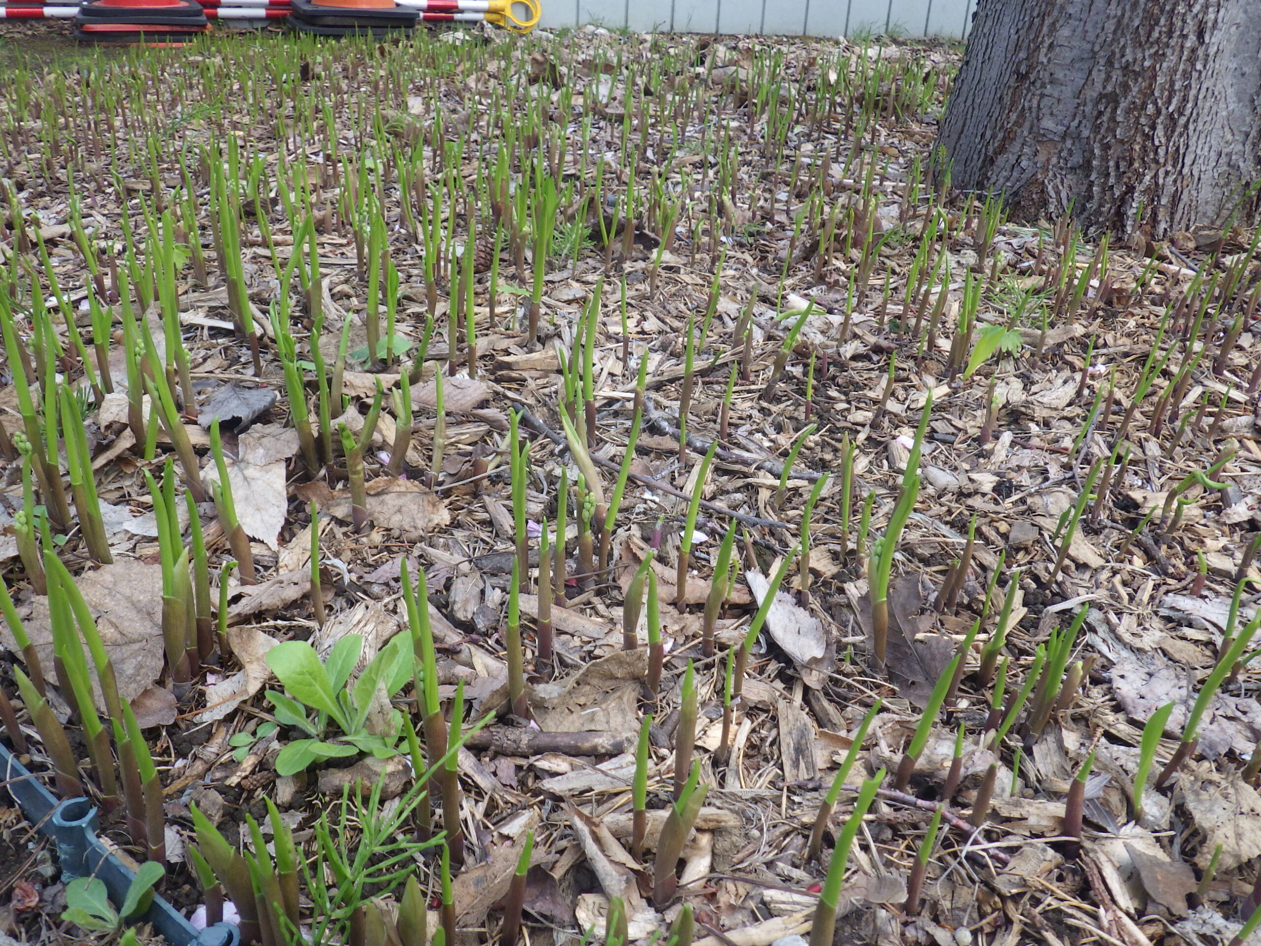 スズラン花壇からもたくさんのスズランの芽が出てきています。
