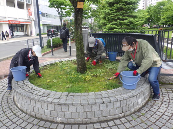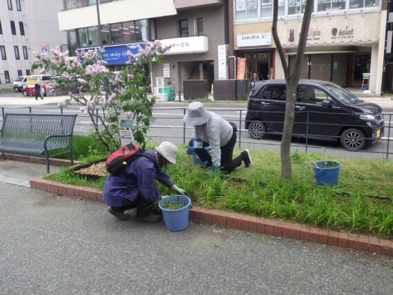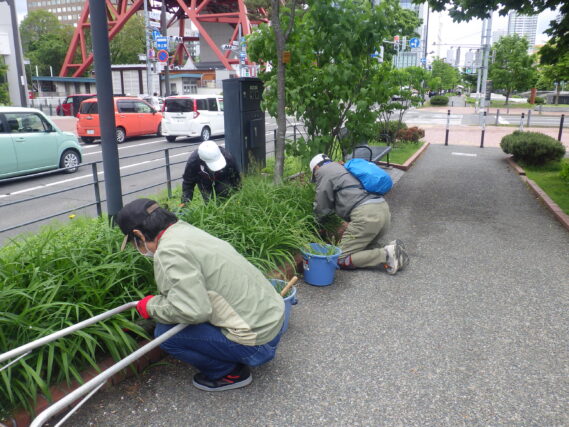 6月4日水曜日、雨上がりの中、お助け隊では円形ますとヘメロカリス花壇の除草を行いました。