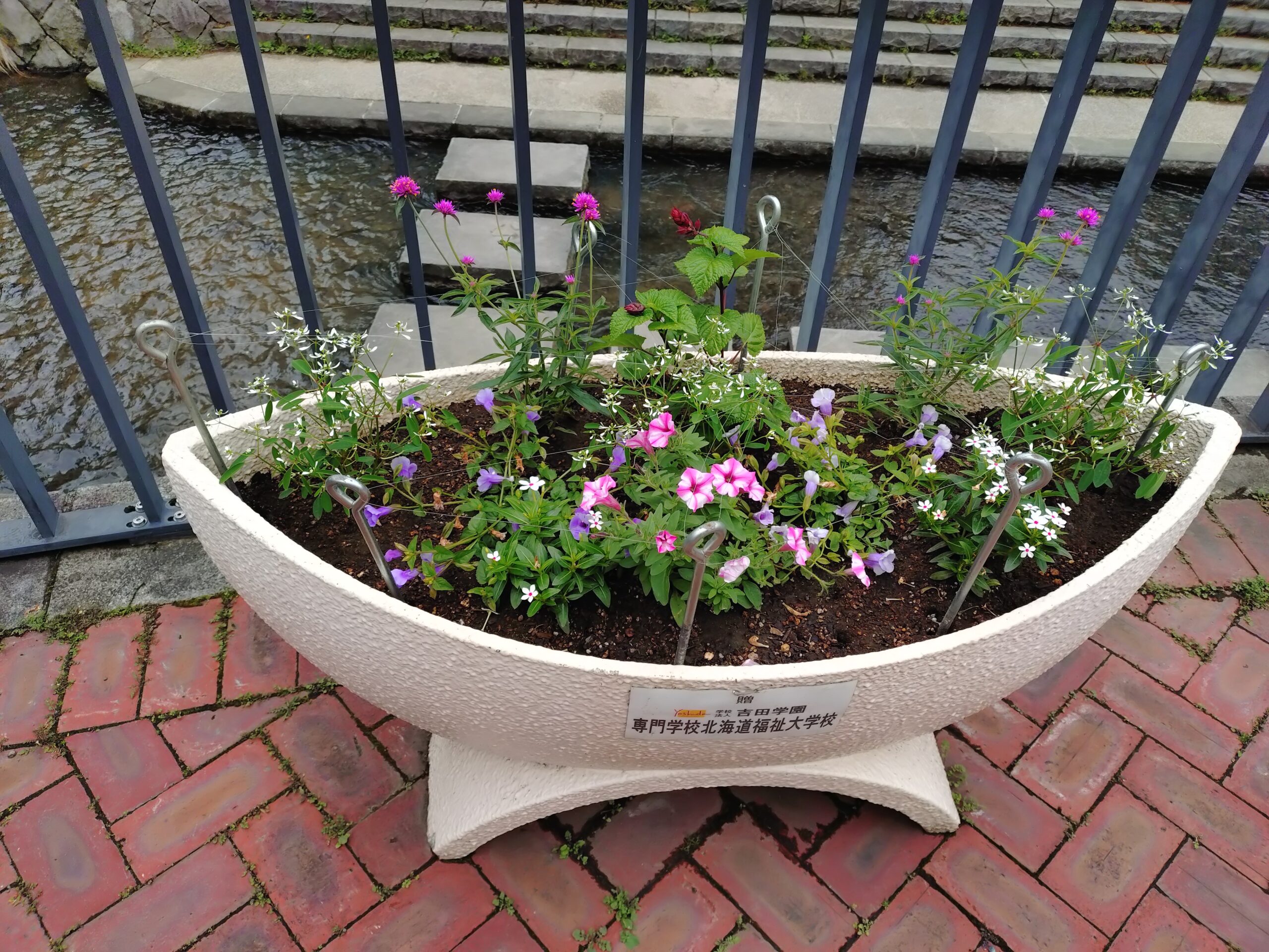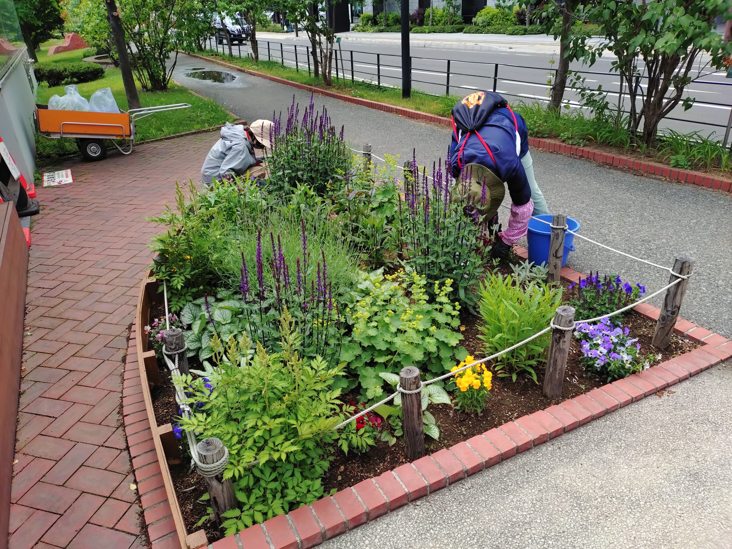 花くらぶでは、6月最初に植えこんだ狸二条広場のコンテナの花のお手入れ