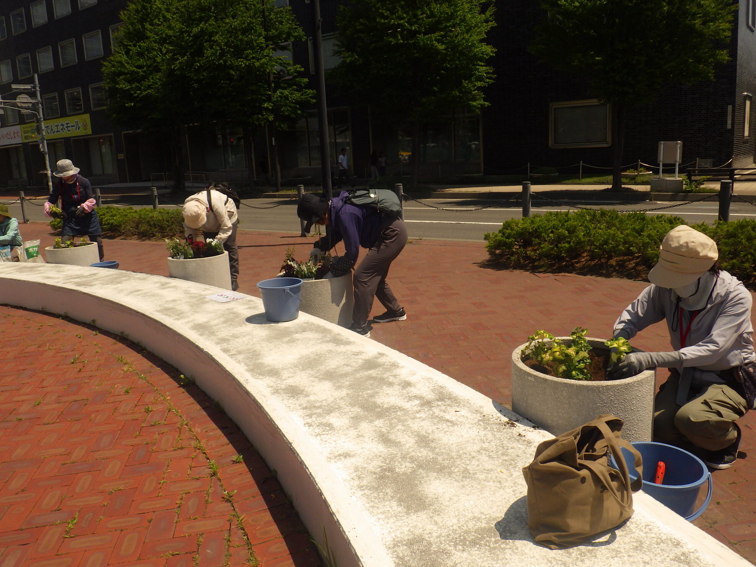 次の日の6月19日木曜日、花くらぶではまんなか広場のコンテナ花壇の植え替えを行いました。