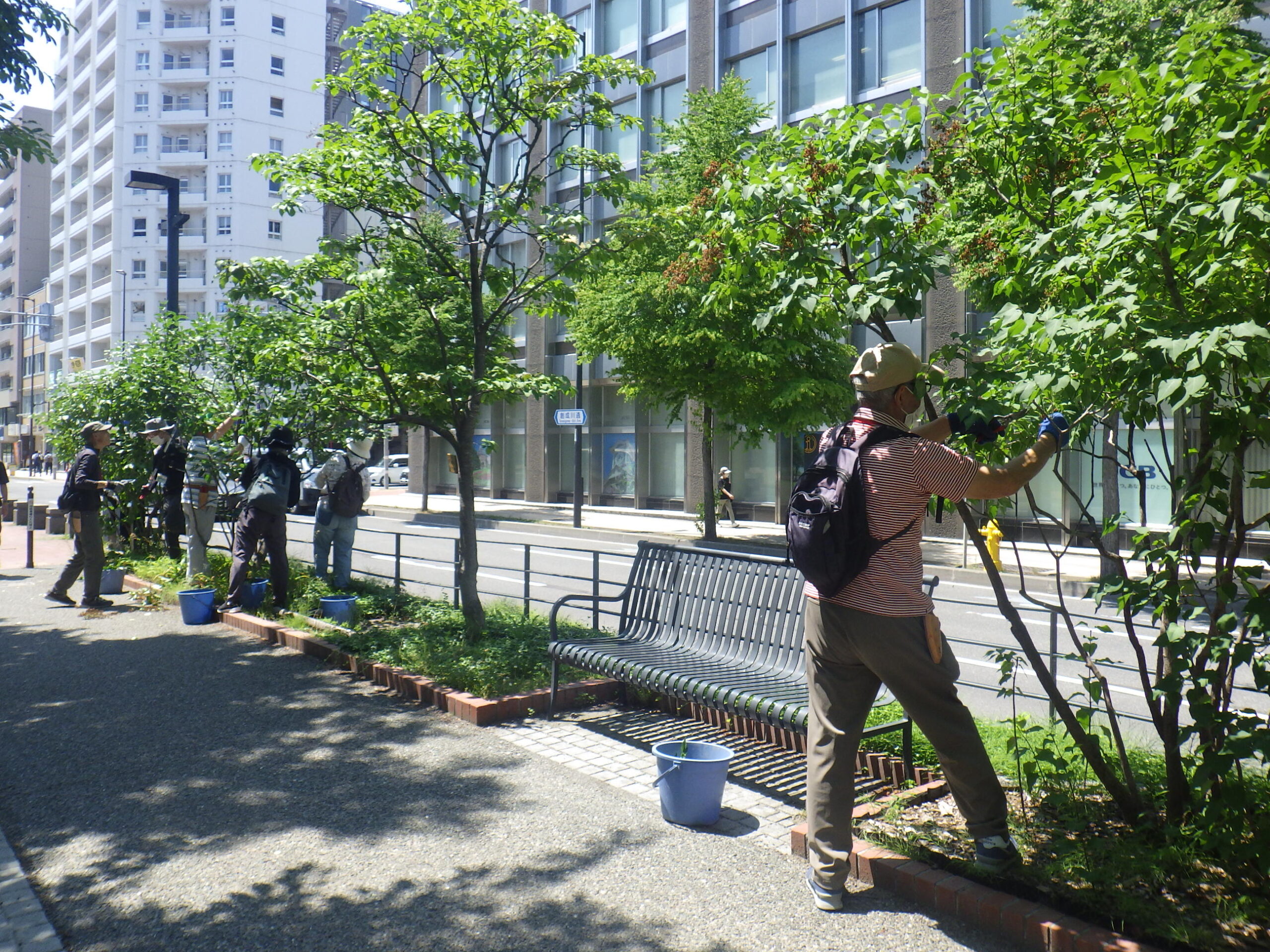 6月24日火曜日、植物ボランティアはライラックの花がら摘みです。花がらがずいぶん茶色くなって、種の出来ているものもあります。早く取らないと、と暑い中でも頑張る植物ボランティアです。