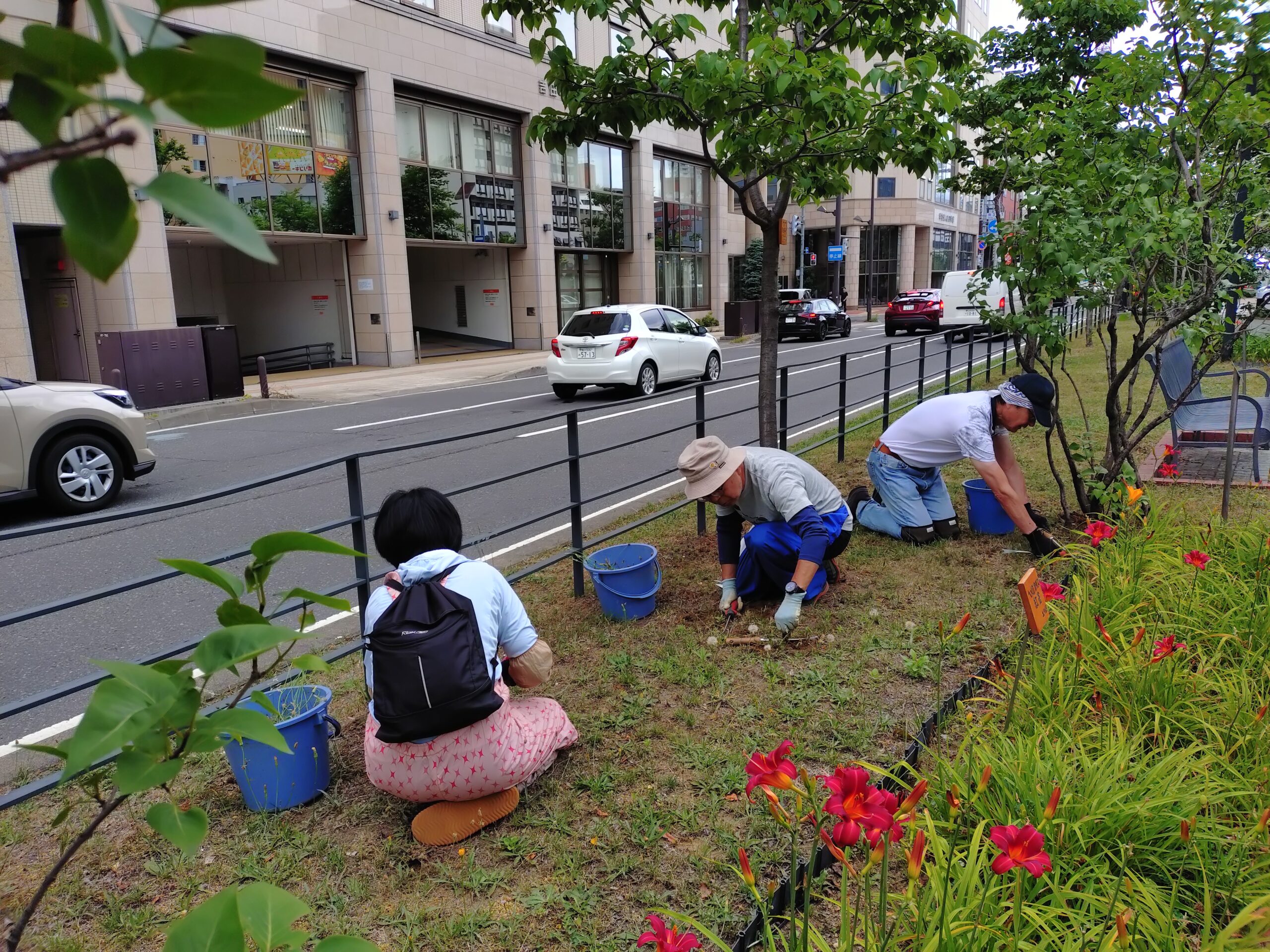 花くらぶでは、狸二条広場やまんなか広場のコンテナや花壇のお手入れもしました。