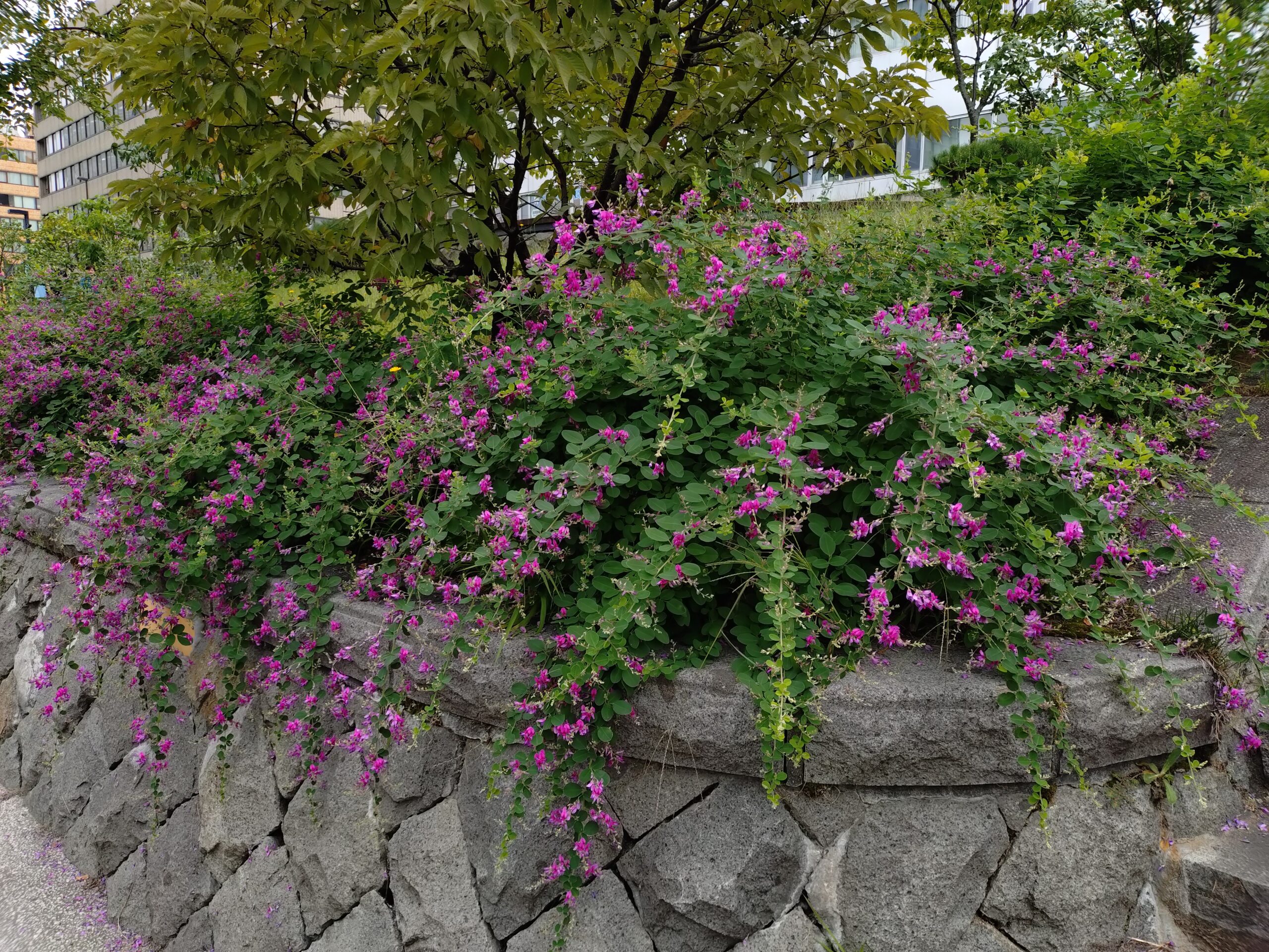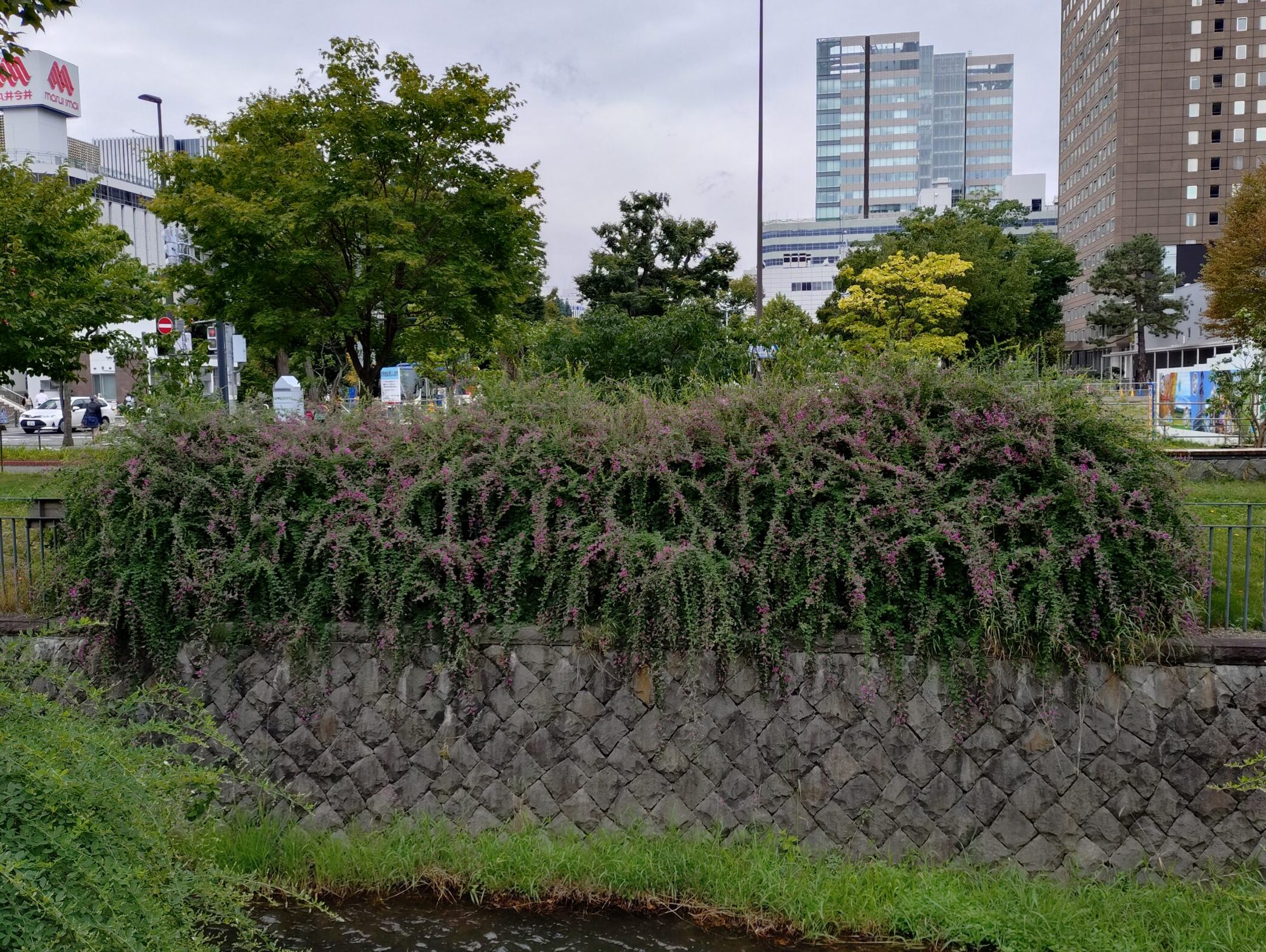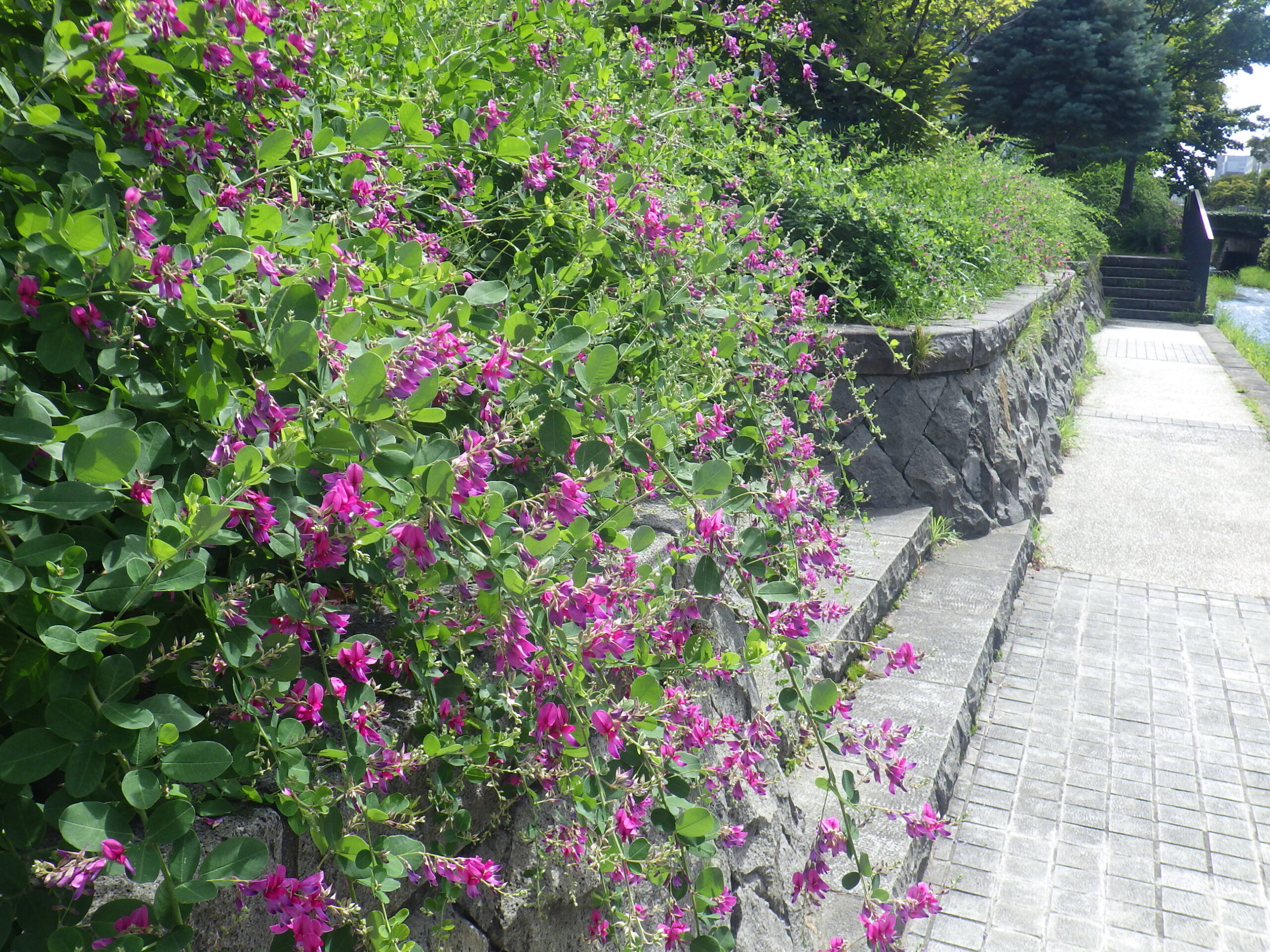 9月9日のハギの開花の様子です。 北1条のハギは少しづつ開花が進んでいます。 東側の下の園路の上や階段横のハギは、大きくなりすぎて通行の支障にならないよう、成長調整をして育てています。 それでも同じ時期にきれいに咲き始めています。 こちらは北1条西側の、成長調整をしていない、川に垂れさがるように育ったハギです。 茎が緑で葉が丸い、ケハギと思われる種類です。 ミヤギノハギの赤や白は少し遅れて開花が進みます。 南1条東側のハギもだんだん色づいてきました。