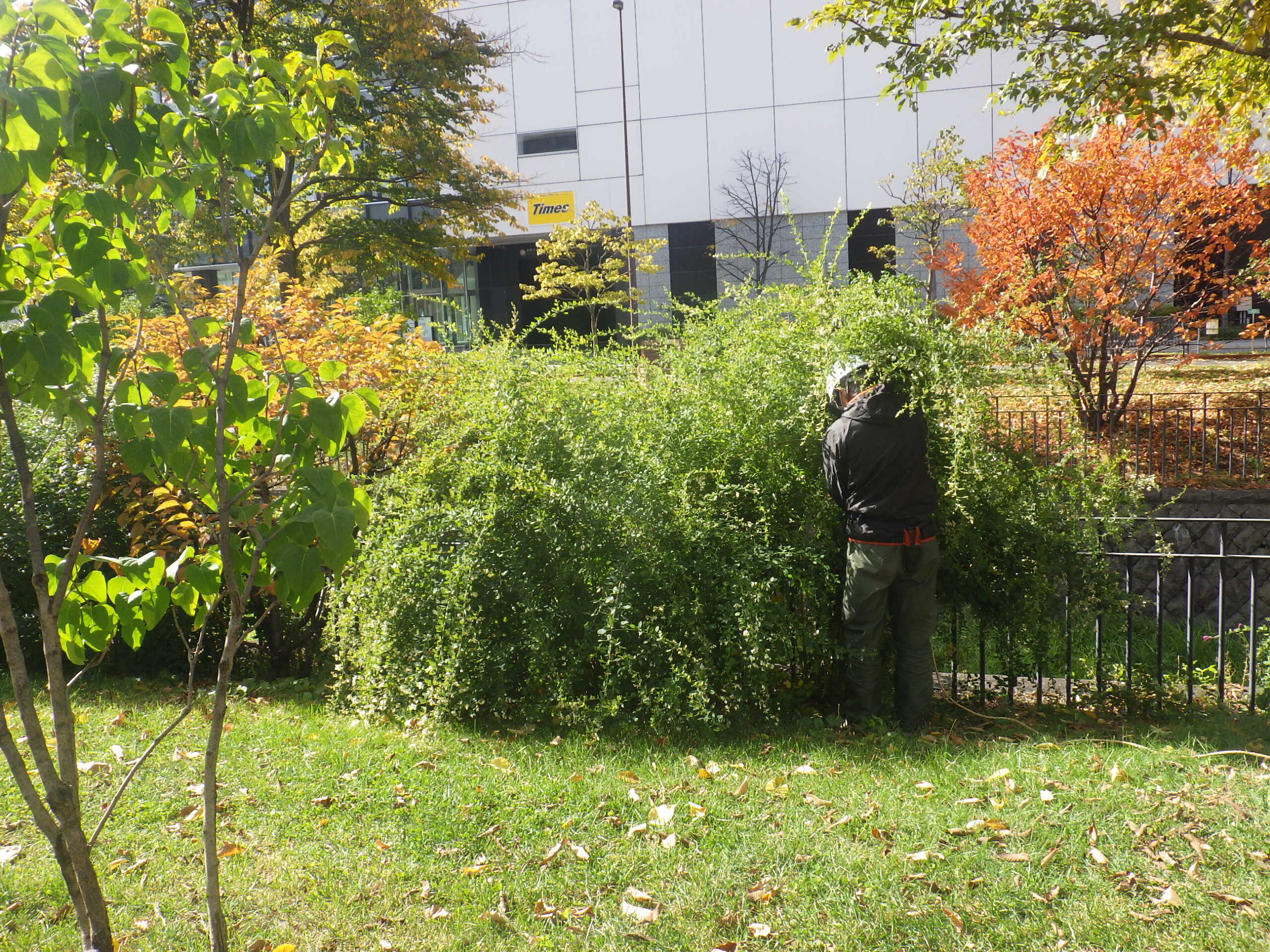 北2条から作業開始、大きく育ったハギは作業員さんの背丈ほどあります。