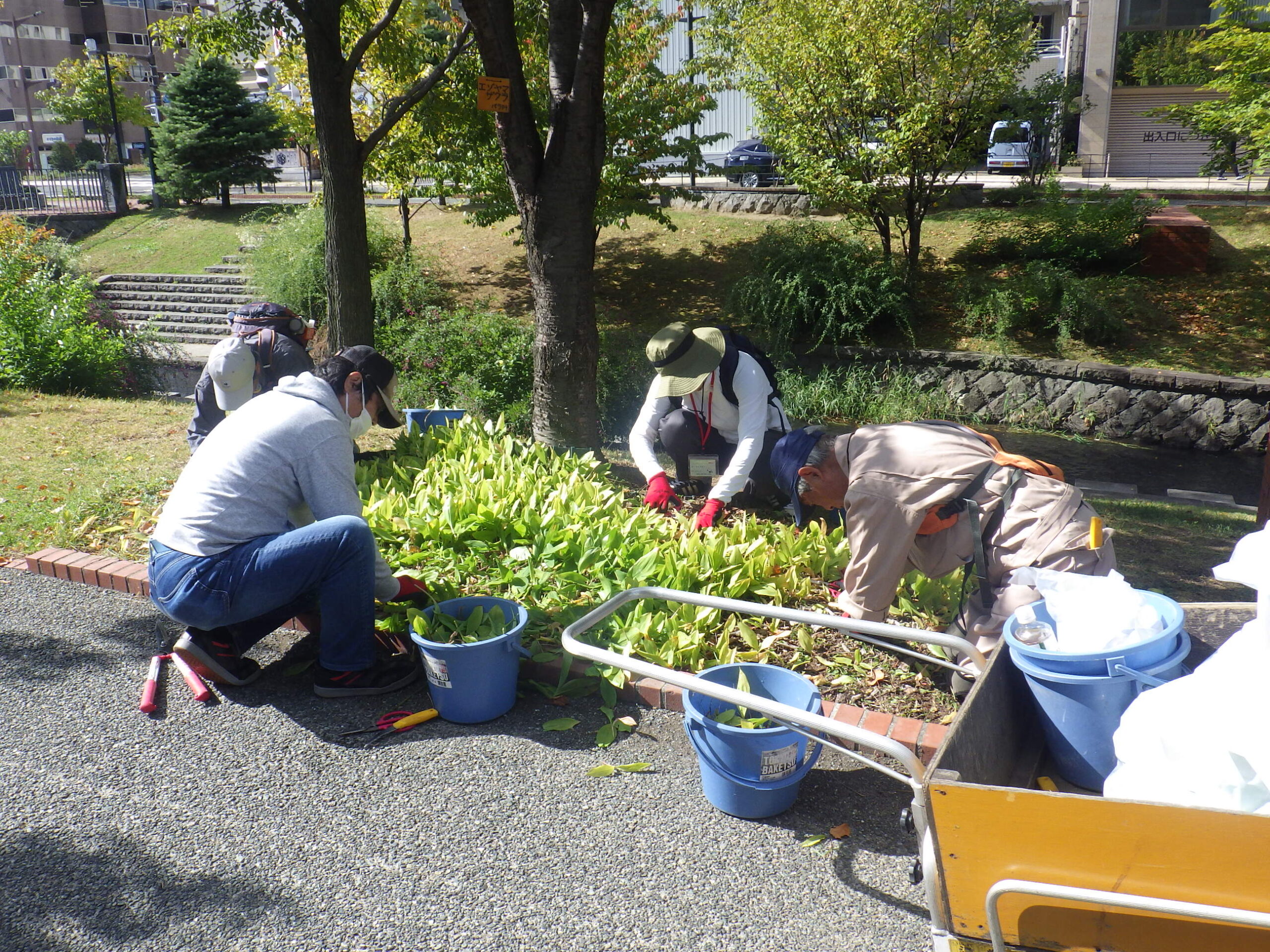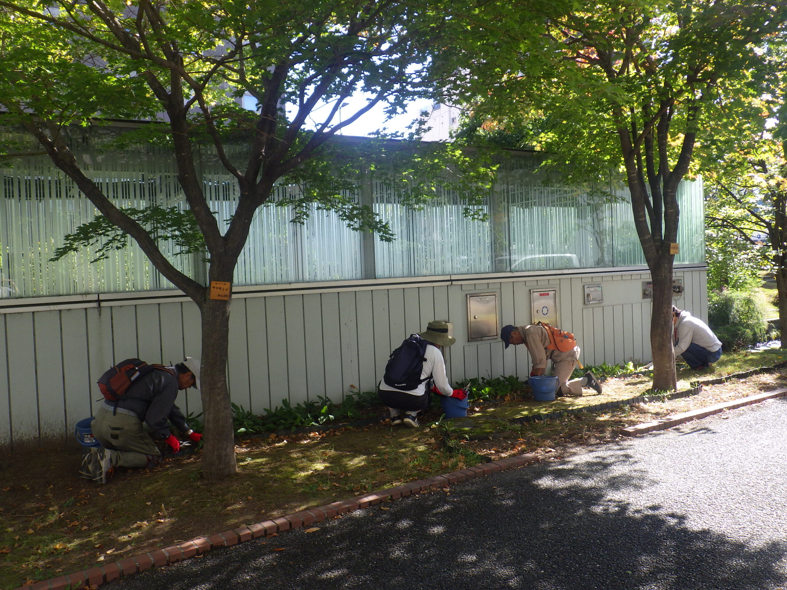 10月のはじめ、1日水曜日、まだ緑がたくさん残る中、お助け隊は花壇と円形ますの除草です。