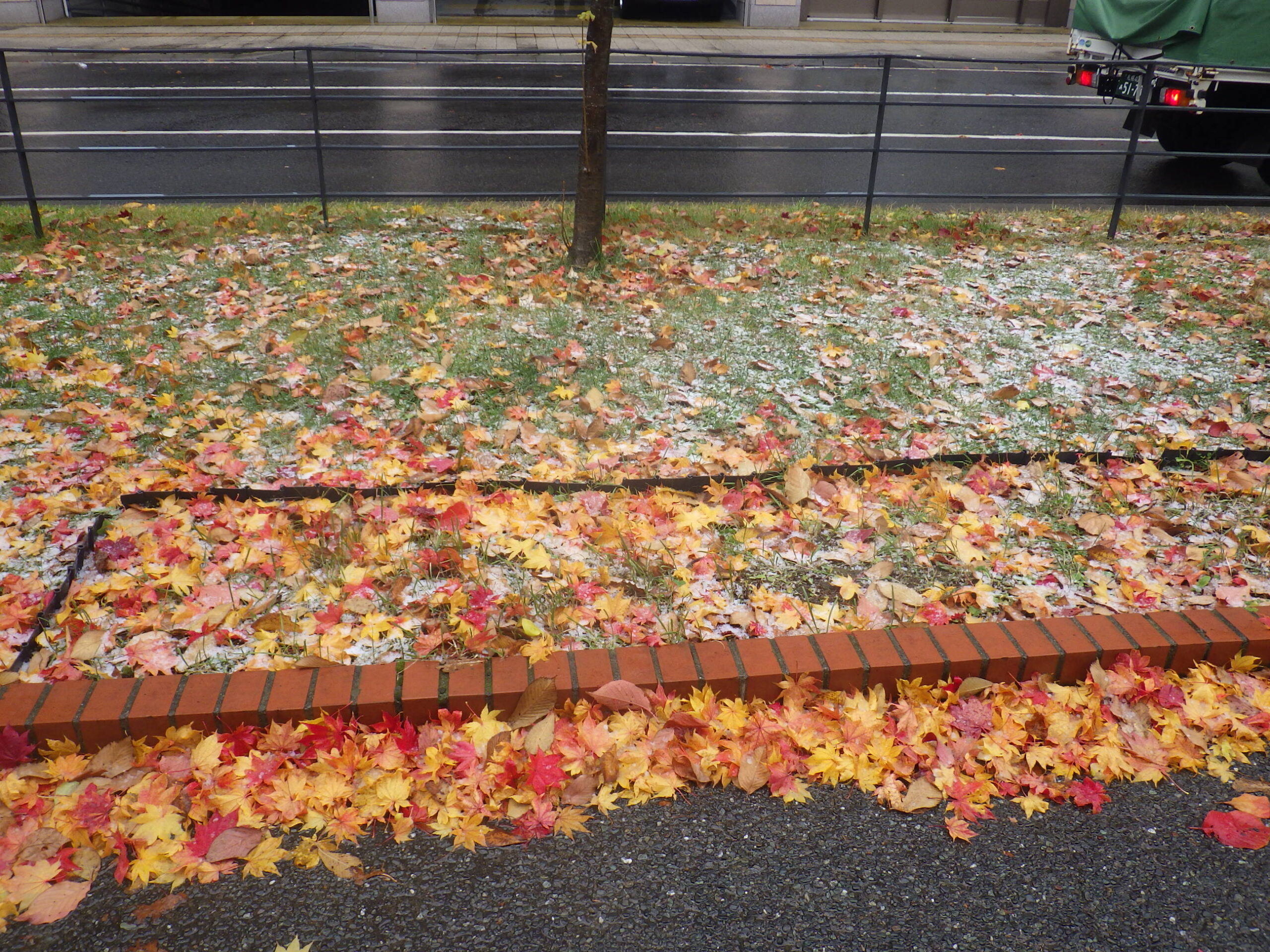 そして今日、南2条です。雪の上にも少しつづ落ち葉が落ちています。