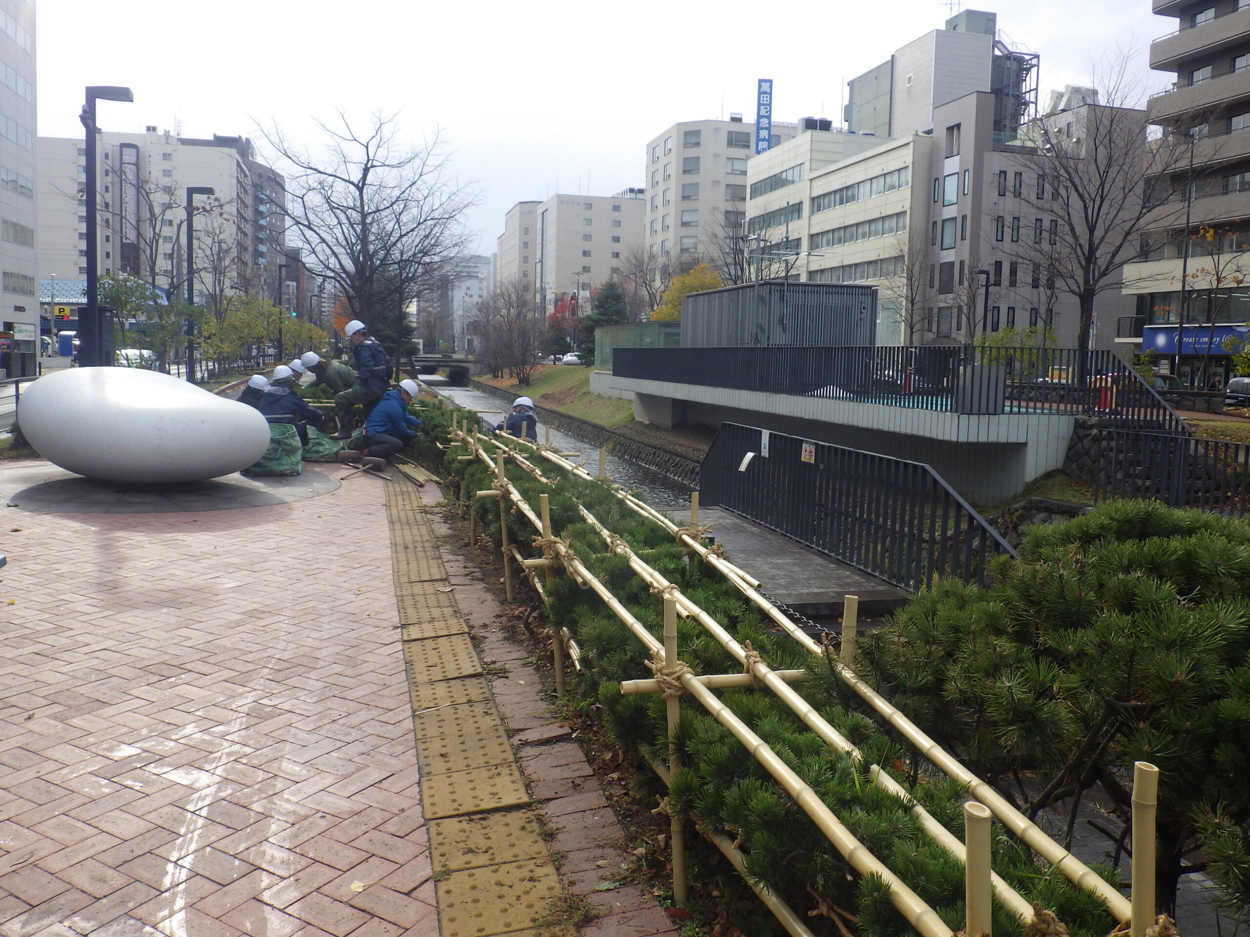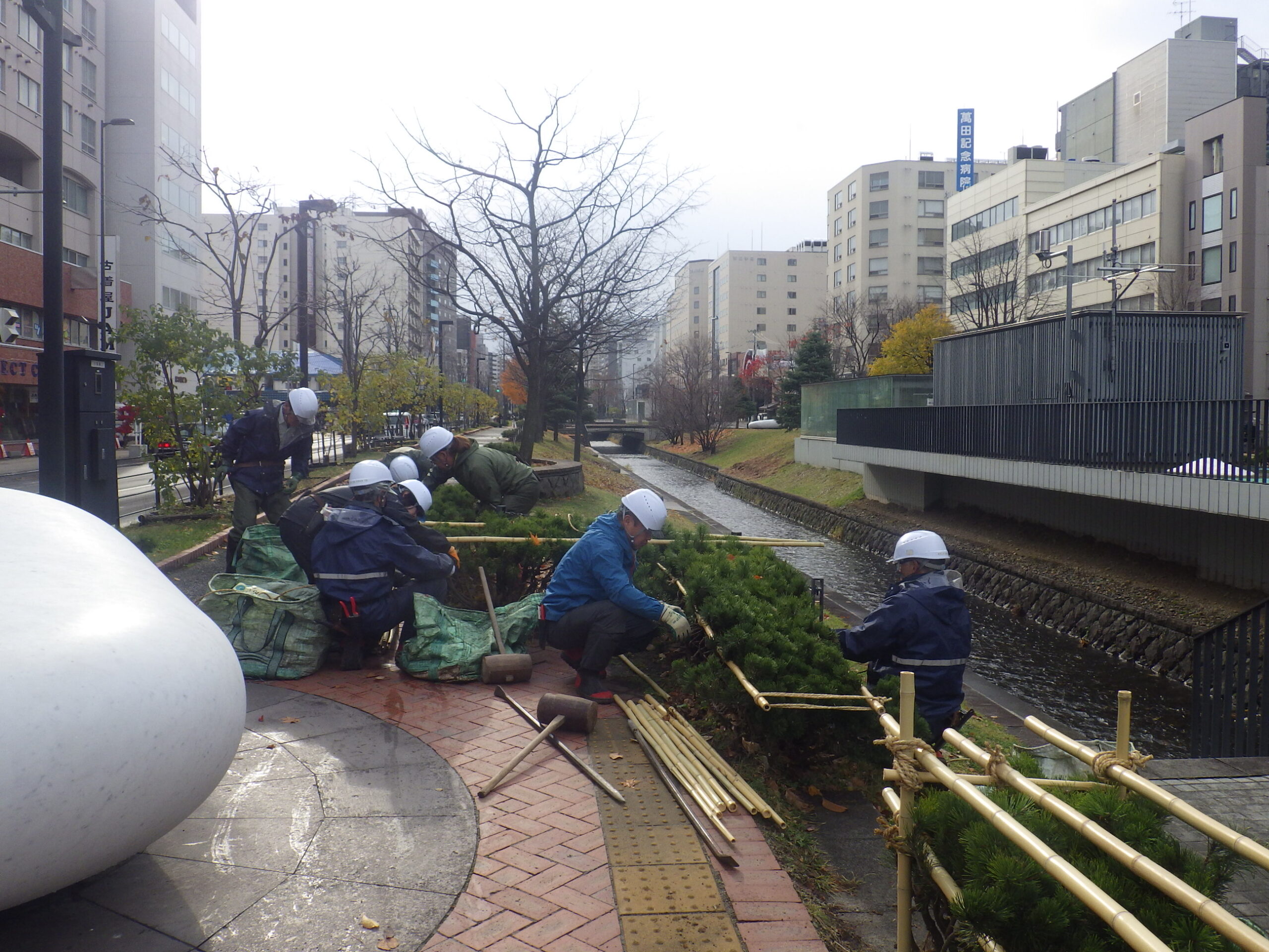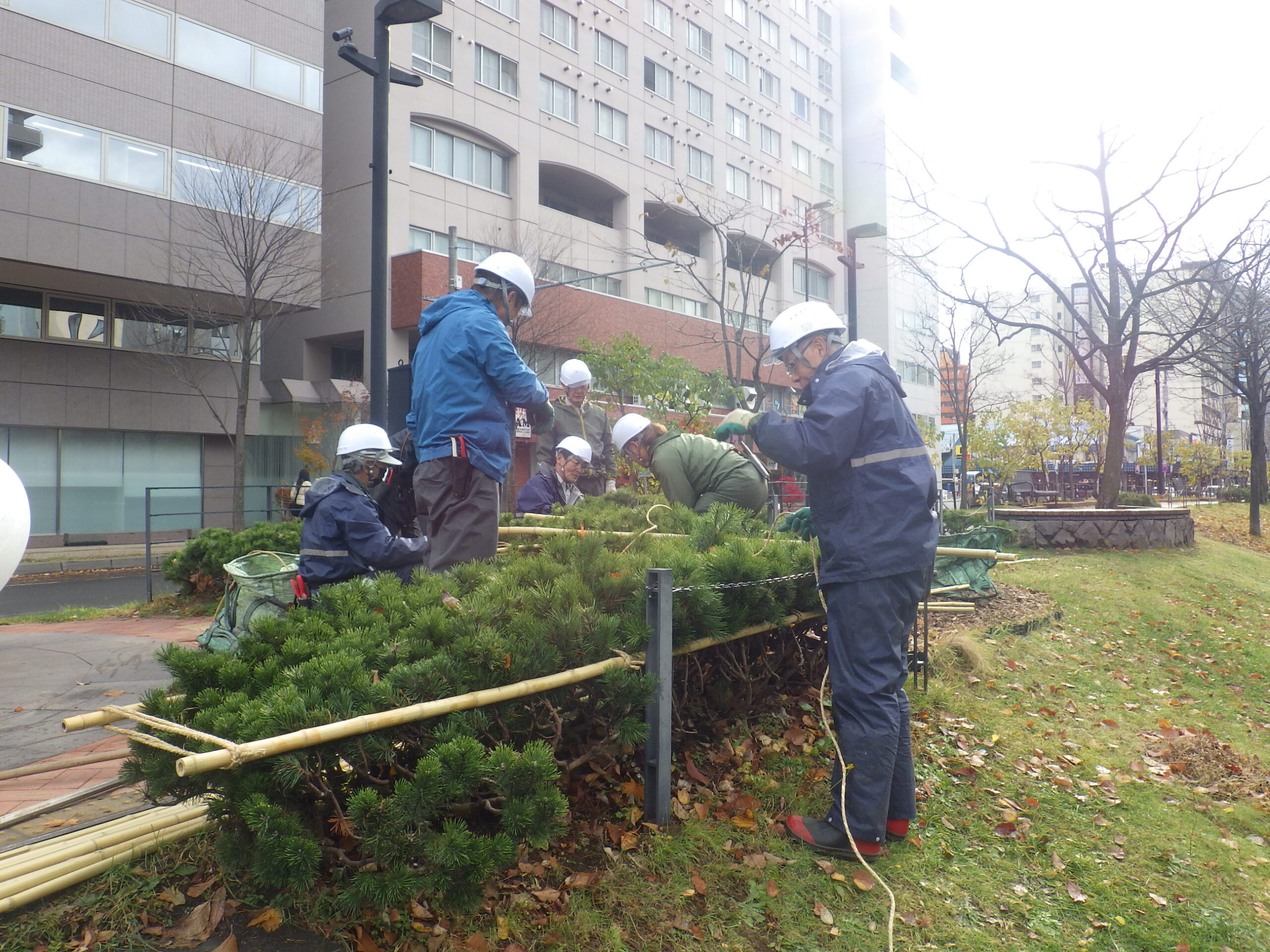 11月10日月曜日、創成川公園でも樹木の冬囲いが始まりました。 積もった雪は融けましたが、寒さが残る今日の園内です。 まずはモンタナマツの冬囲いから始まりました。 モンタナマツは雪の重さでつぶれてしまうので、危ない場所ではしっかりと竹を組んで保護します。 この後、ライラックやニオイヒバ、シモツケなども順次冬囲いしていきます。