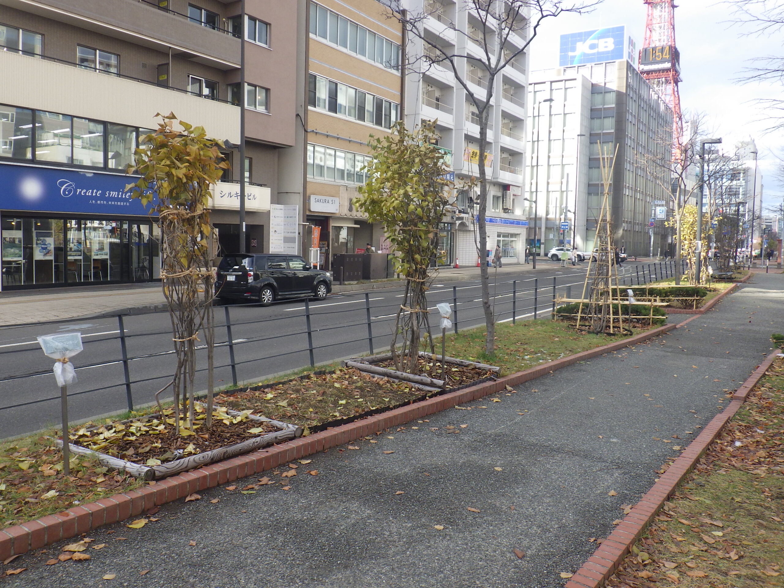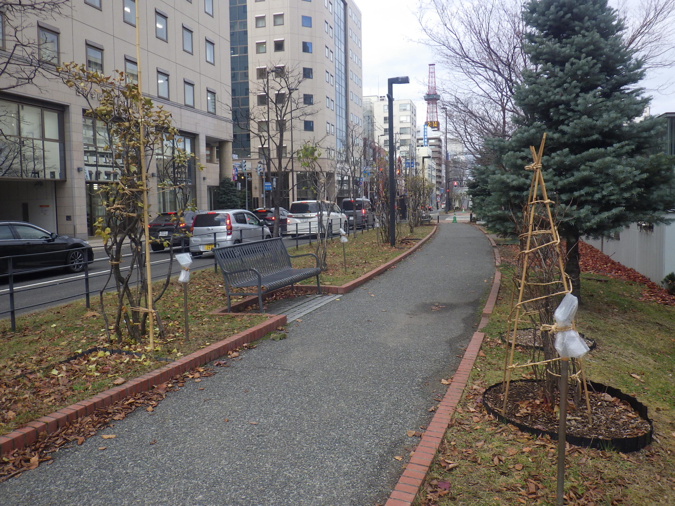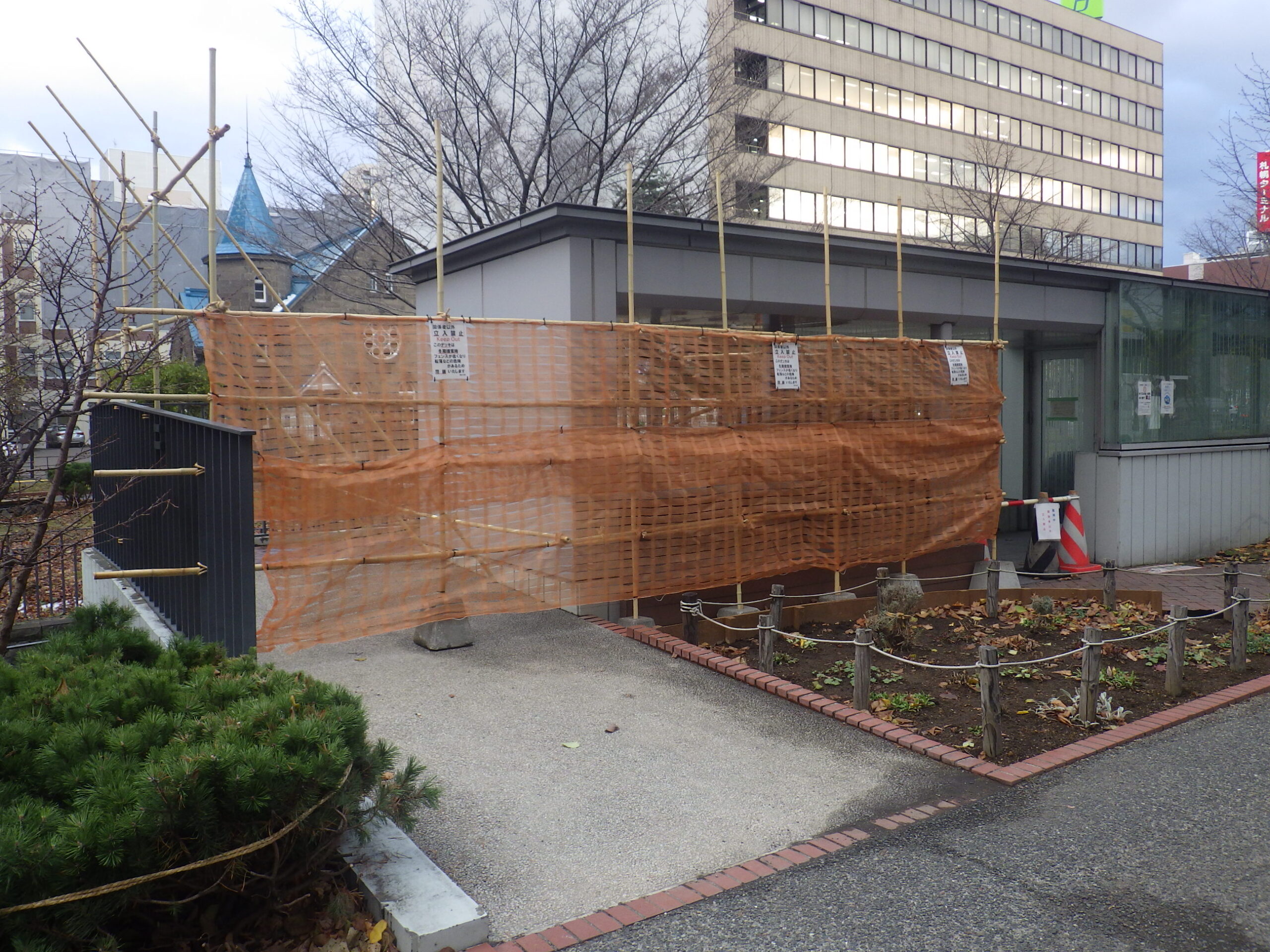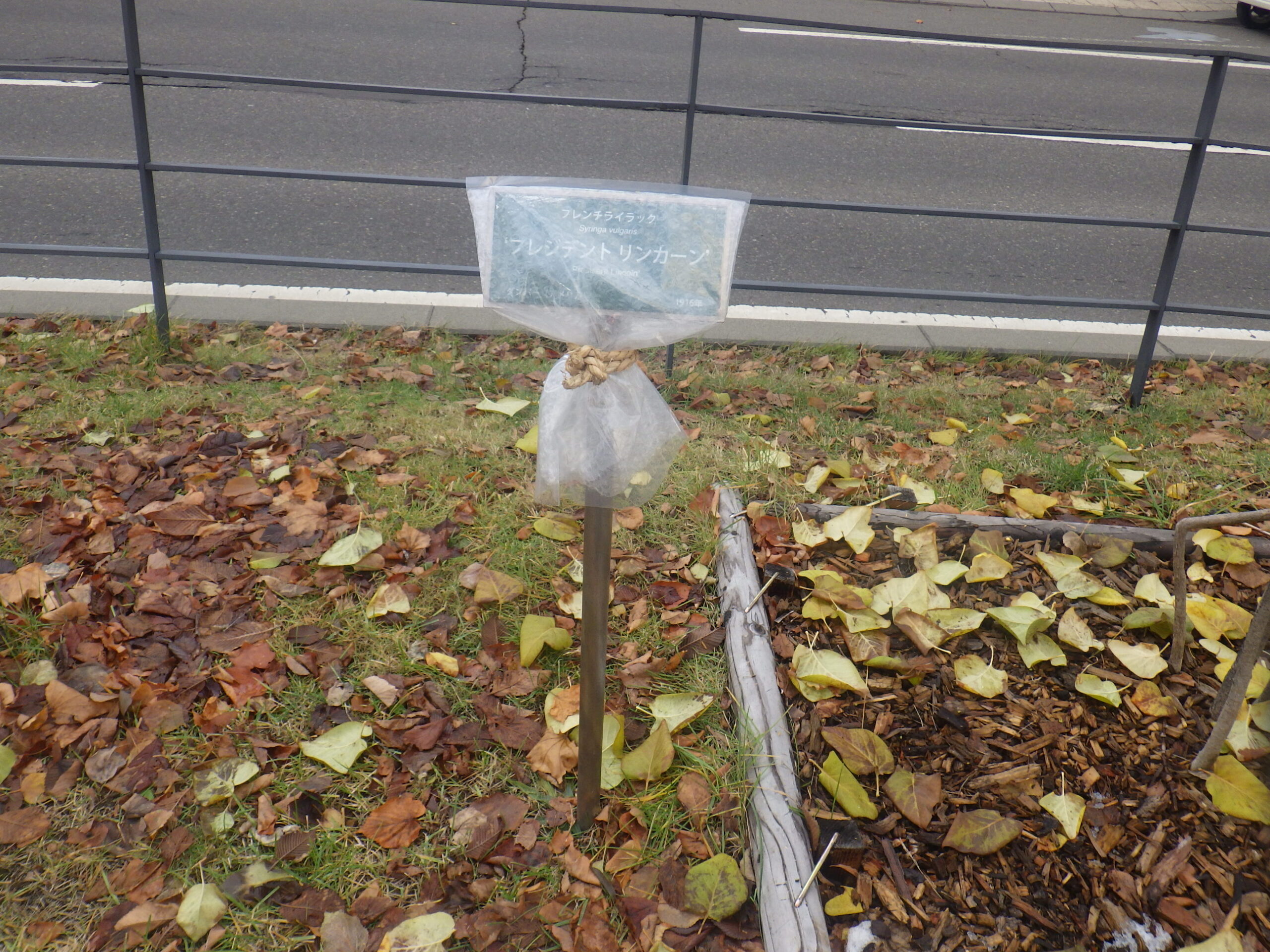 11月20日木曜日、昨日、一昨日と降った雪も融けた園内。 ライラックやモンタナマツなどの樹木の冬囲いが終わりました。 ライラックの樹名板も保護して雪に備えます。 川の上のデッキ部分は、積雪によりフェンスが低くなって危険を伴いますので、冬期間立入禁止となります。 この後、階段や芝生斜面など積雪により危険が伴う恐れのあるところを、順次、閉鎖や注意喚起の看板設置などを行っていきます。 公園内は、少しの積雪でも滑る所がありますので、気を付けてご利用ください。