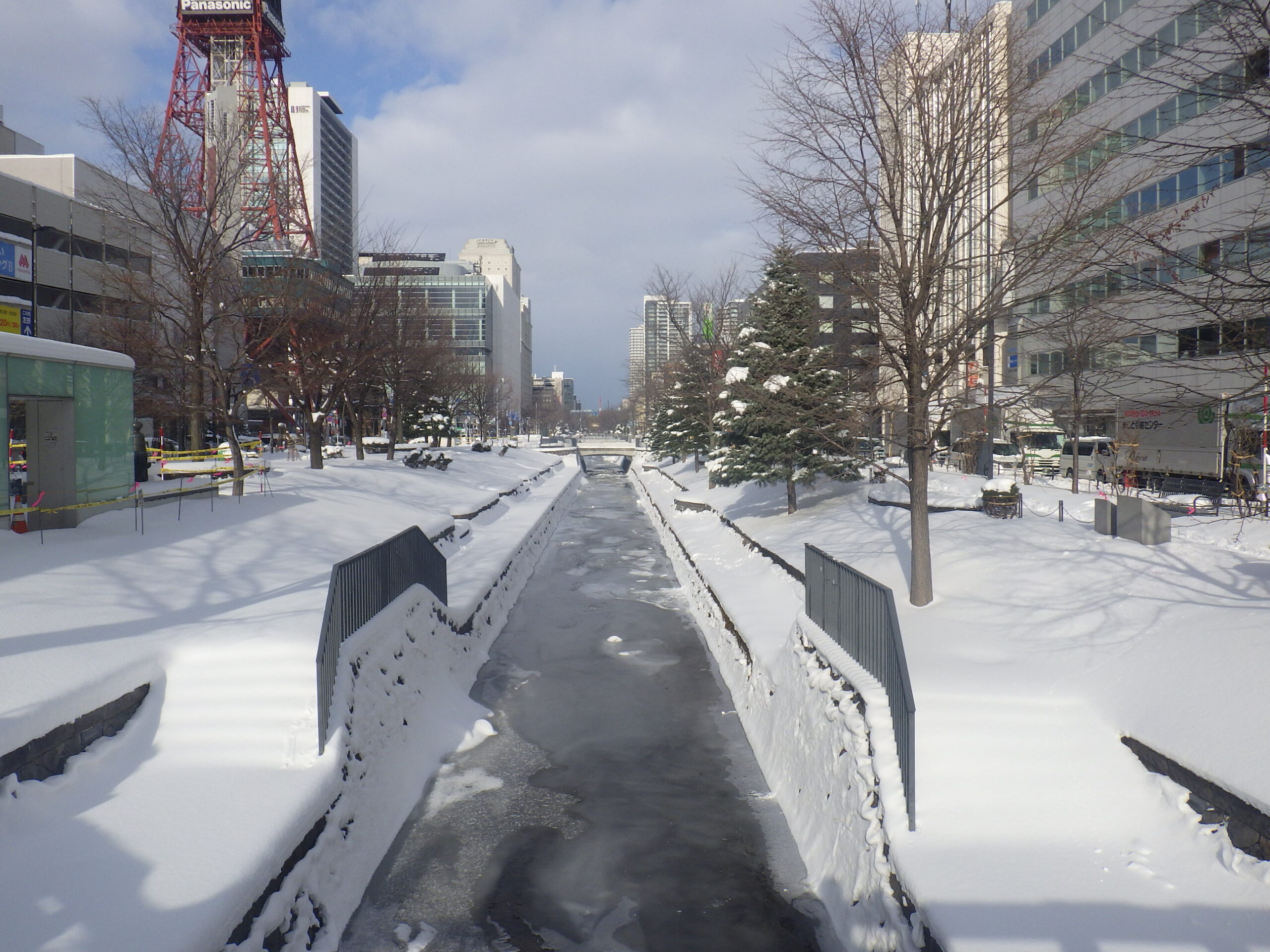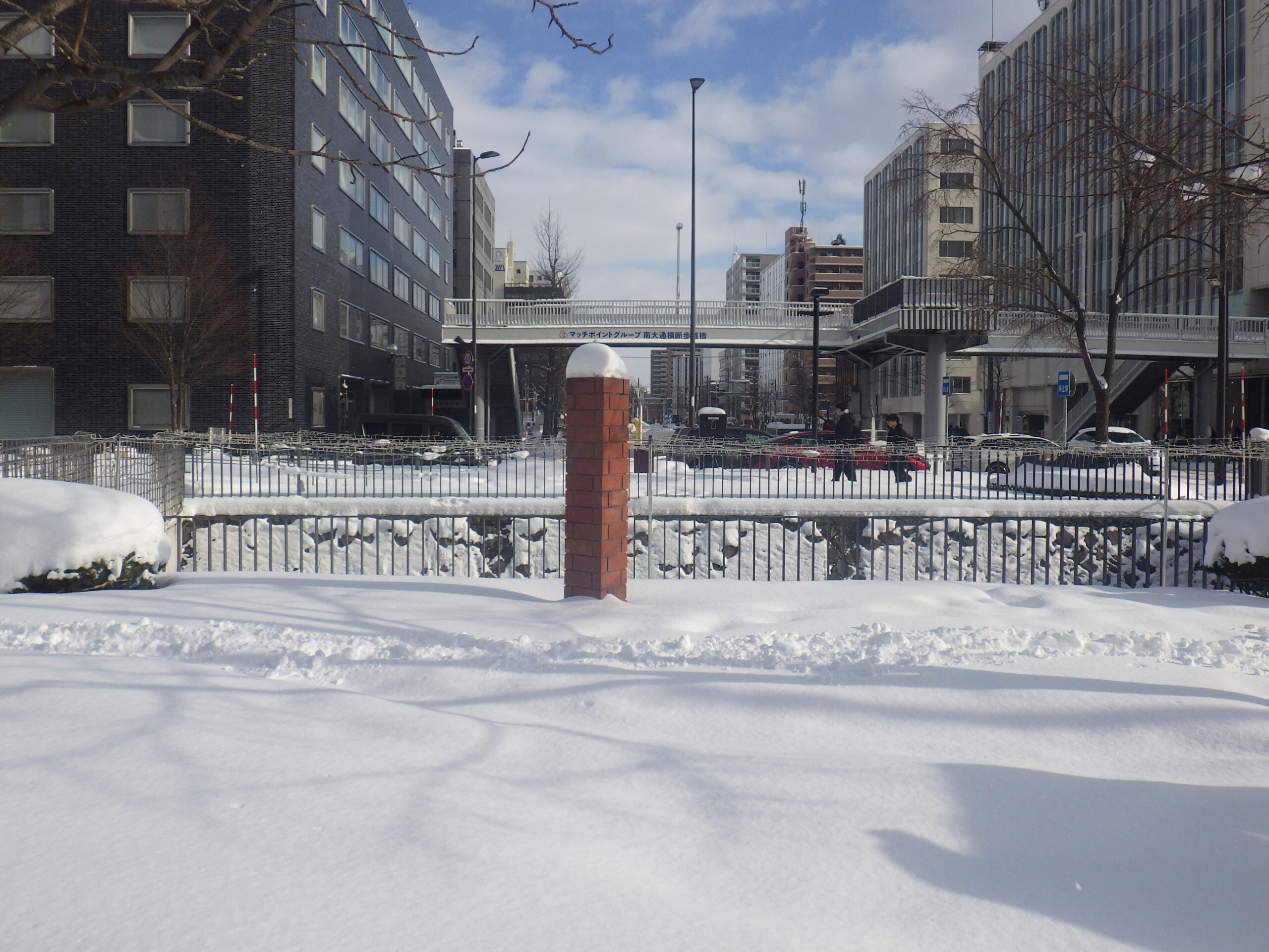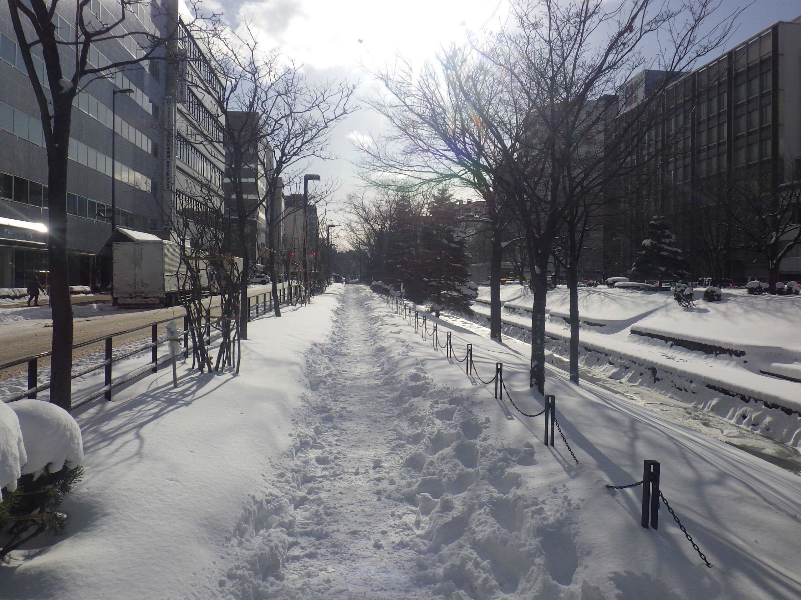 南1条では、南1条南2条と横断歩道のある東側の園路を除雪し、西側は閉鎖しています。
