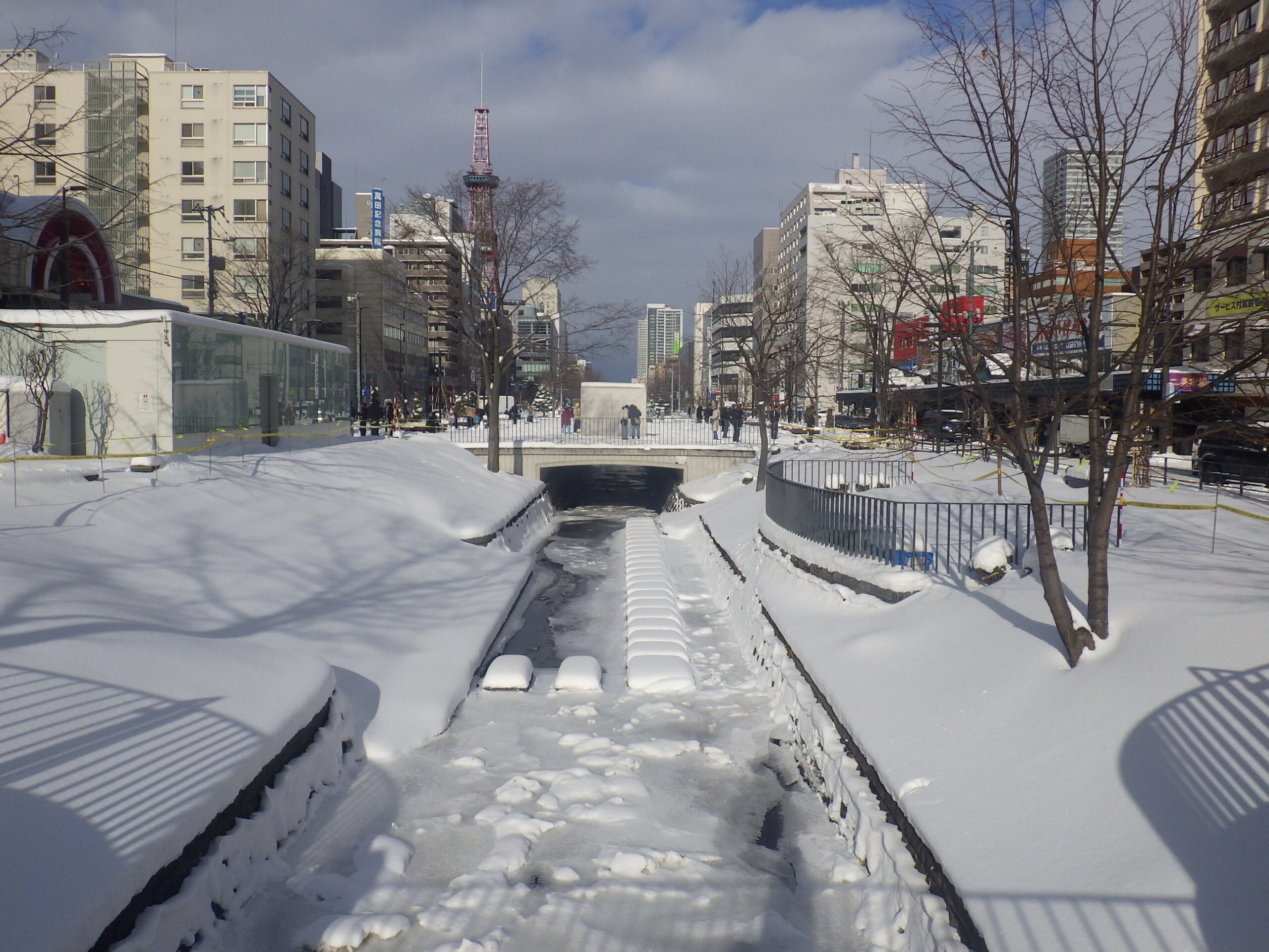 南4条では、アンダーパスの「創成トンネル」の避難口のある西側を除雪し、東側の園路を閉鎖しています。