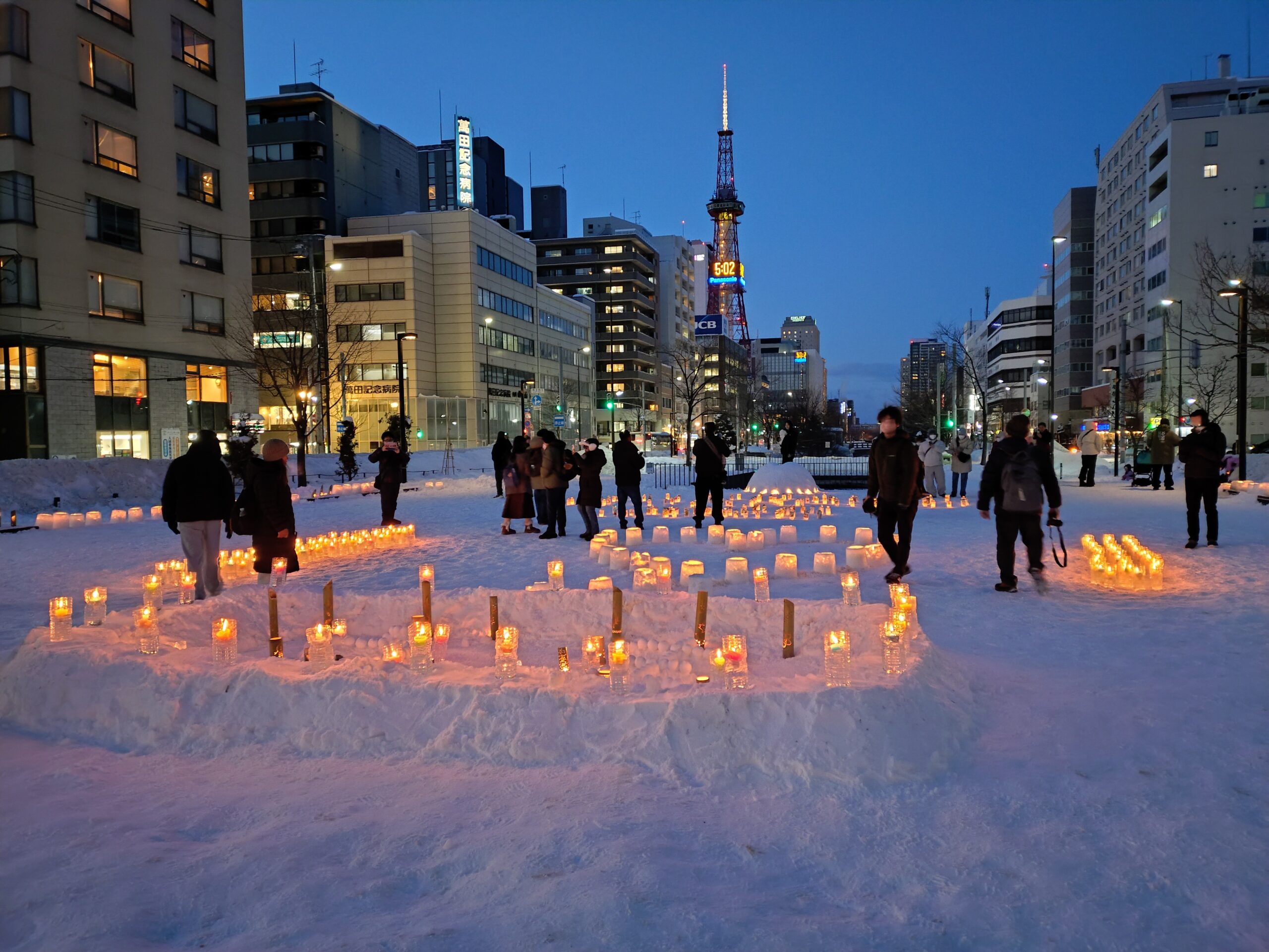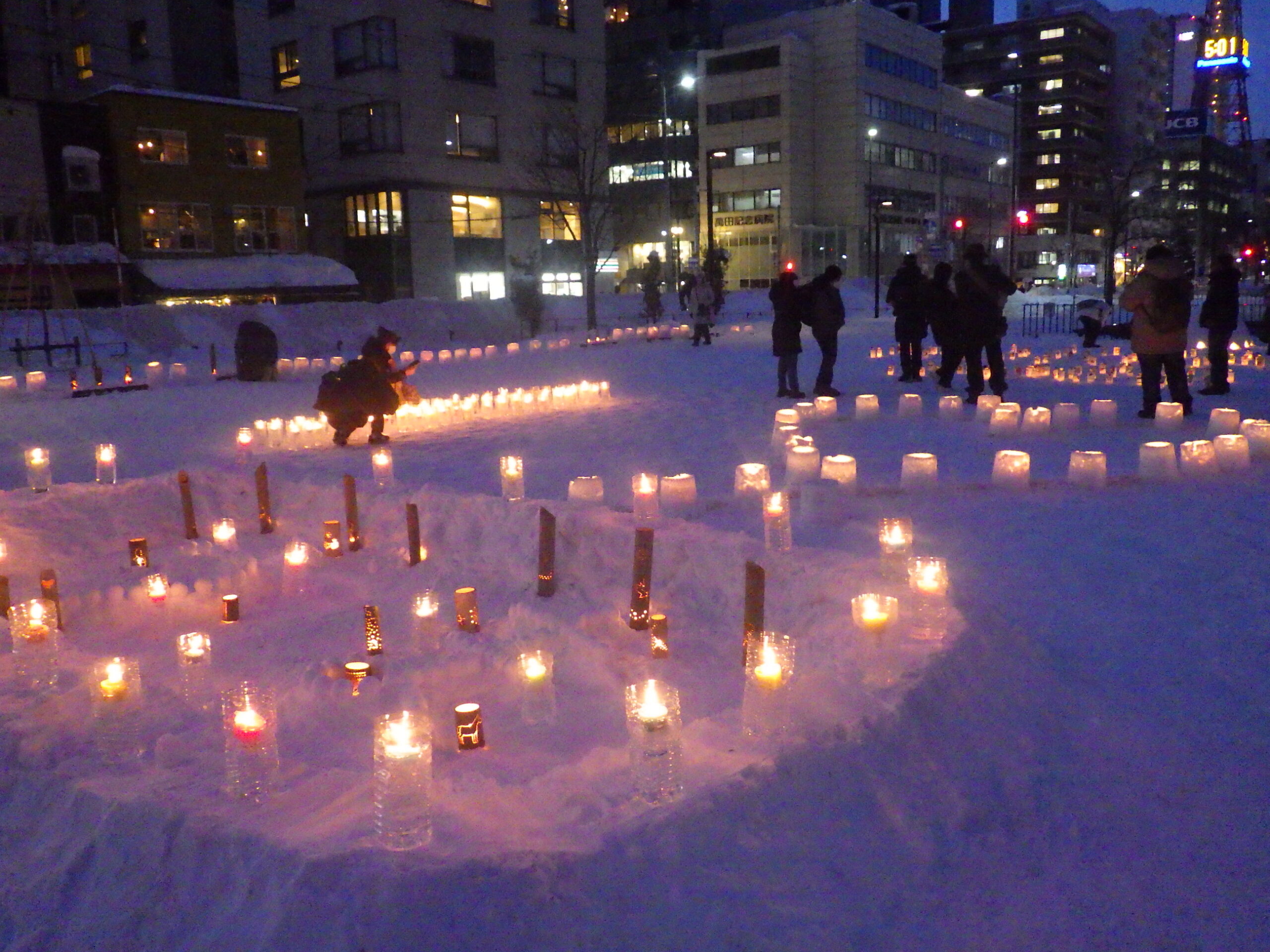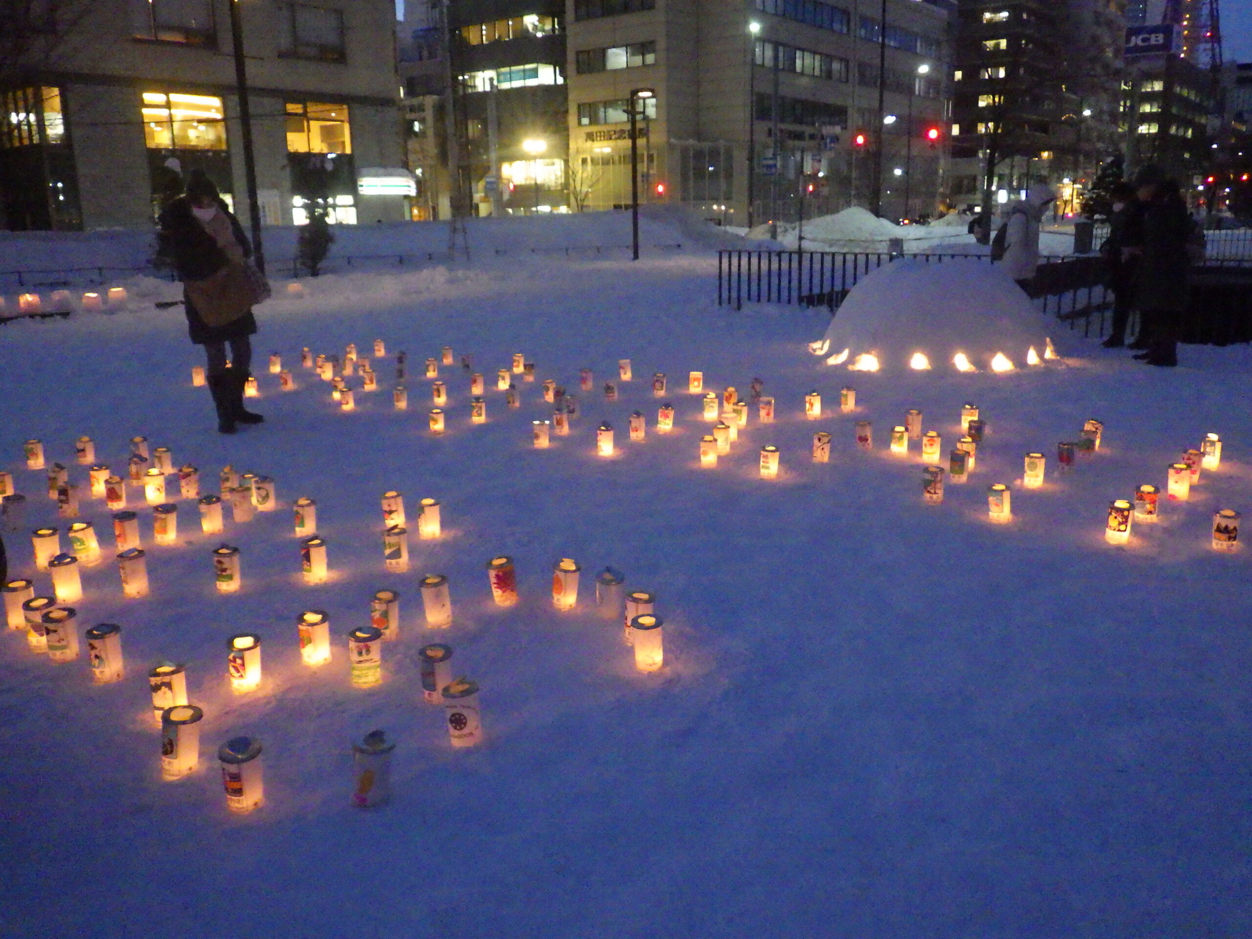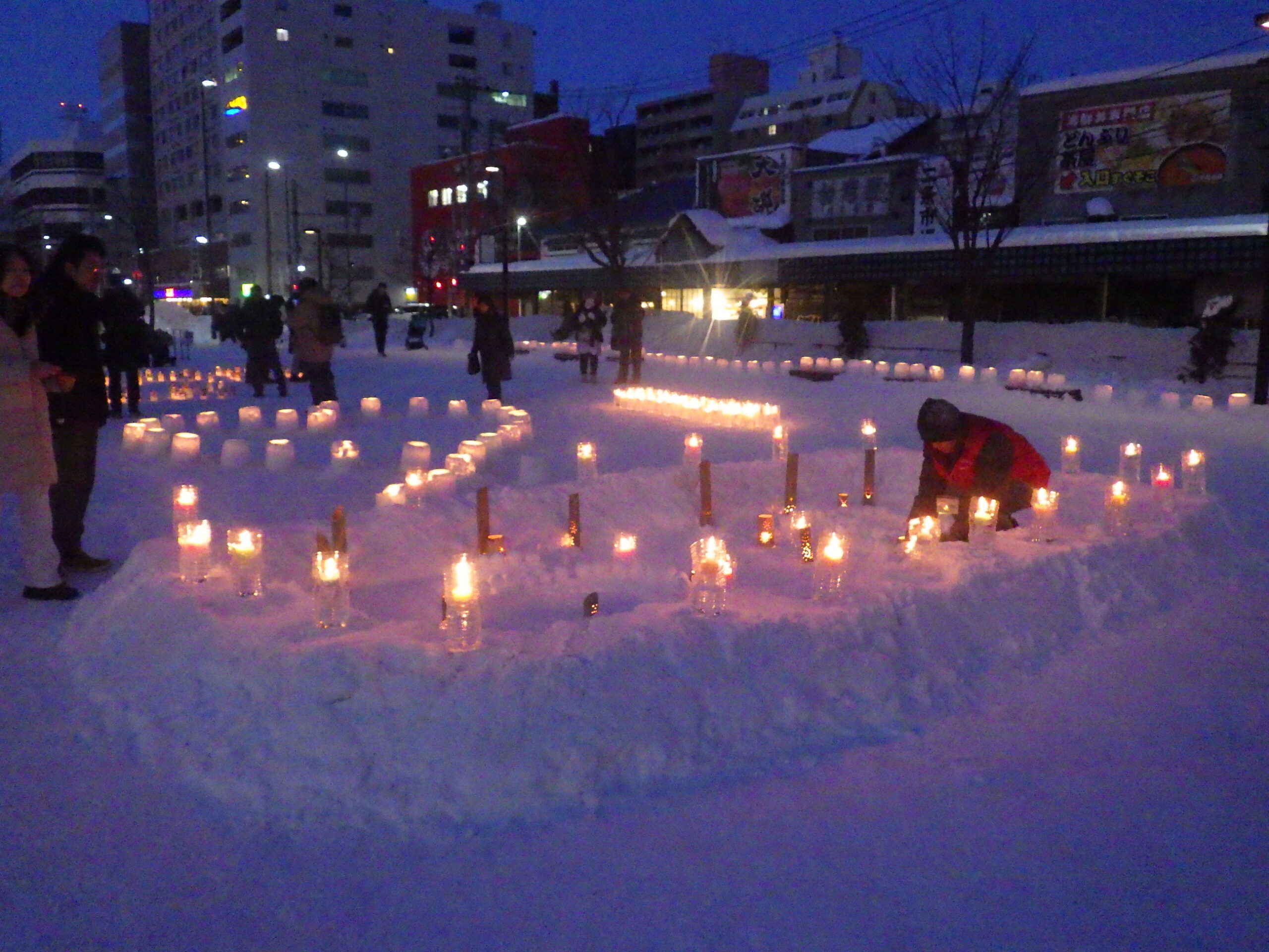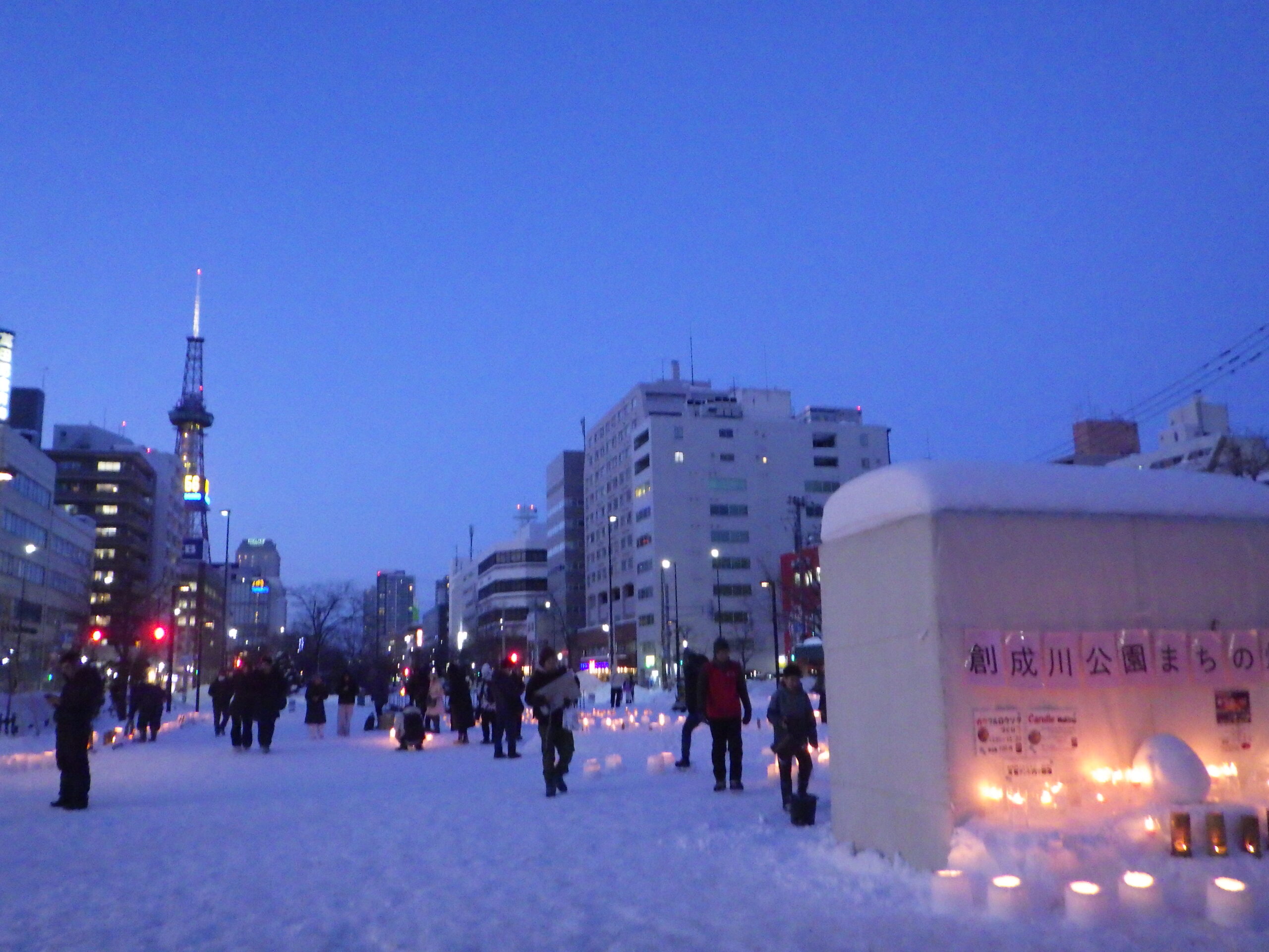 スノーキャンドルを作ったのは、公園ボランティアの「お助け隊」、その他の大通・創成川公園の公園ボランティアのみなさん、企業ボランティアの「JCOM」さん、市民団体「北海道点灯虫の会」さん、地域の「狸二条広場運営協議会」さん、そして管理事務所スタッフ、と一般参加者のみなさんです。