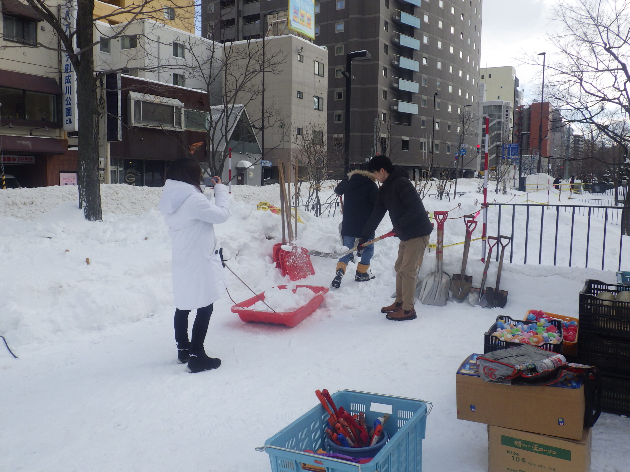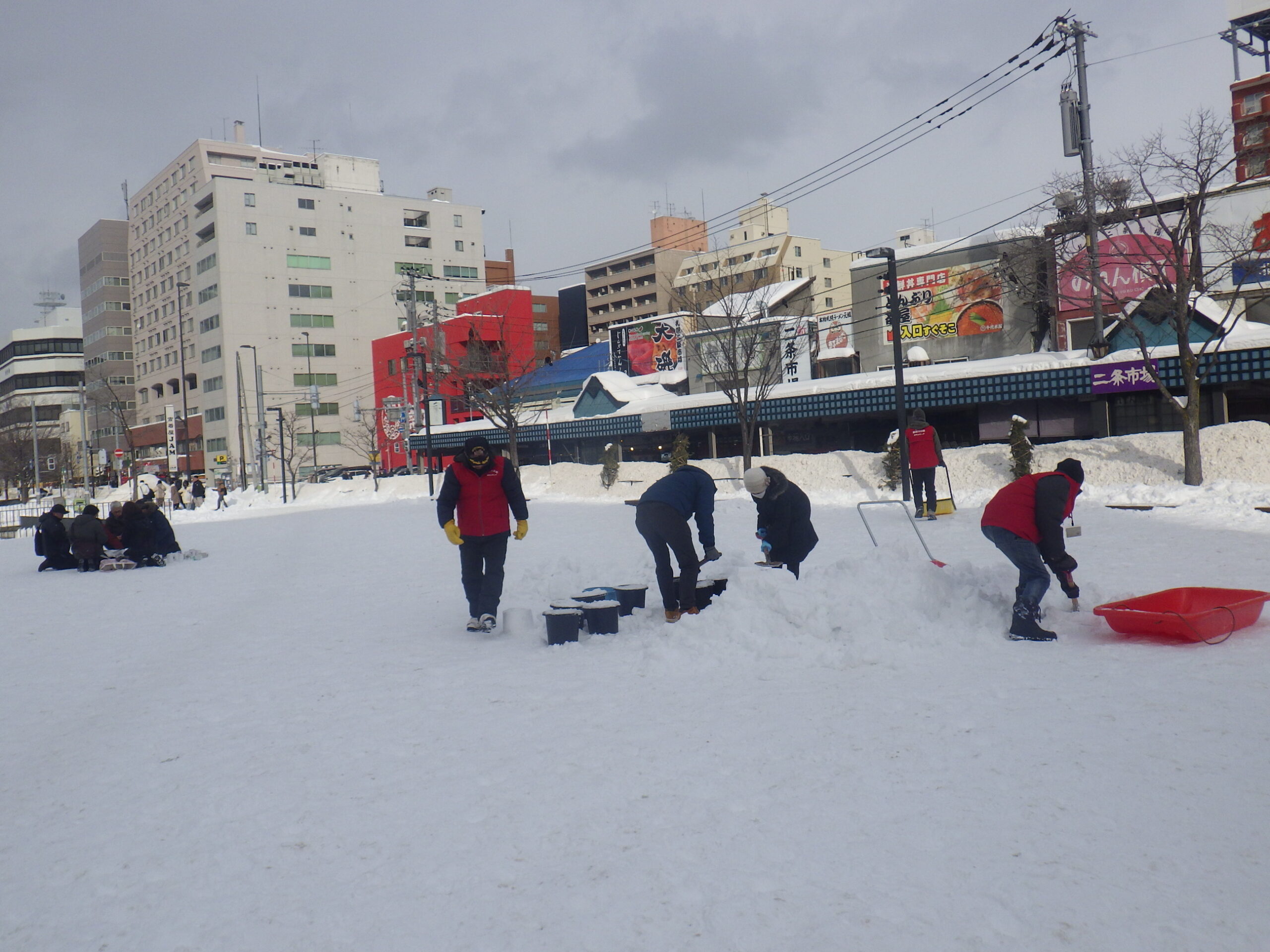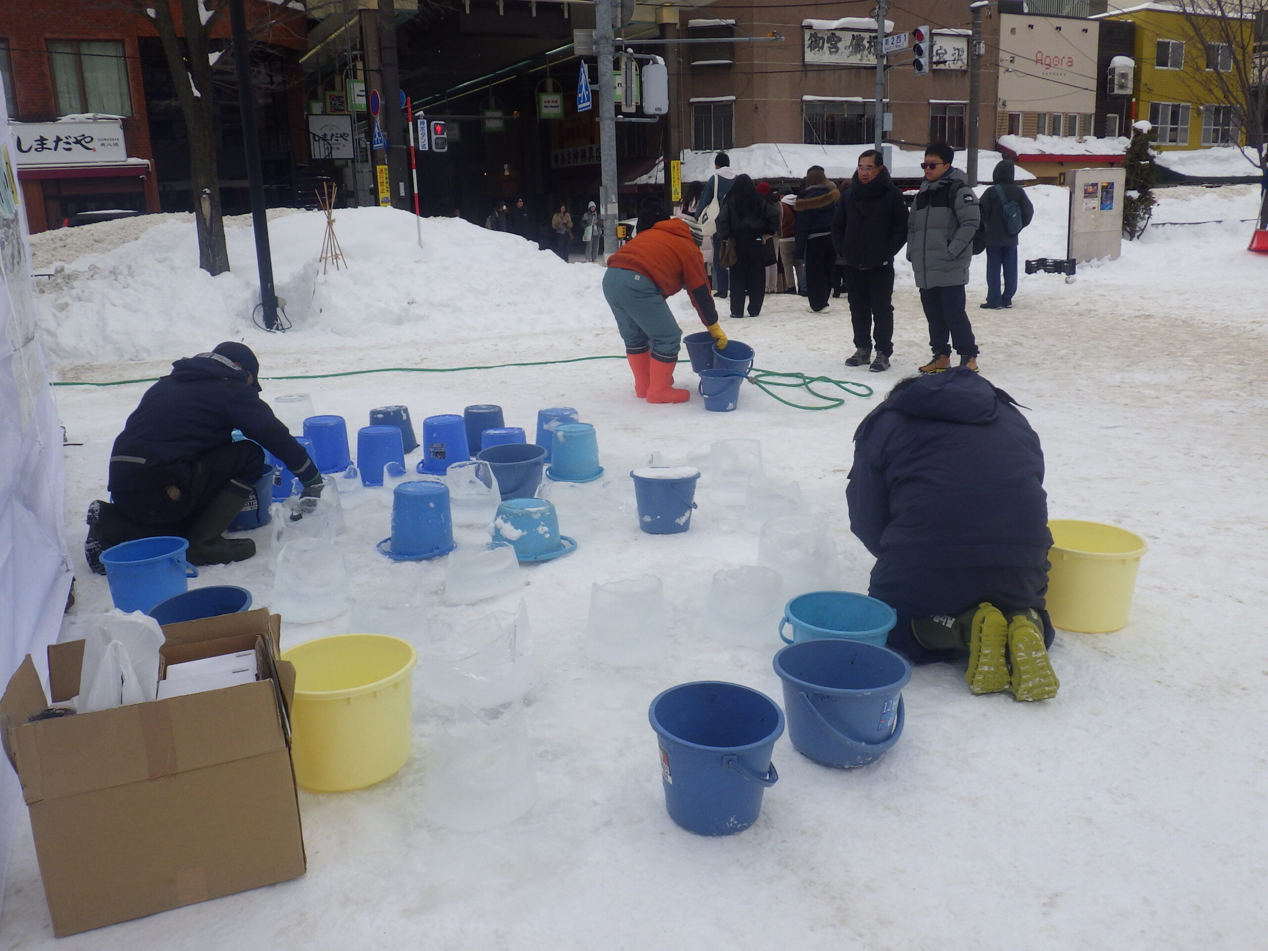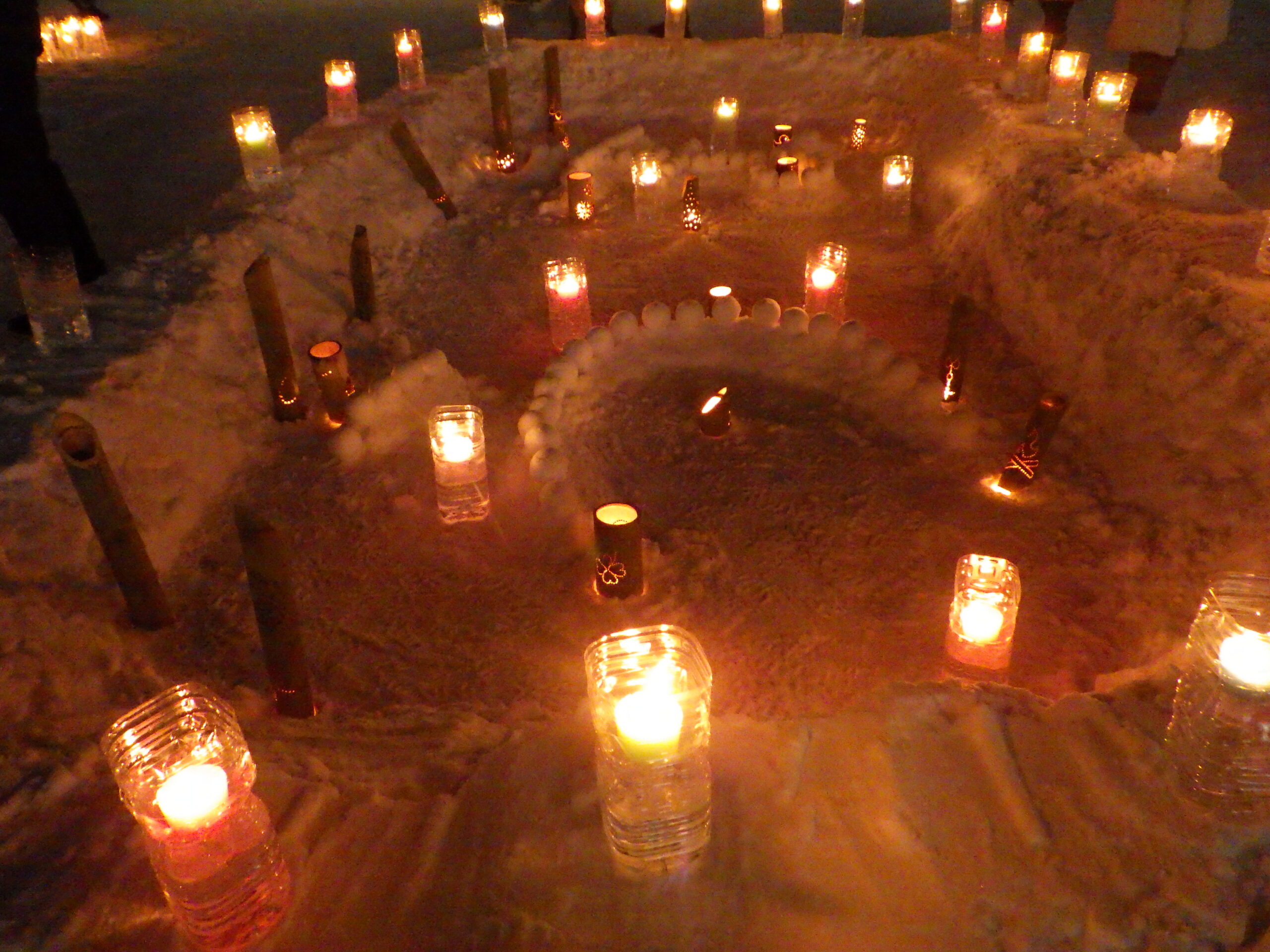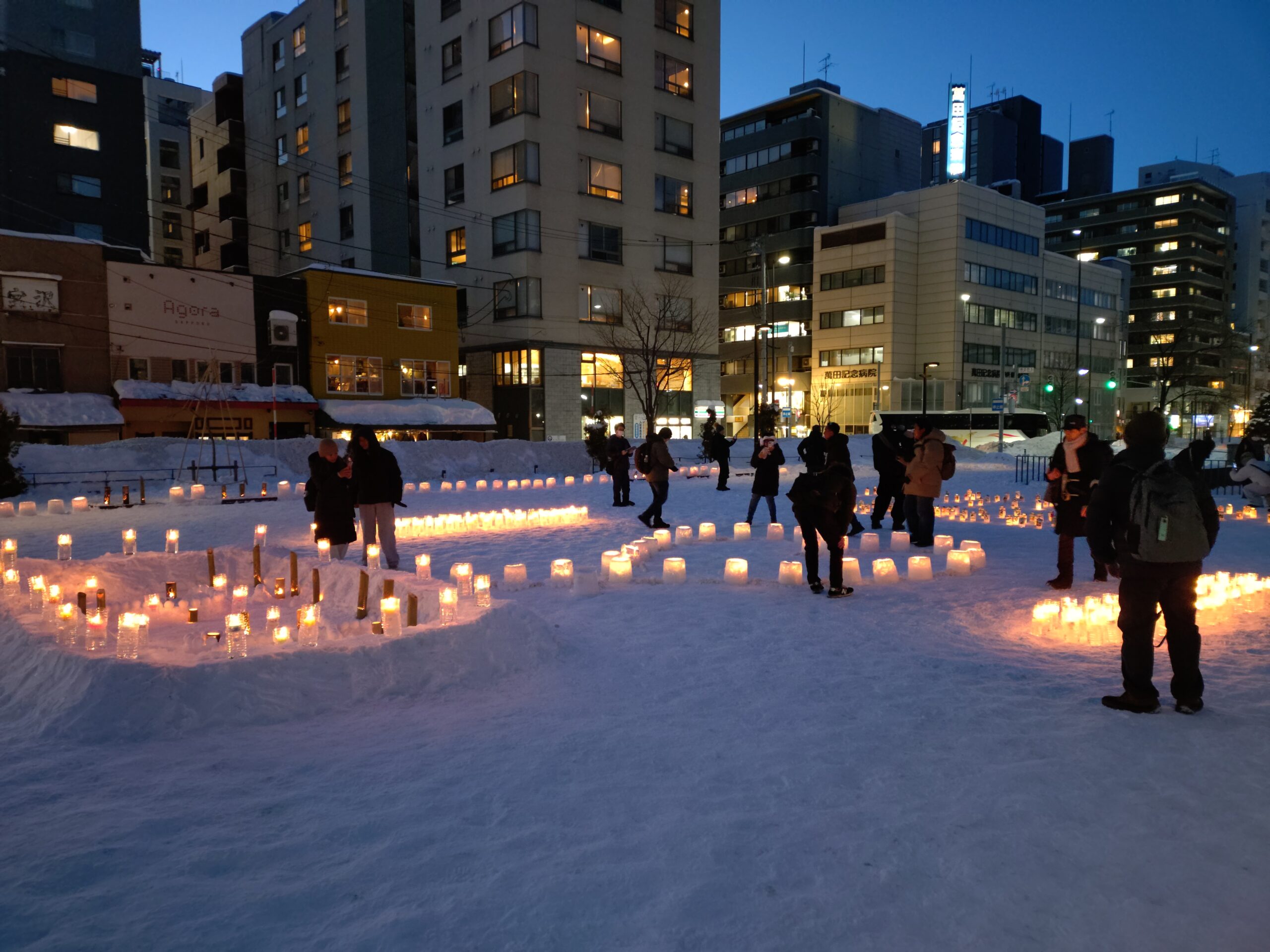 スノーキャンドルを作ったのは、公園ボランティアの「お助け隊」、その他の大通・創成川公園の公園ボランティアのみなさん、企業ボランティアの「JCOM」さん、市民団体「北海道点灯虫の会」さん、地域の「狸二条広場運営協議会」さん、そして管理事務所スタッフ、と一般参加者のみなさんです。