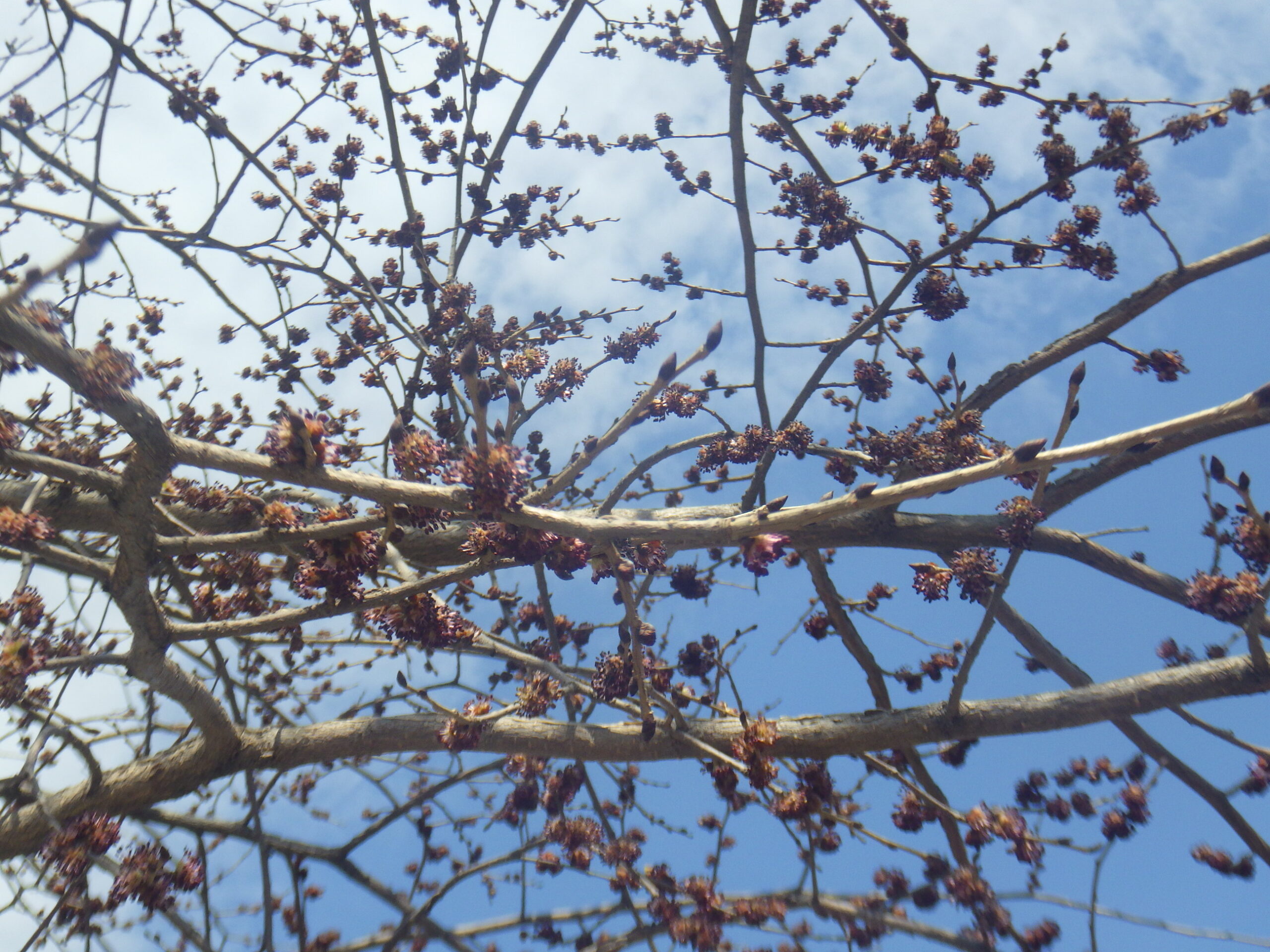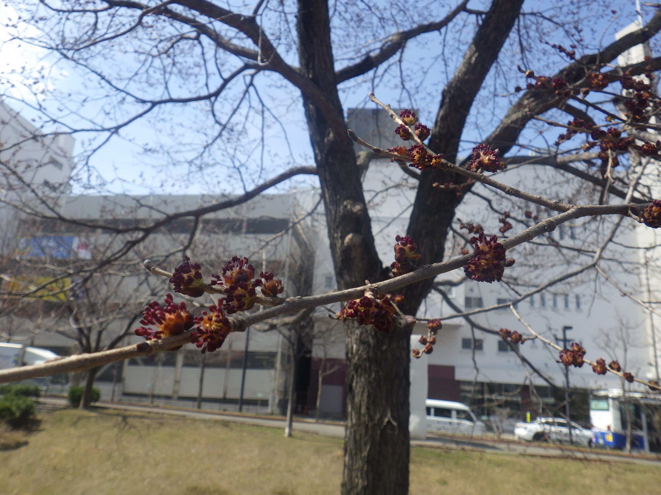 4月6日月曜日、新年度を迎え、公園内のライラックやモンタナマツの冬囲いも外されました。 園内に約30本、交差点の円形ますを含めて約50本が植えられているハルニレは、春一番の花が咲きました。 ハルニレの木の上の方につく、控えめな色合いの小さな花です。 上を見上げてよく見ないとわからない花ですが、カラスはお花見を楽しんでいるようです。
