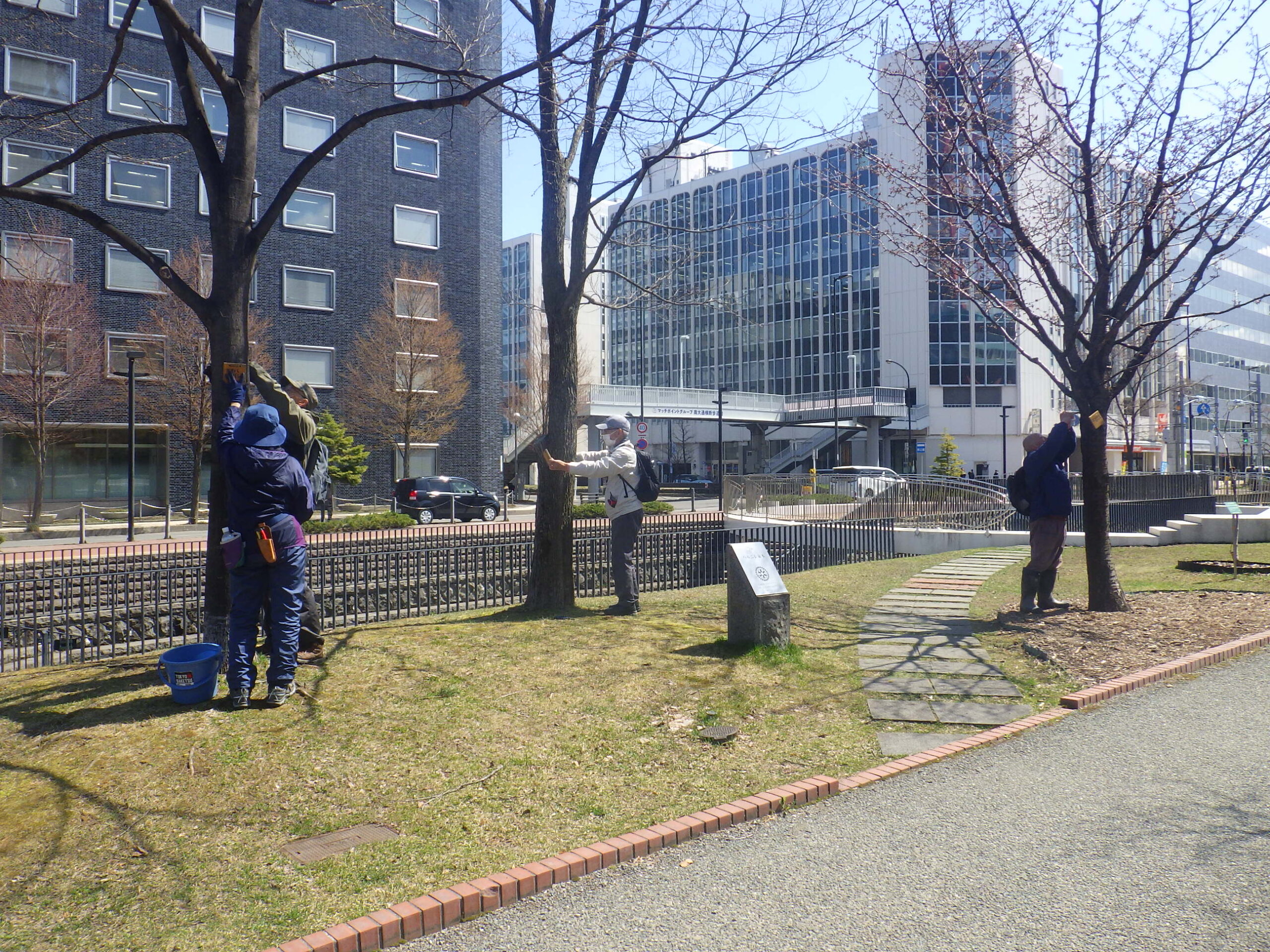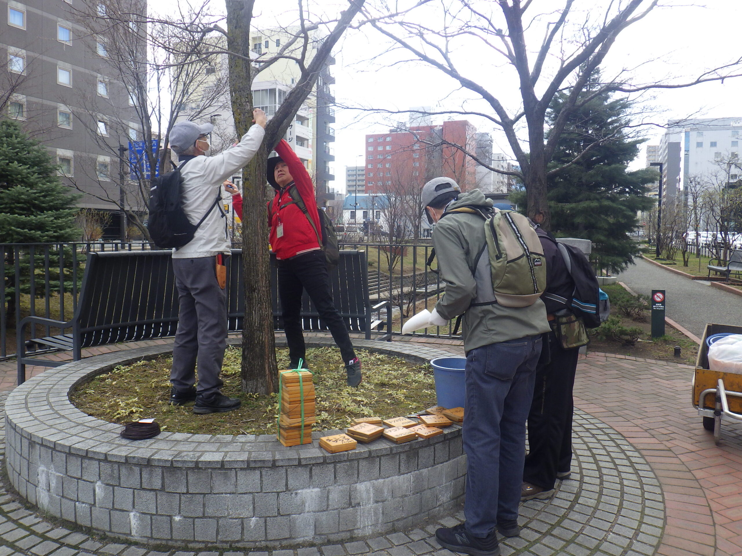 4月14日火曜日、先週の雨模様の天気からはうって変わっていいお天気に恵まれた中、植物ボランティアでは樹名板付けの作業を行いました。 公園内には、約200本ある品種物のライラックを除いて、約360本の樹木があります。 たくさんある樹名板を一つ一つ丁寧に取り付けていきます。 来週までかかってすべての樹木に樹名板を取り付ける予定です。