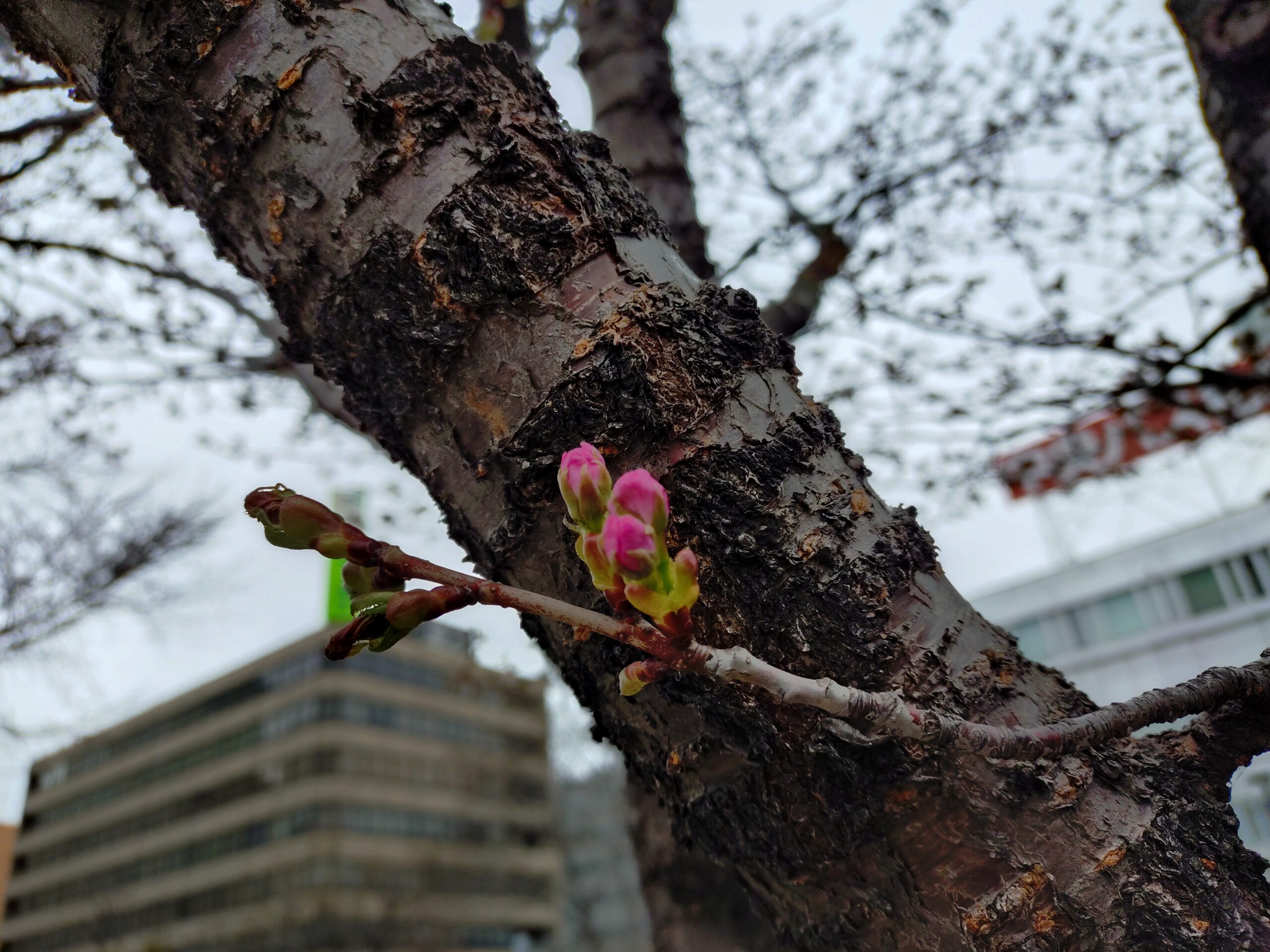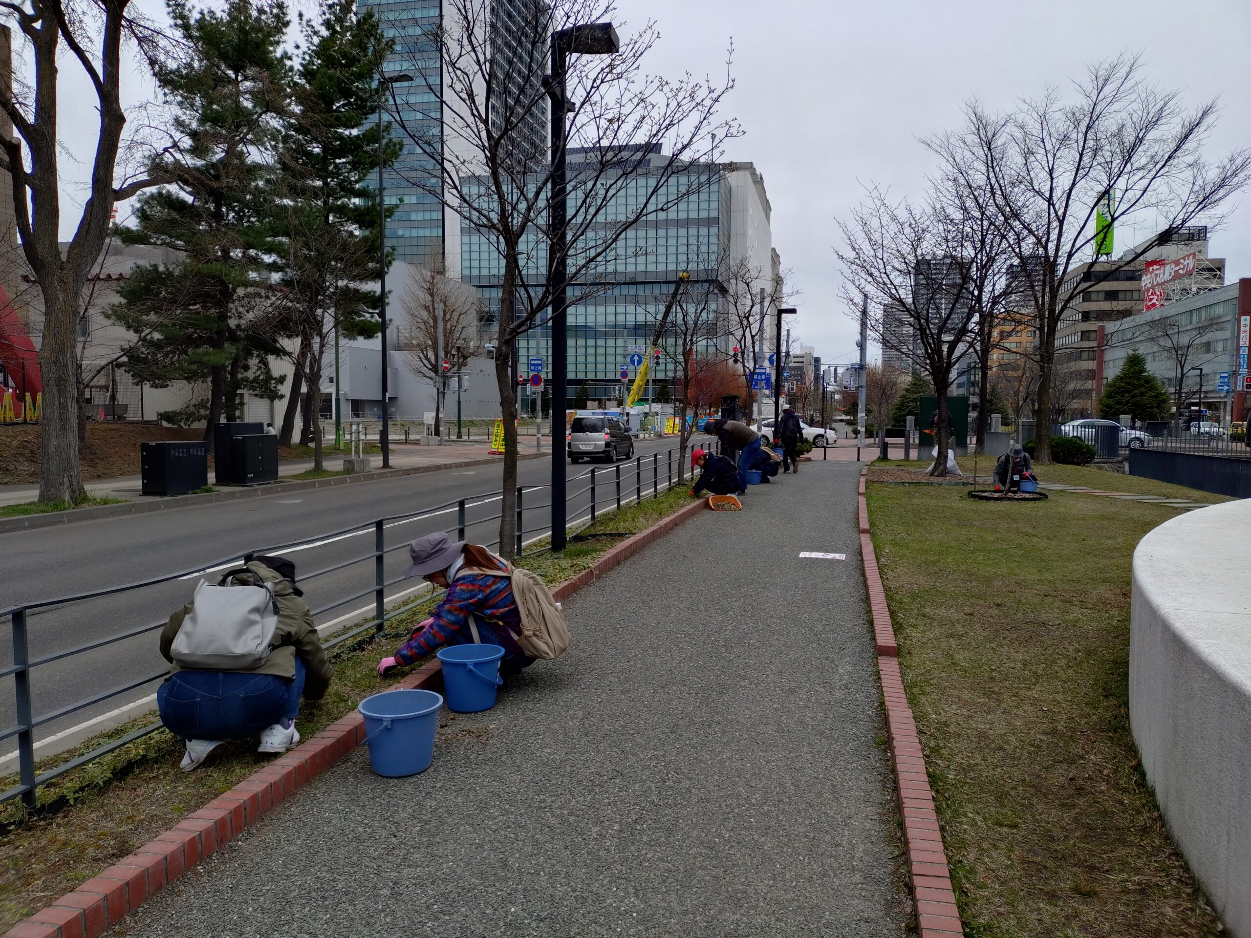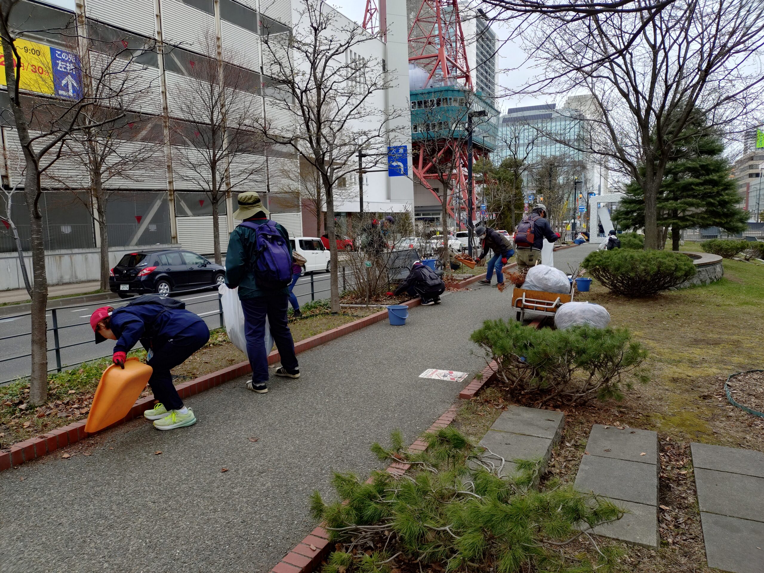 4月15日水曜日、お助け隊では先週に引き続き、春の園内清掃落ち枝拾いや落ち葉清掃と花壇の除草を行いました。 久しぶりの作業に、みんな熱が入ります。 まだ外作業が始まったばかり、あんまりとばして頑張ると疲れるね、と言いながらもついつい夢中になってしまいます。 北1条のエゾヤマザクラは、昨日より少し、ピンクの所が見えてきました。