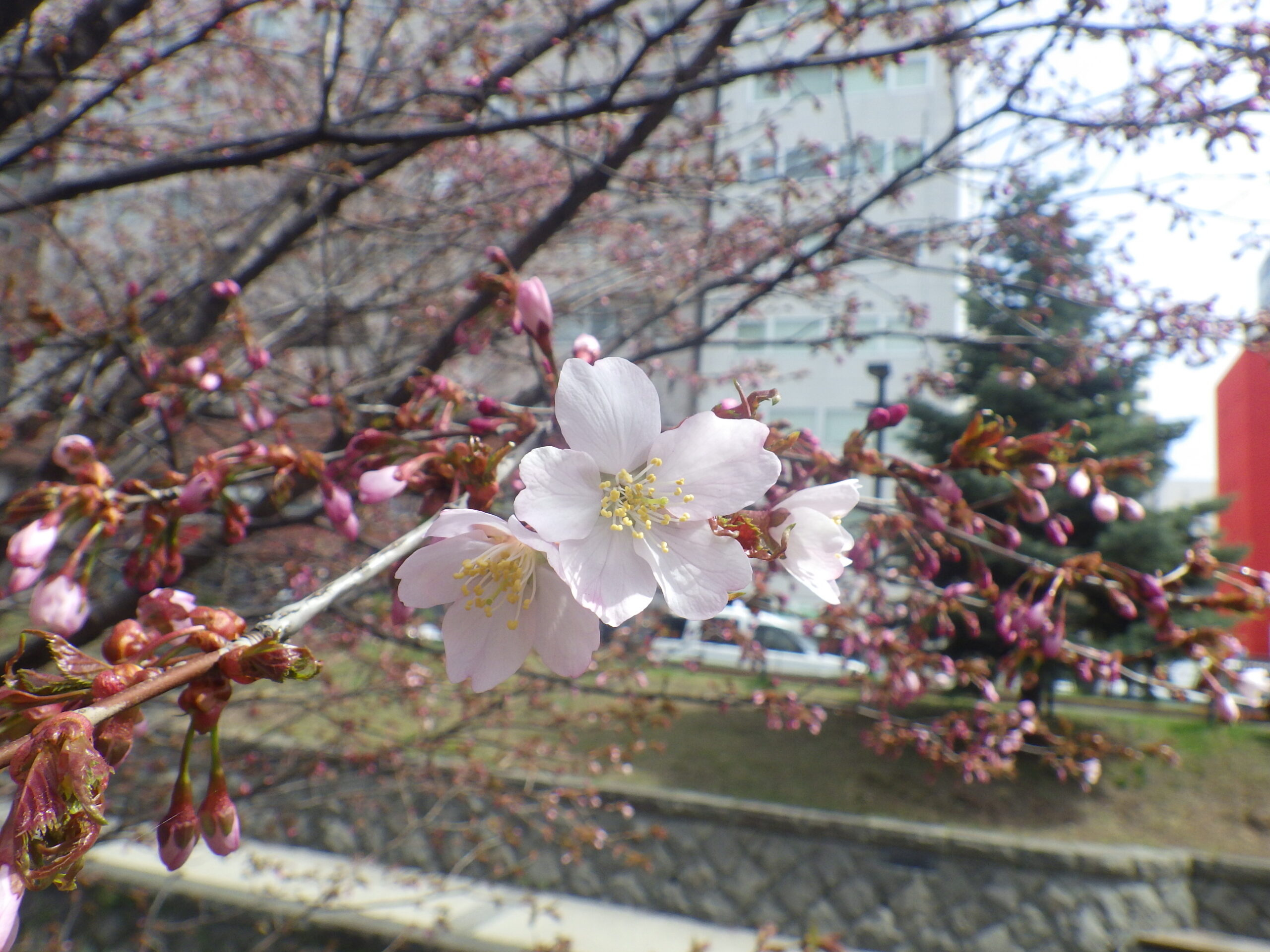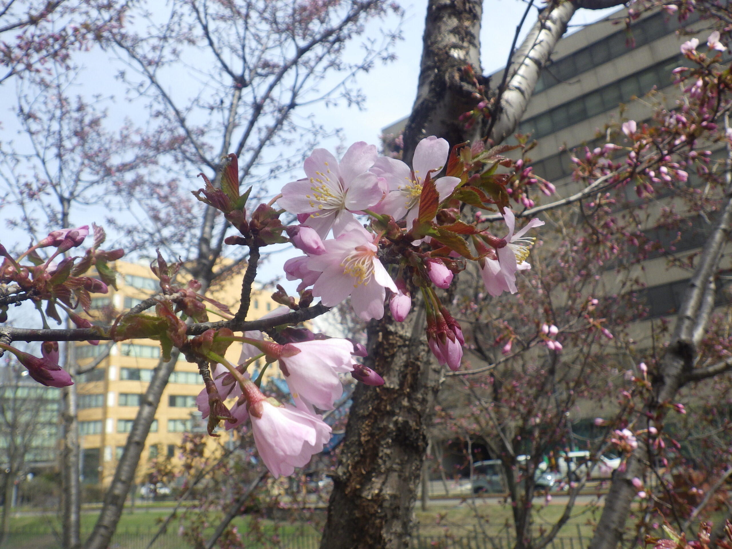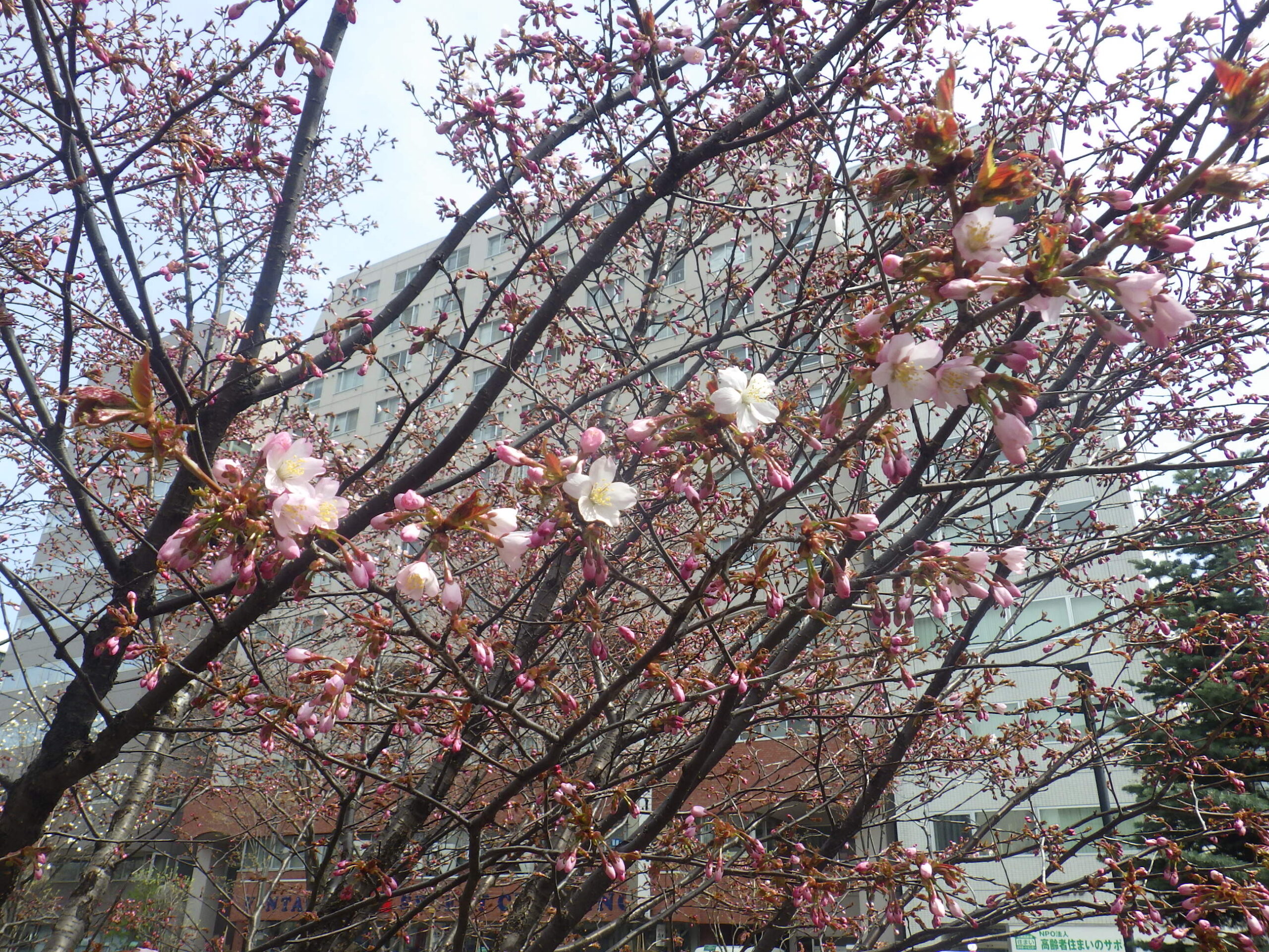 4月17日金曜日の午前中、公園内でチシマザクラが咲いていました。開花宣言です! 南2条西側のチシマザクラ 開花宣言の5輪以上はしっかり咲いています。 南4条東側のチシマザクラも開花です。 北2条西側でも 北1条西側のエゾヤマザクラも何輪か咲いていました。 ライラックのつぼみも色づいてどんどん膨らんでいます。 早咲きのアセシッピー 早咲きのエスタースティリーです。 ライラックの開花宣言はいつになるでしょうか。
