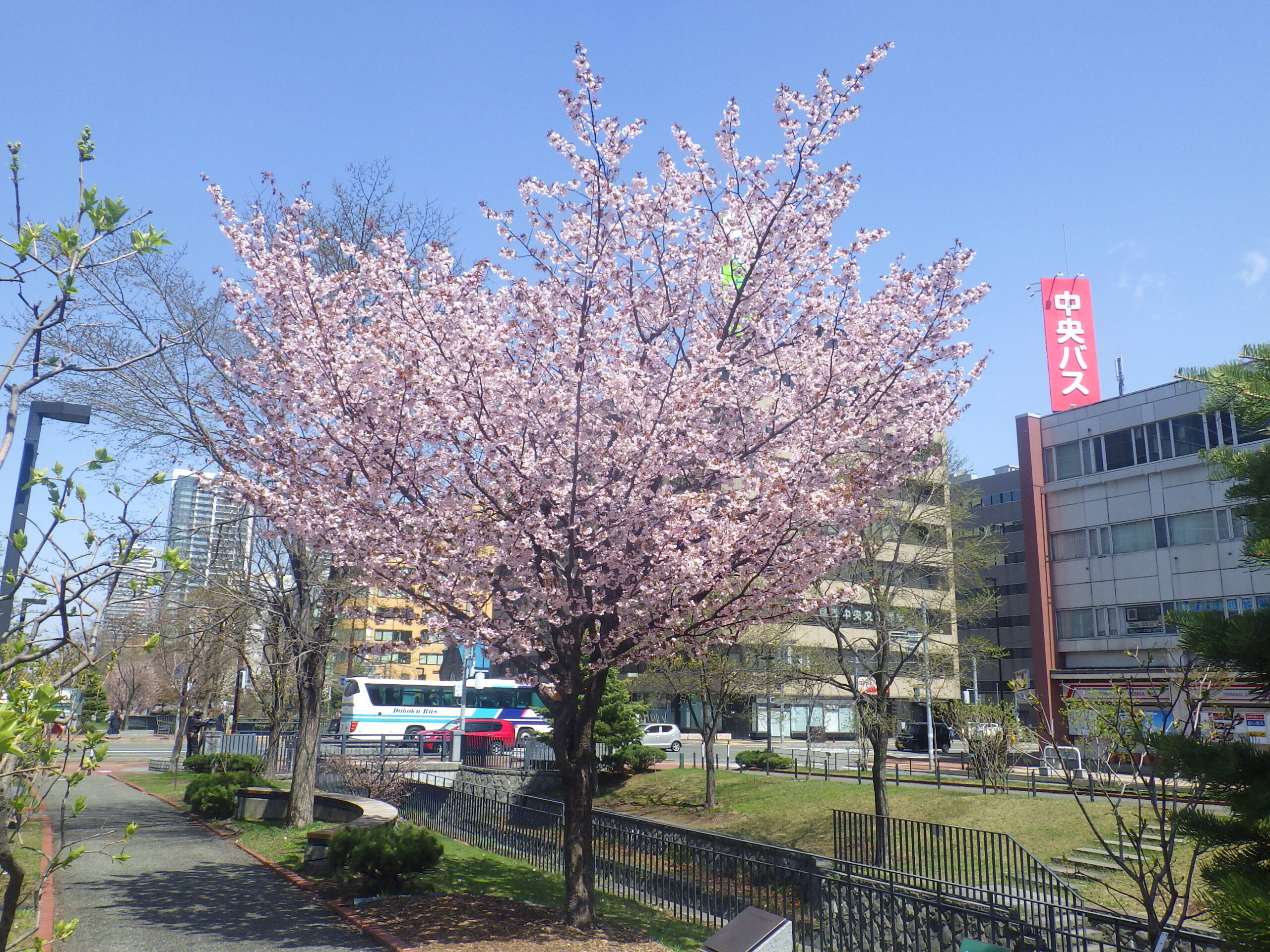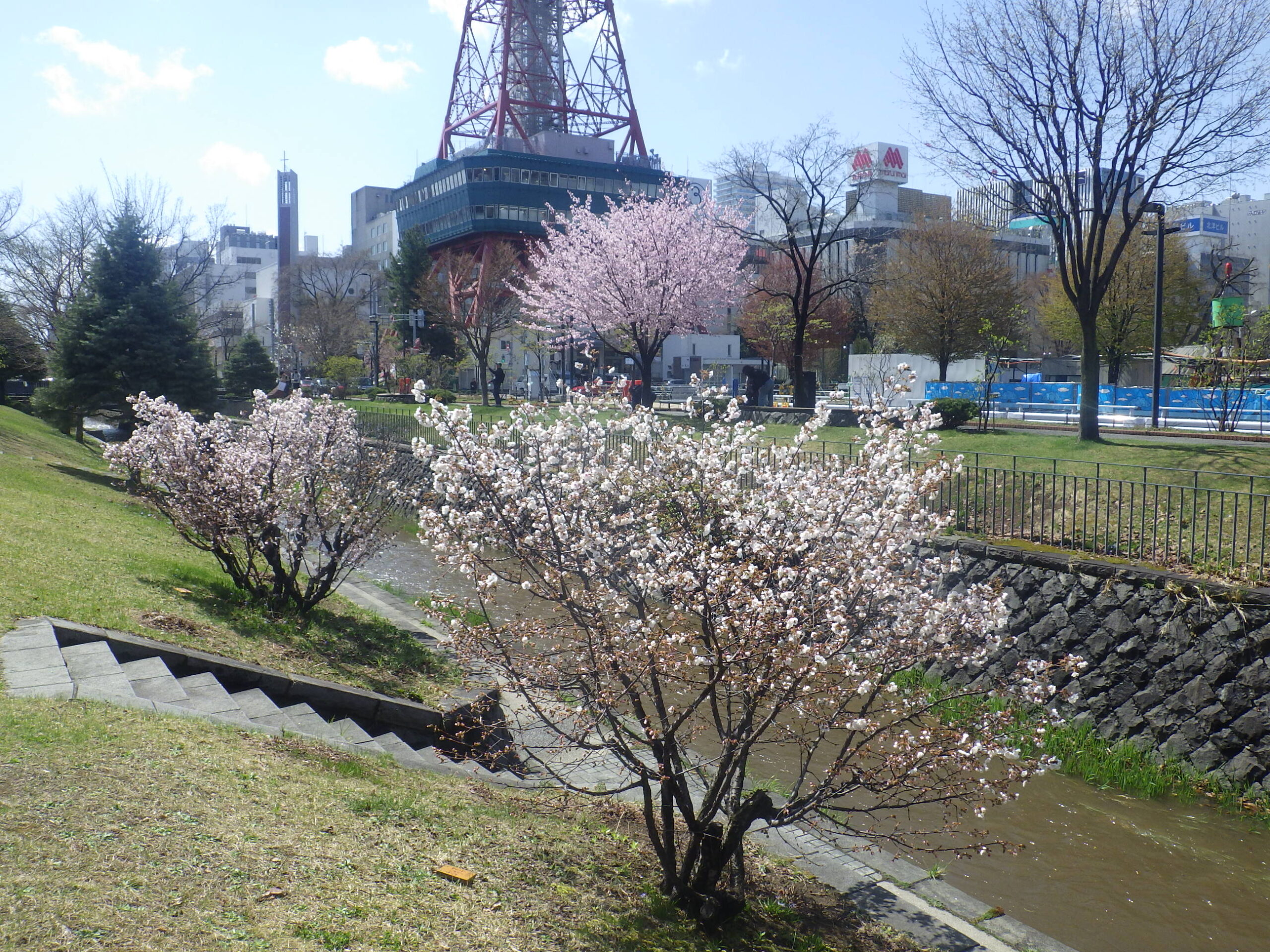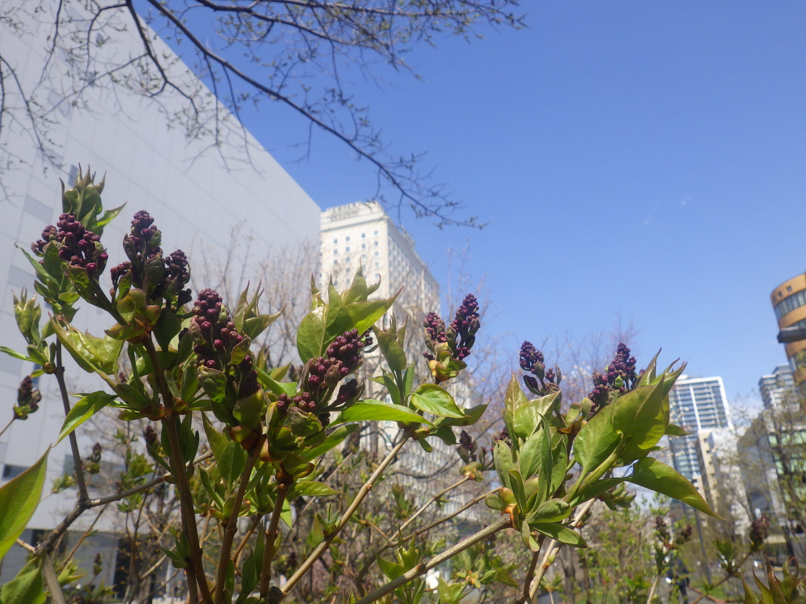4月21日火曜日、朝まで雨が降っていましたが、10時過ぎにはあがって青空が見えました。 公園内の桜が見頃です。 北1条では創成川をはさんでチシマザクラとエゾヤマザクラが楽しめます。 北1条西側のエゾヤマザクラ 南1条西側のエゾヤマザクラ 南4条西側のチシマザクラ 南2条西側のチシマザクラ 北2条西側のチシマザクラ 早咲きライラックのアセシッピーのつぼみです。もう少しですね!