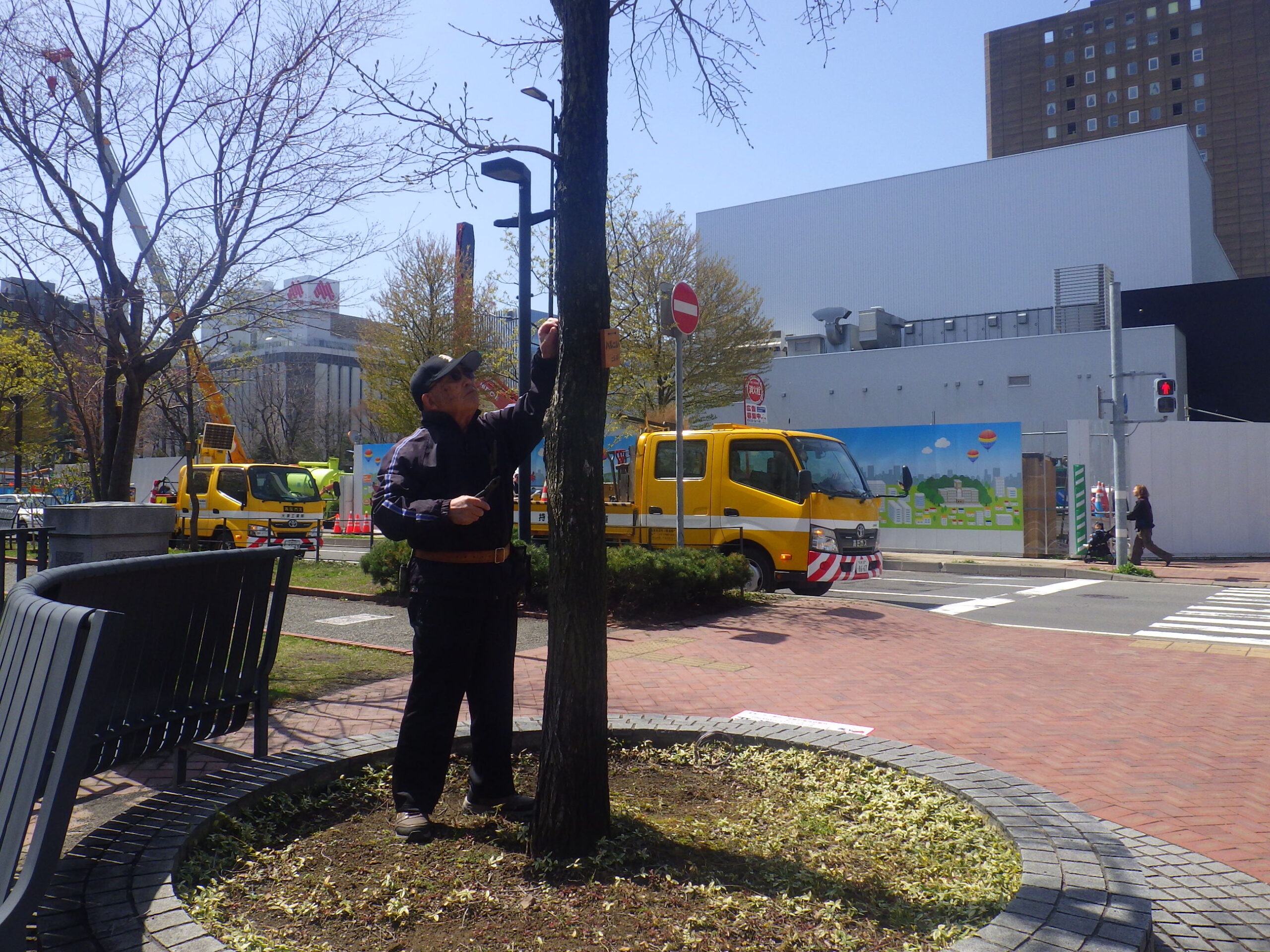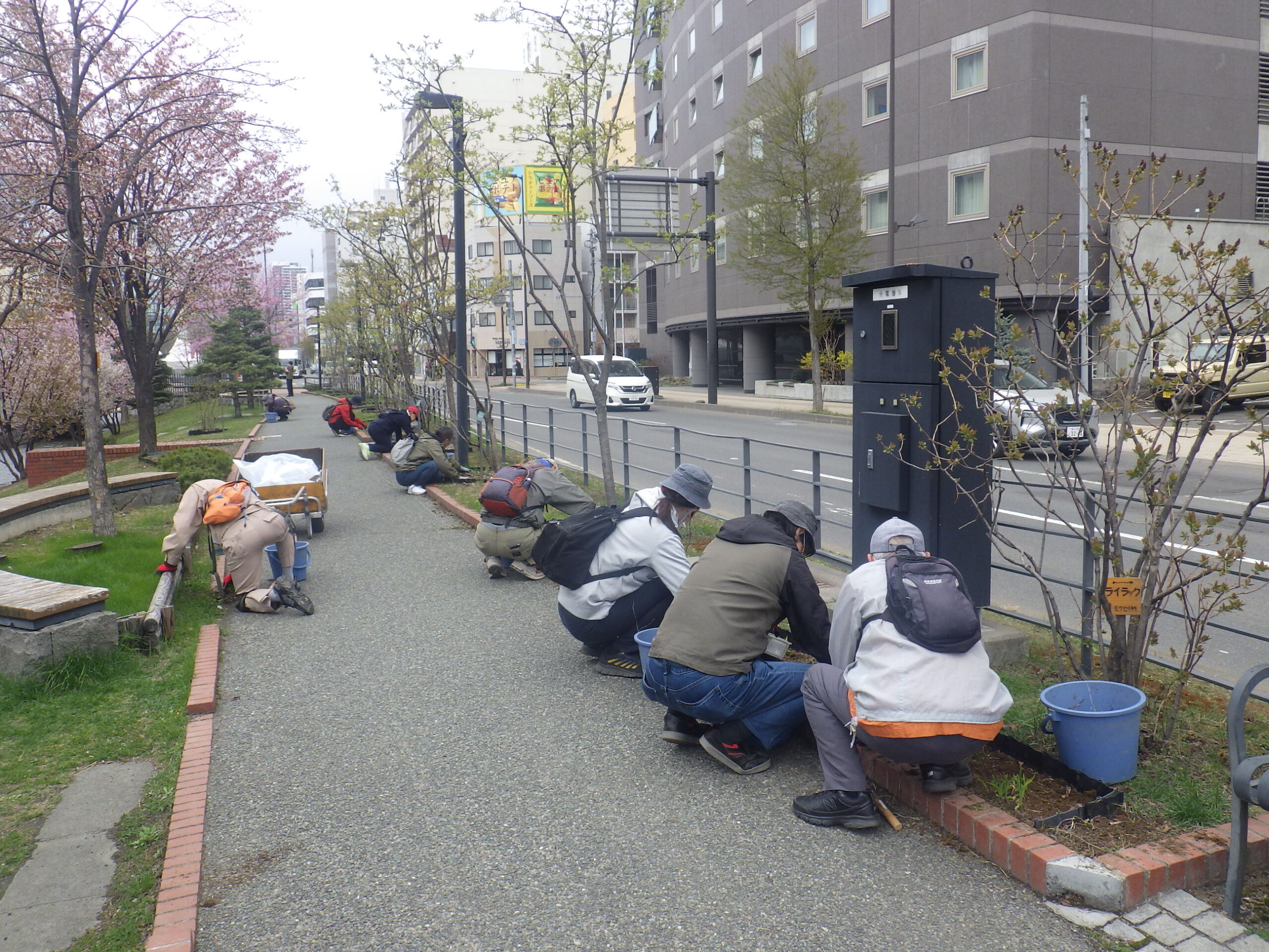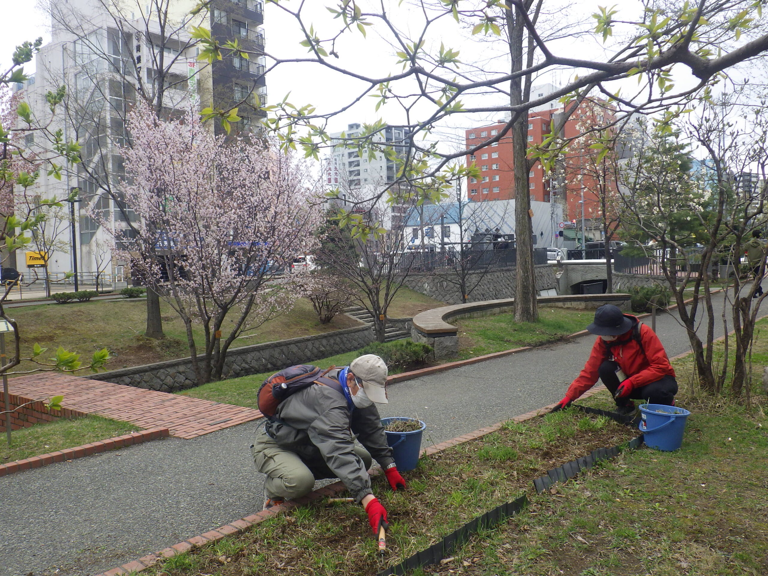 4月21日火曜日、企業さんが公園の清掃活動をしてくれていました。 同じ4月21日火曜日、植物ボランティアでは北1条の樹名板の取り付け作業を行いました。 樹名板が取り付けられた、満開のエゾヤマザクラです。 4月22日水曜日、お助け隊では花壇と園路の除草作業をして春の公園をきれいにしました。 4月23日木曜日、花くらぶは先週植えたビオラのお手入れです。 公園ボランティアさんのお力で、公園が着実に春を迎えていきます。