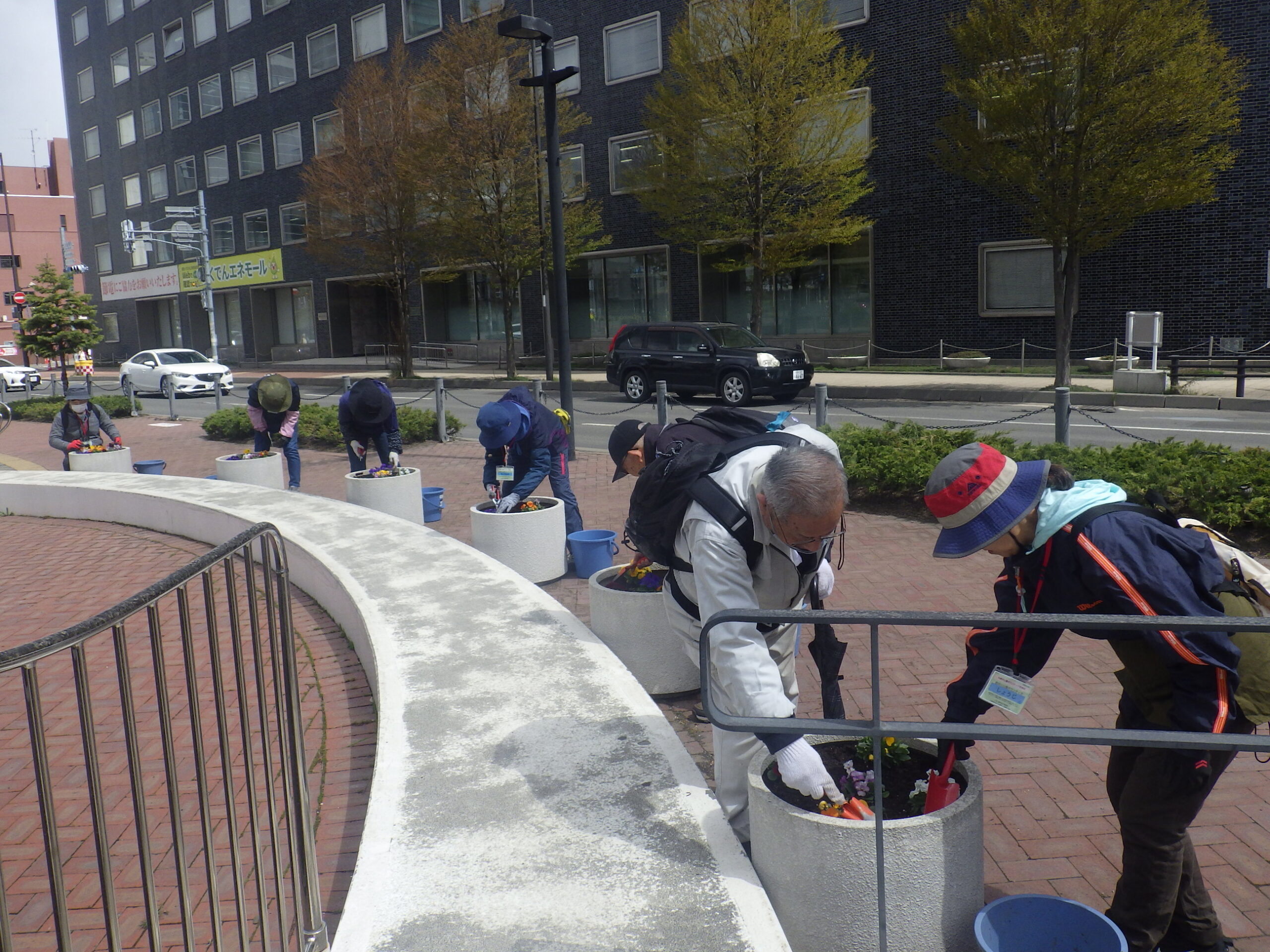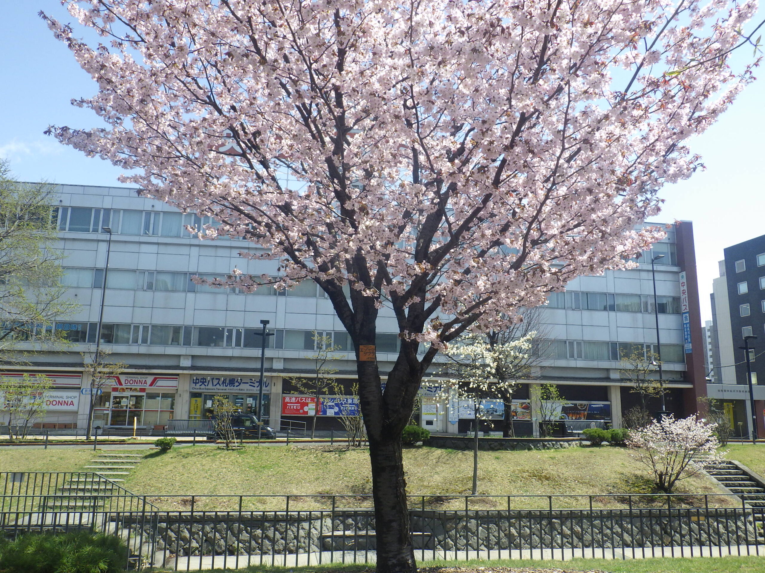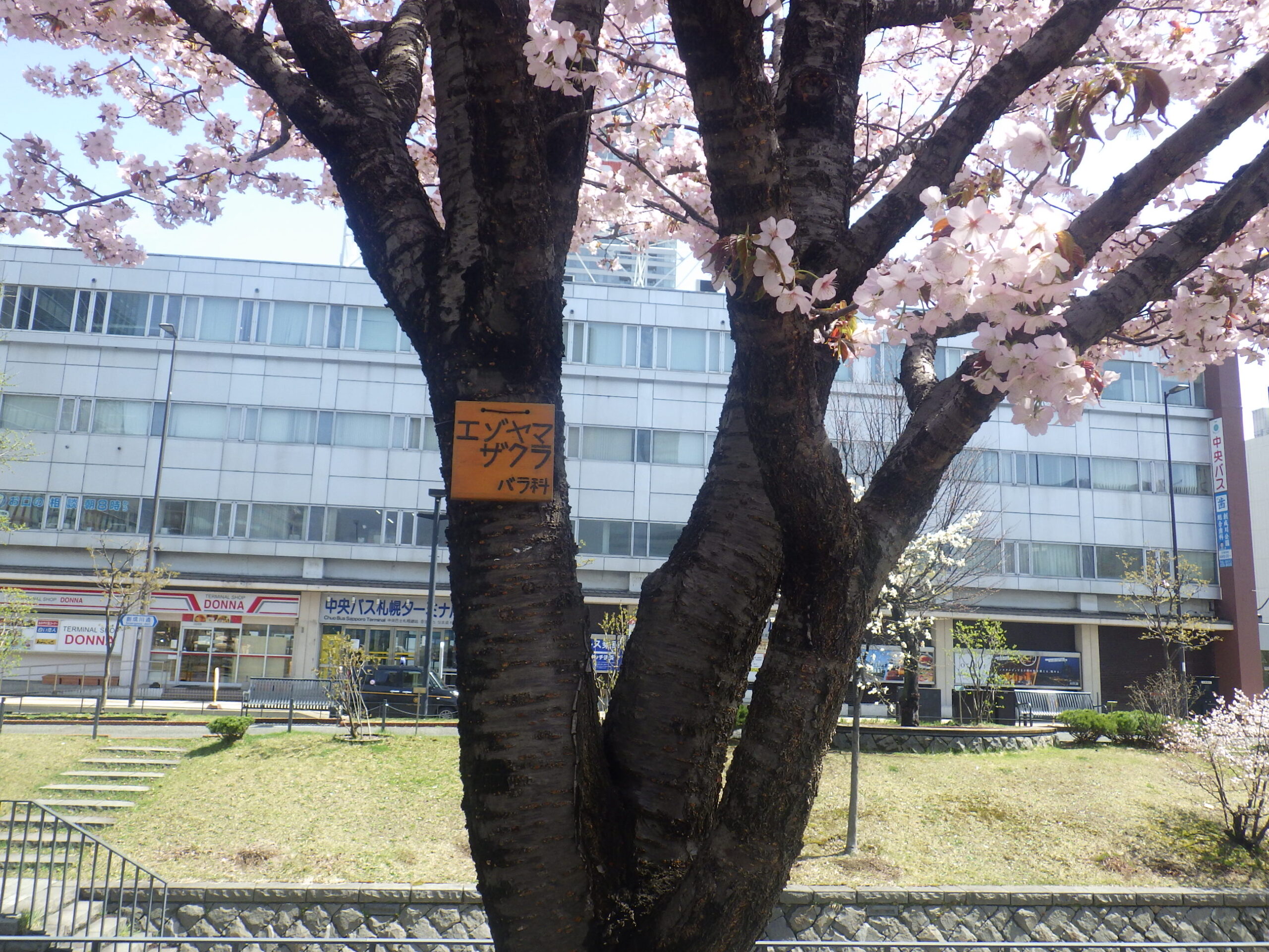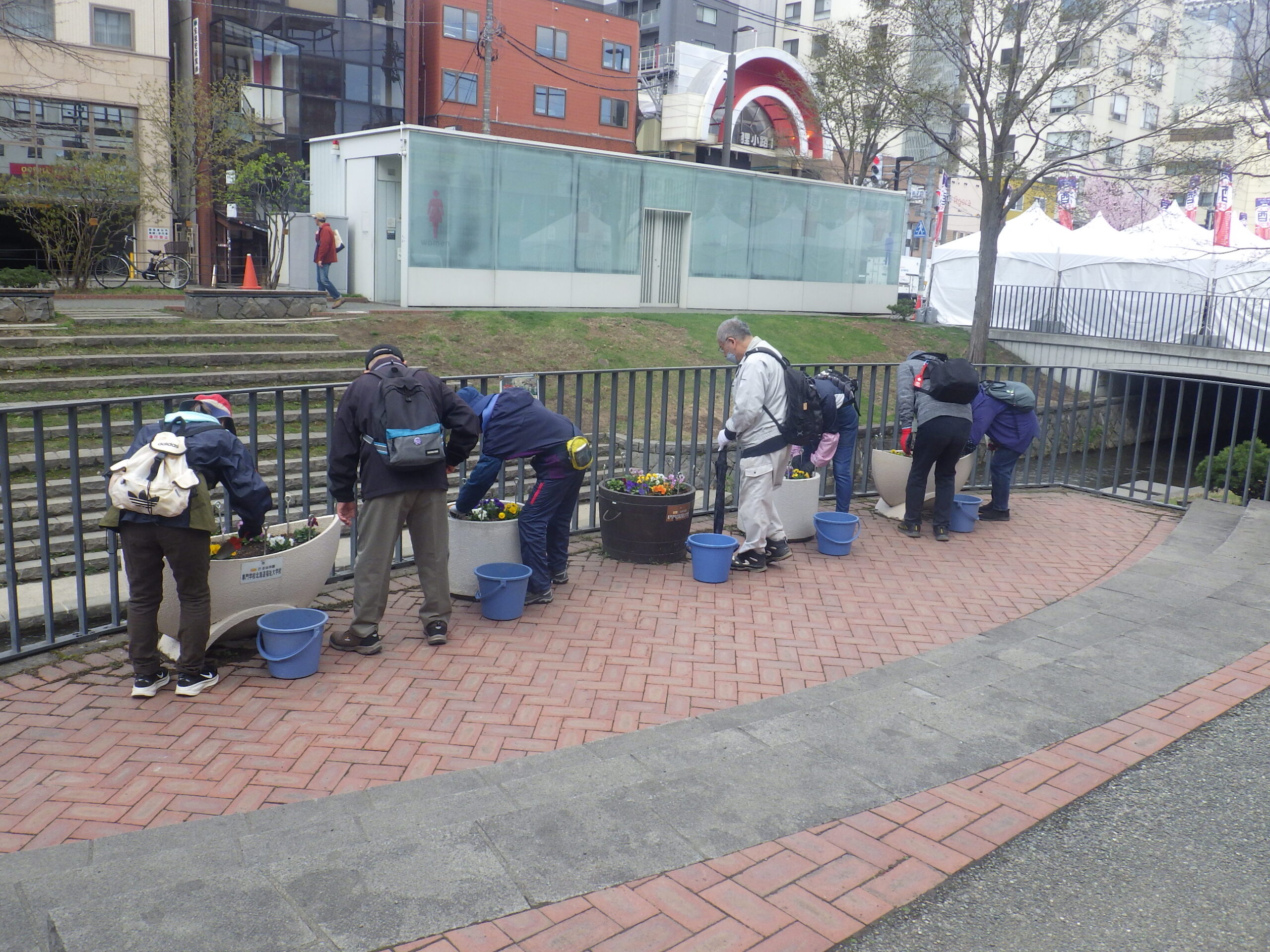 4月21日火曜日、企業さんが公園の清掃活動をしてくれていました。 同じ4月21日火曜日、植物ボランティアでは北1条の樹名板の取り付け作業を行いました。 樹名板が取り付けられた、満開のエゾヤマザクラです。 4月22日水曜日、お助け隊では花壇と園路の除草作業をして春の公園をきれいにしました。 4月23日木曜日、花くらぶは先週植えたビオラのお手入れです。 公園ボランティアさんのお力で、公園が着実に春を迎えていきます。