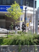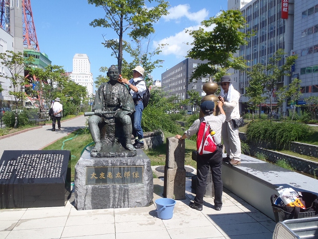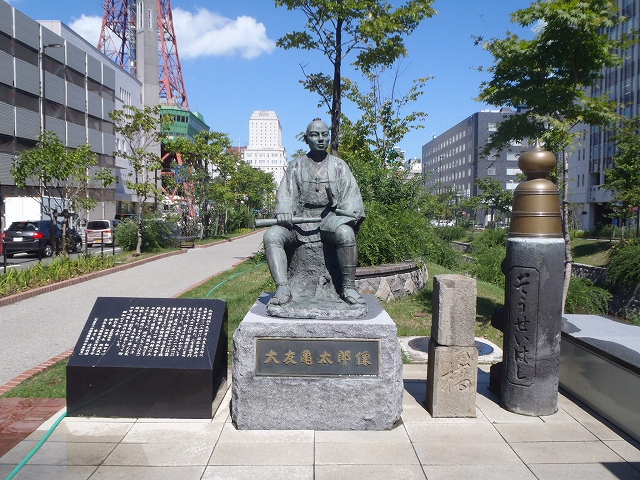 南1条開拓の広場にいる「大友亀太郎」さん。