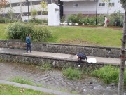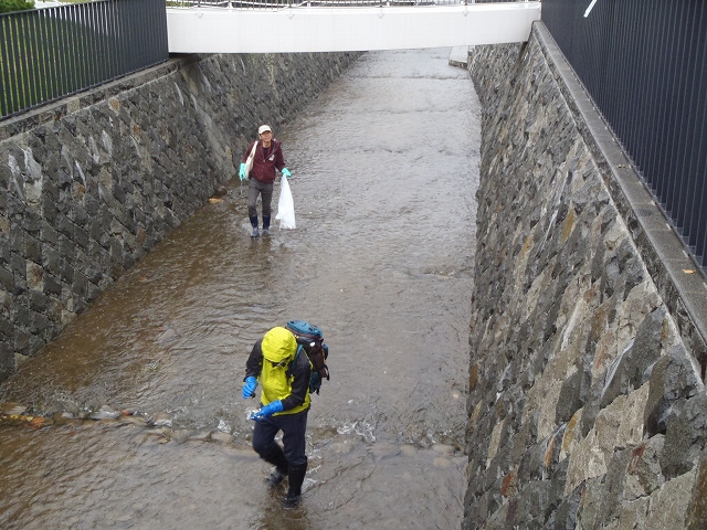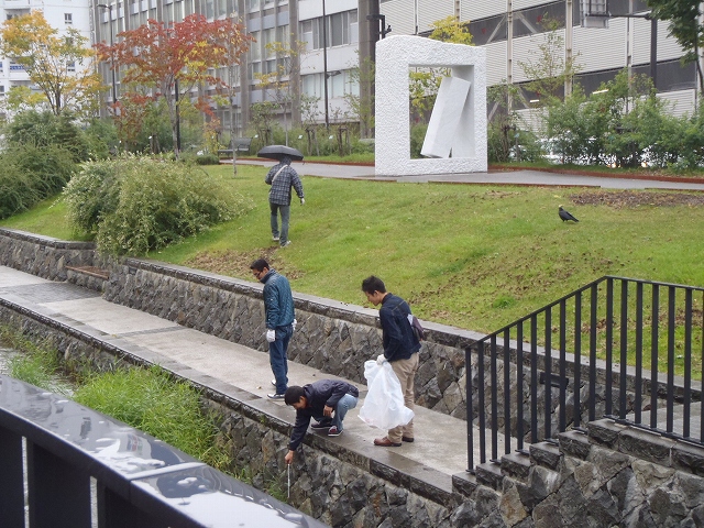 10/20あいにくの雨の中、まずは午前中に企業ボランティアのリコージャパンの皆さんが、園内と川の中の清掃に取り組んでくれました。