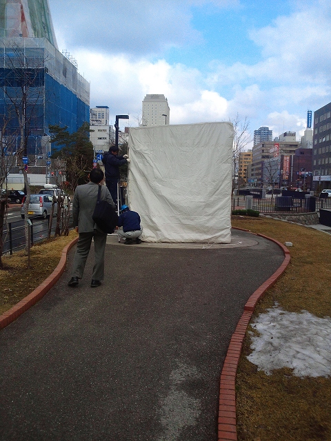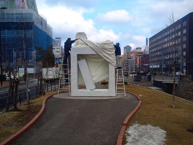 園内の雪も解けて、春に向かう4/18の木曜日の朝、 安田侃さんの作品「生誕・生棒・天秘」の4つの作品のシートが外されました。 今週の土曜日20日に、毎年、月に1回ボランティア清掃してくれている方々の作品清掃がスタート。 綺麗になった、来週初めから、作品のライトアップも行います。 ↓ 4ヶ月ぶりのお目見えです!