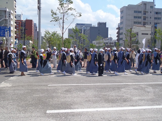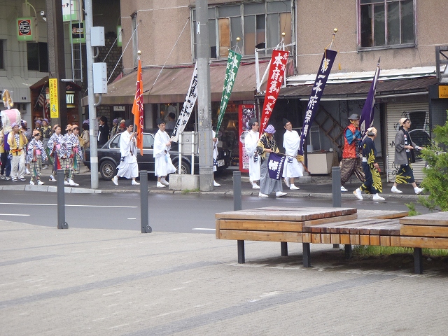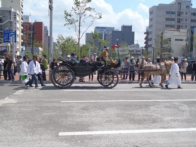 南3条の西向き一方通行を「神輿渡御」が通ります。