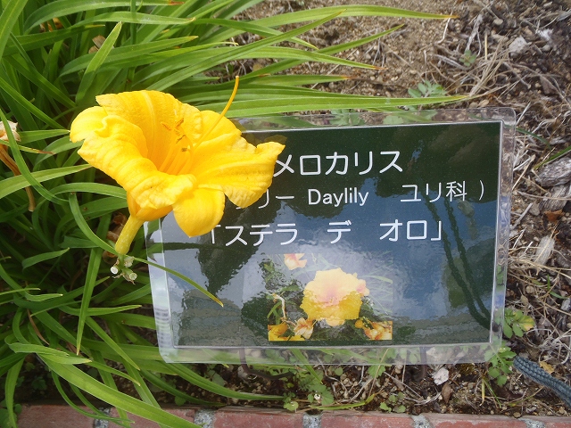 ヘメロカリスの花壇には品種名と花の写真を載せた「花名札」をつけています。
