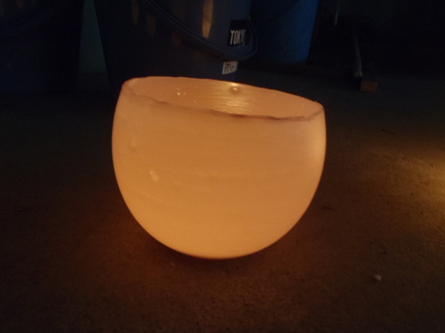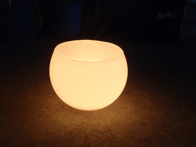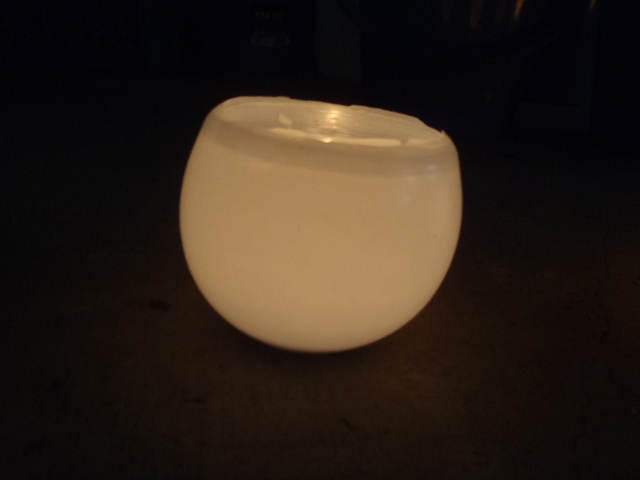 白いワックスボールに炎の大きなロウソクを灯したもの