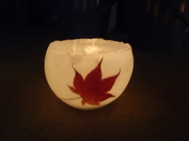 白いワックルボールに落ち葉をコーティングしたもの(ティーキャンドル)