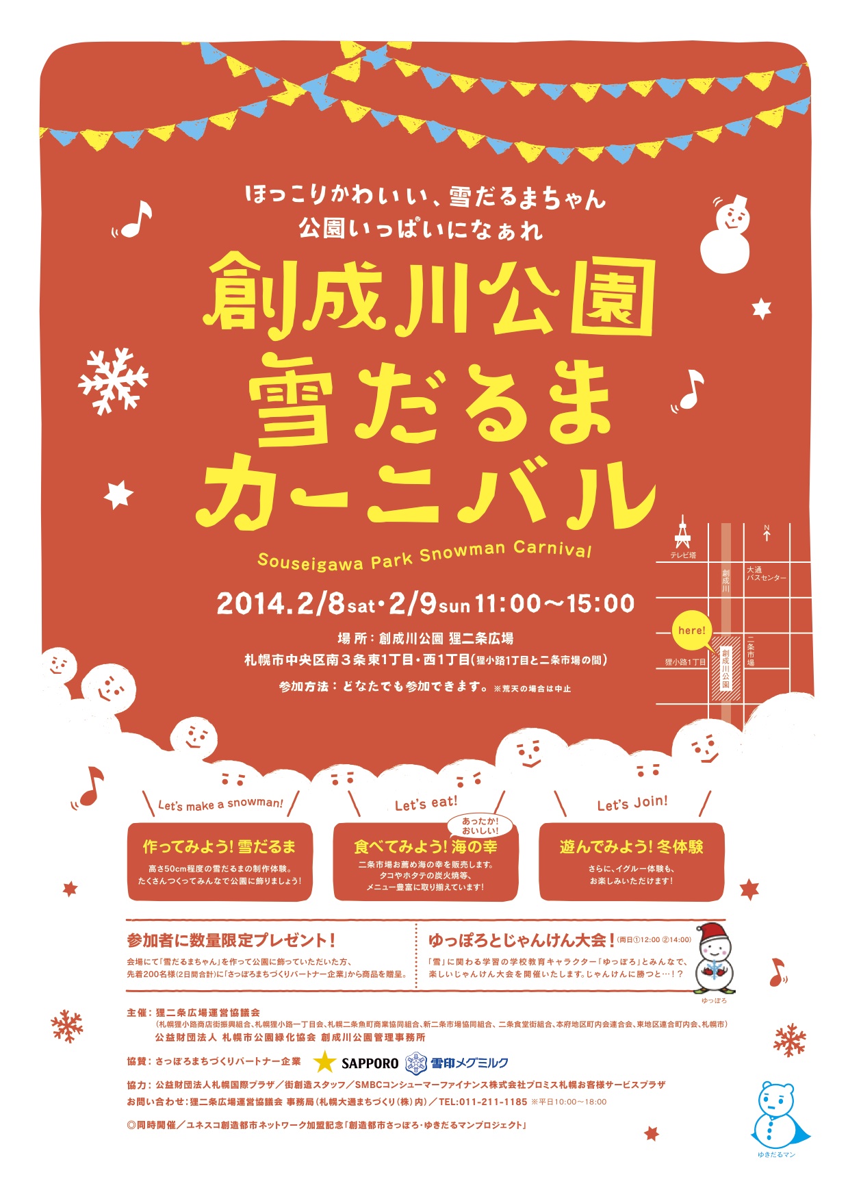 「創成川公園雪だるまカーニバル」 2月8日(土)・9日(日) 11:00~15:00 狸二条広場にて かわいい雪だるまを作りましょう! 「ゆっぽろとじゃんけん大会」や二条市場のあたたかい食べ物の販売もあります。 雪だるまを作ってくれたみなさんには、おいしい・かわいいプレゼントも! 狸二条広場へお集まり下さい(^^)