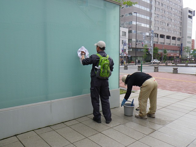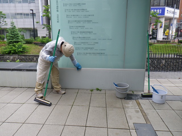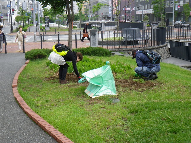 雨が上がるまで、南1条休憩施設とモニュメントのお掃除と、ヘメロカリスの名札付け。