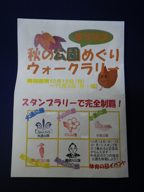 初日の10/12の土曜日、創成川公園→大通公園→円山公園→旭山記念公園→中島公園と、回ってみました。