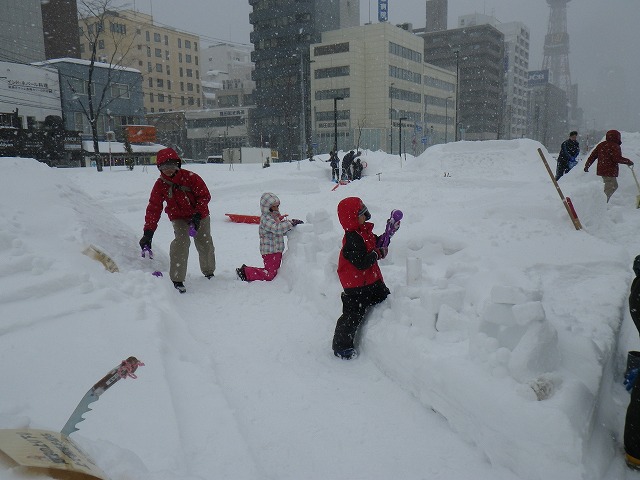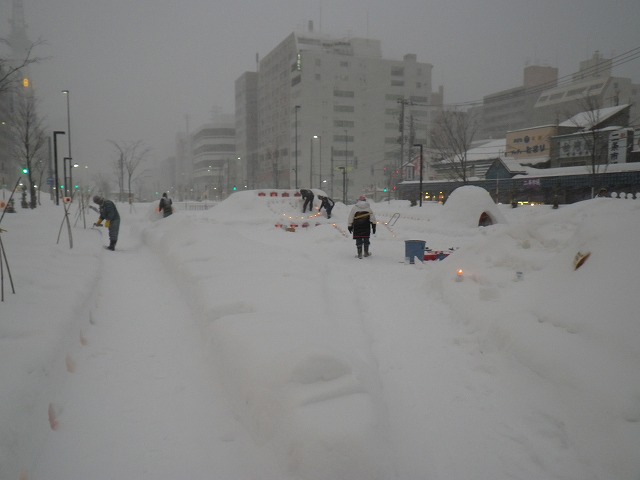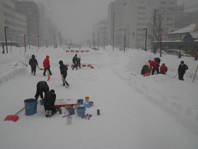 前日の準備作業ではいいお天気に恵まれましたが、当日は開始から夕方に向かうにしたがって吹雪も強くなり、最後はホワイトアウト状態。