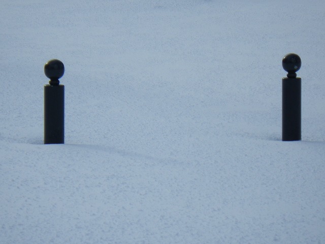 チェーン柵の柱、車止めも、雪から顔を出しています。