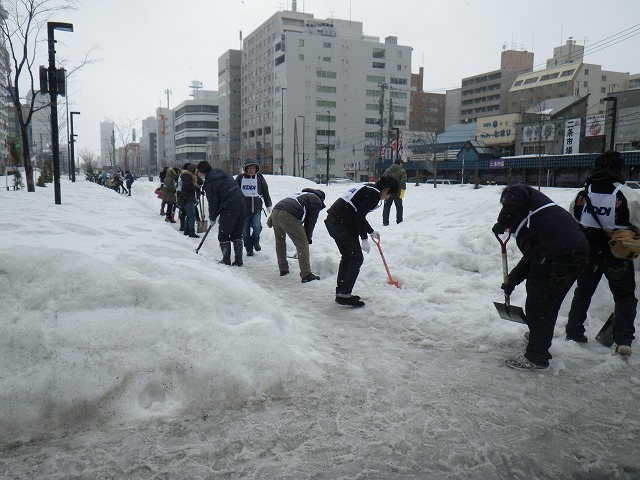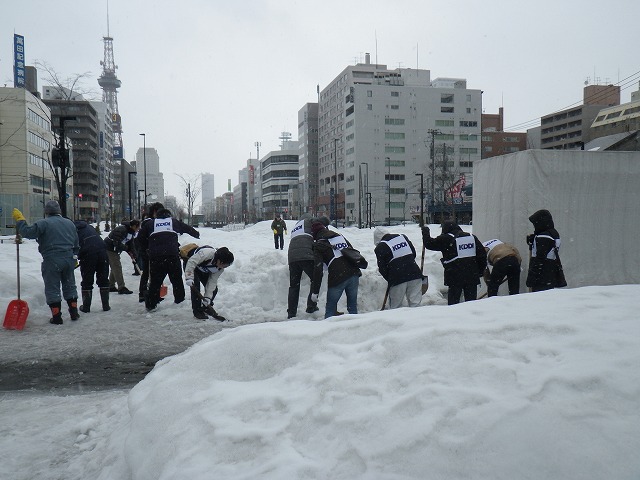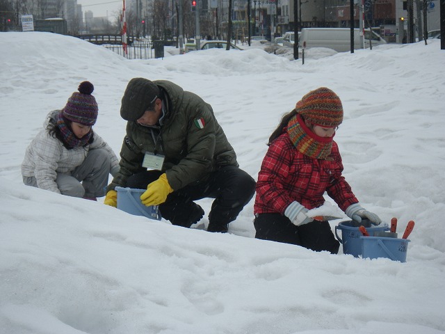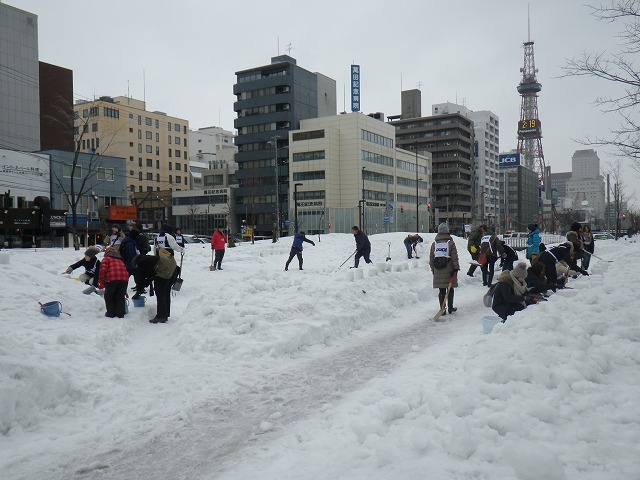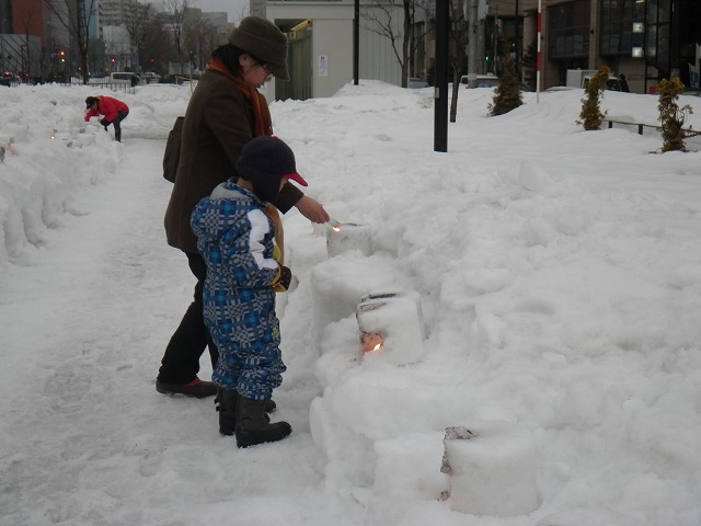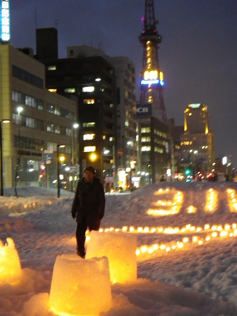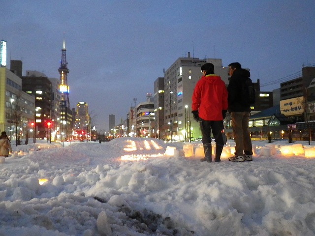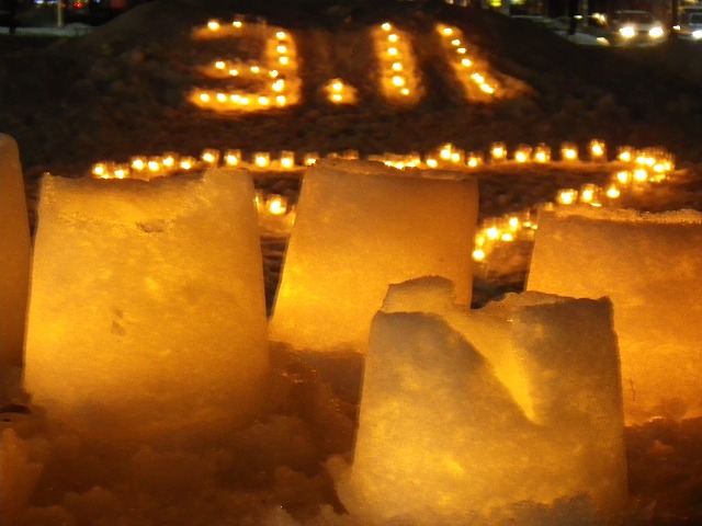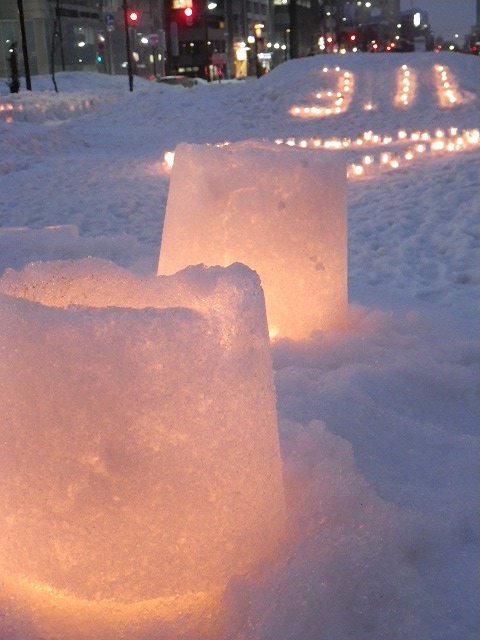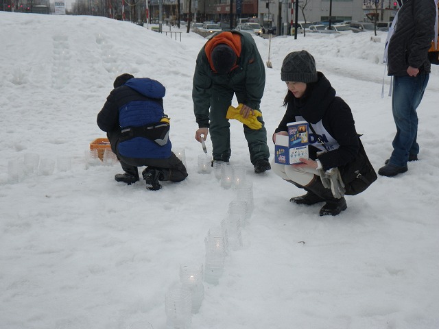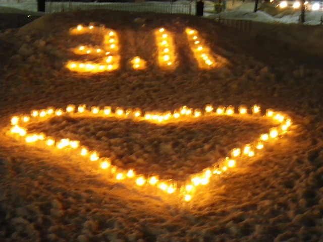 東日本大震災から4年が経とうとしています。 各地で追悼の催し物が行われています。 創成川公園でも3/7土曜日に、「まちの灯りⅡ」として、狸二条広場に灯りをともしました。 企画運営のお助け隊に加えて、 ボランティアで、KDDIのみなさん29名が参加してくれました。 暗くなると灯りがきれいです。 雪と風が強く、ろうそくの火もナカナカつかないような状況でしたが、 集まって頂いたみなさん、ありがとうございました。