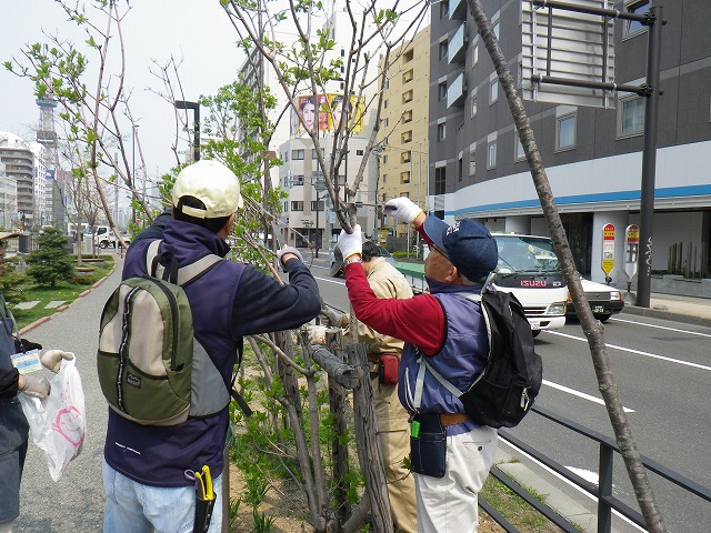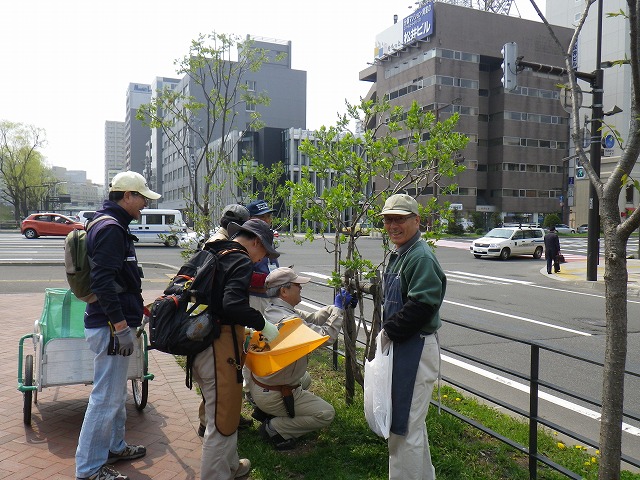 今日は、先週残した南の2ブロックのライラックの春の剪定と、除草、そして大通ブロックのコンテナの花植え作業を行いました。