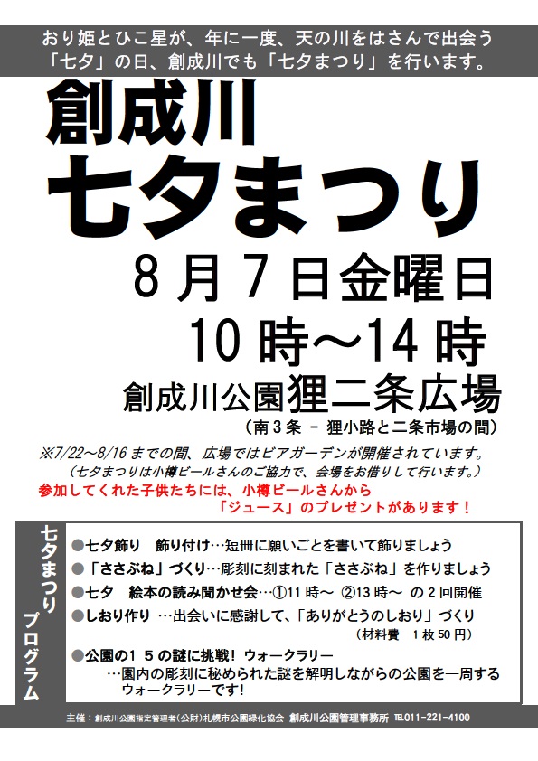 小樽ビールのビアガーデンが行われている創成川公園狸二条広場で、8月7日金曜日に「創成川七夕まつり」を開催します。