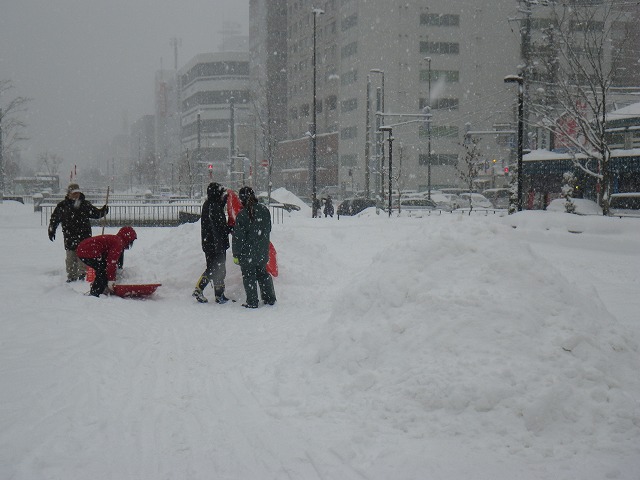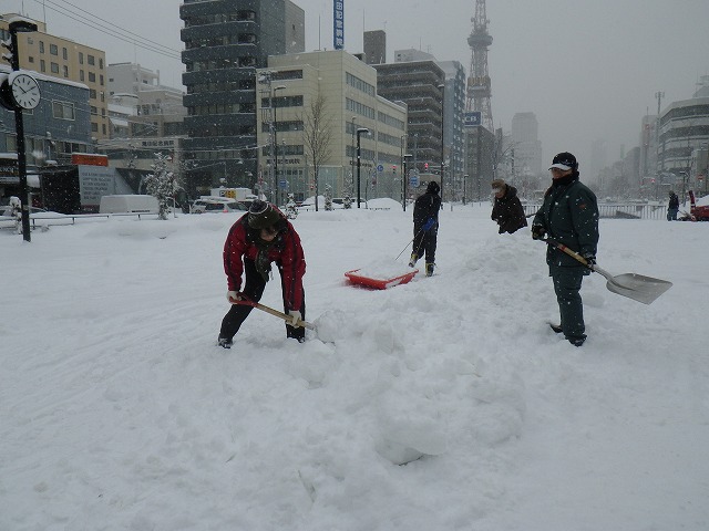 明日、晴れることを祈って、吹雪の中、みんなで準備しました。