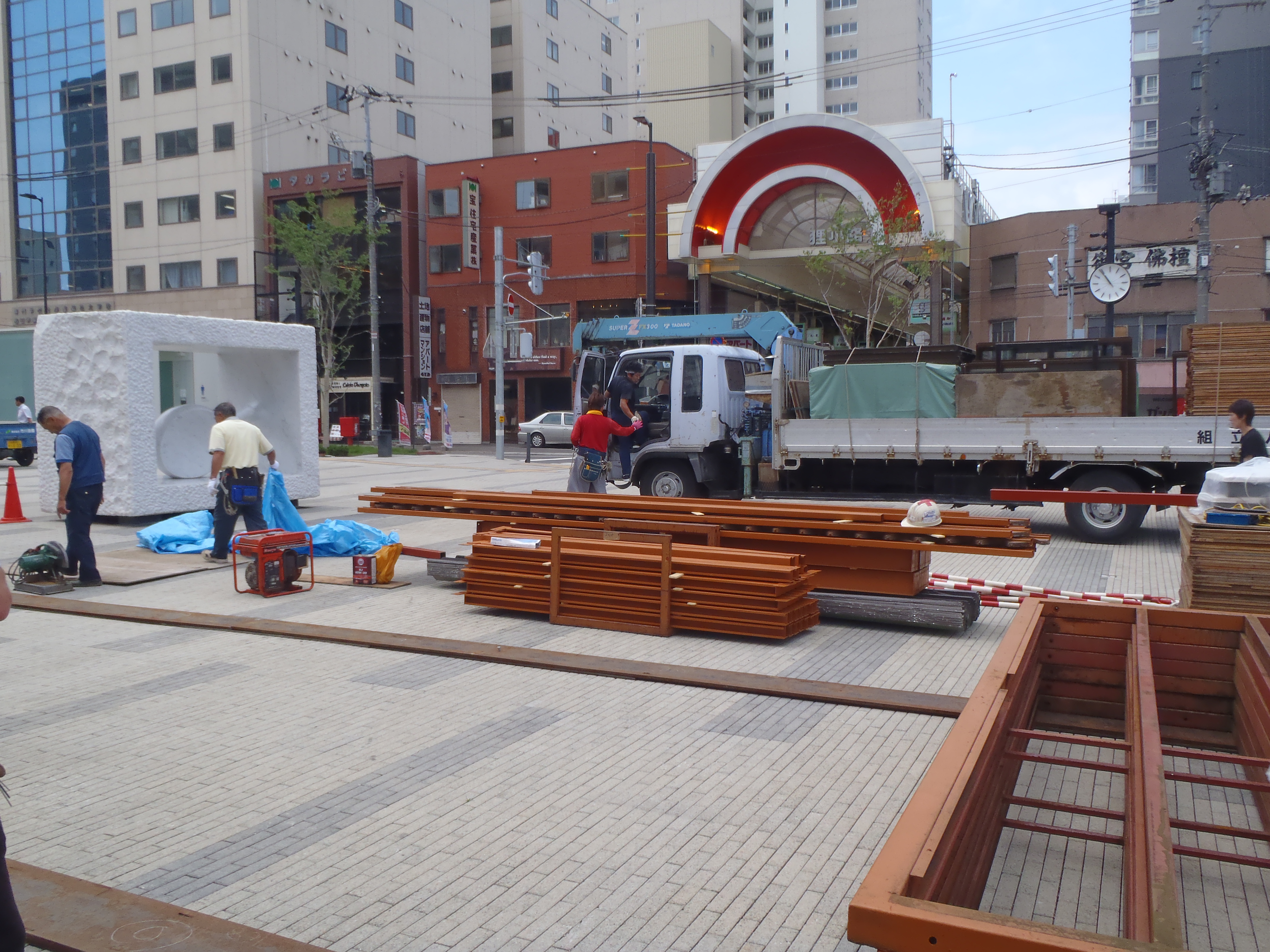 狸二条広場でビアガーデン 7/21(木)~8/15(月)まで、狸二条広場でビアガーデンが開催されます。 7/11から、広場ではビアガーデンの設営が始まっています。 ・・・ 大きなトラックが出入りすることもありますので、通行の際には十分にお気を付けください。