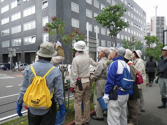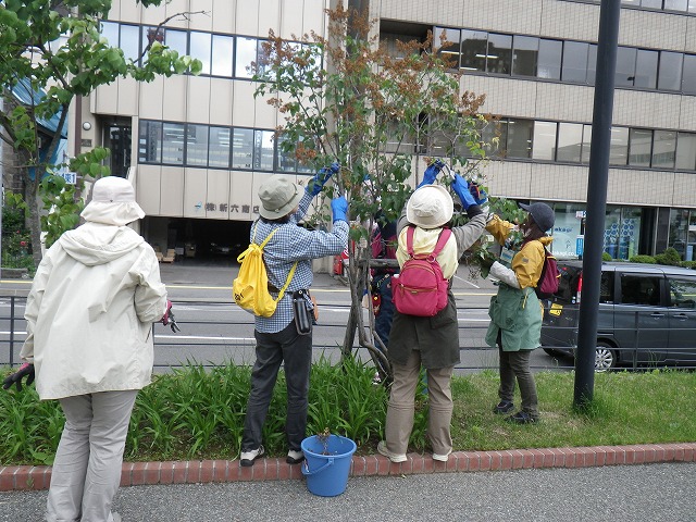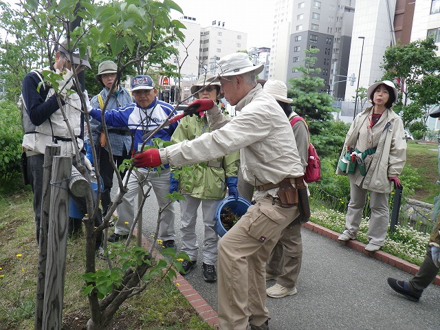 6/14の植物ボランティアは、笠先生の指導のもと、ライラックの花後剪定を行いました。 園内のライラックは、高さを抑えて、花や香りを目の高さで楽しめるようにしています。 どの枝を切っていいのか、、、ボランティアの皆さんも最初は不安ですが、なれてくると要領がだんだんわかってきて鋏を持つ手も生き生きとしていました。 園内に1本だけ植えられている「ヤマボウシ」も開き始めています。