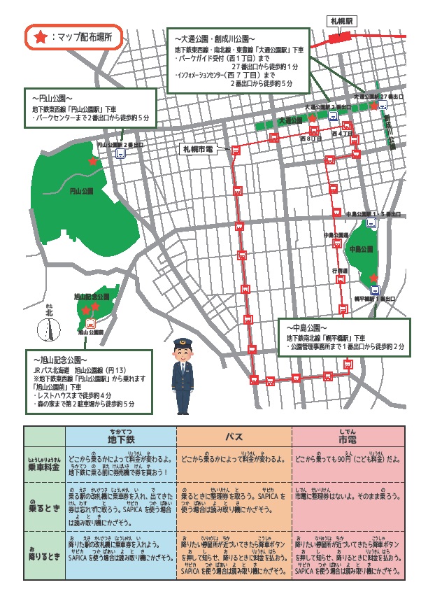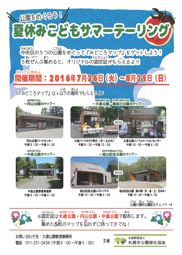 札幌市公園緑化協会では、中央区の「円山公園」「大通公園」「中島公園「旭山記念公園」そして「創成川公園」の5つの公園を巡って、こども公園博士となる「認定証」をもらえる、「夏休みこどもサマーテーリング」を開催します。