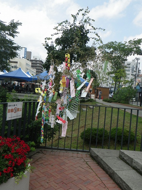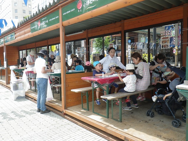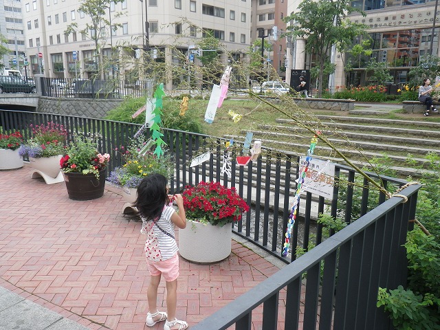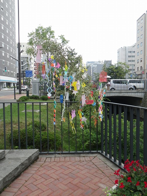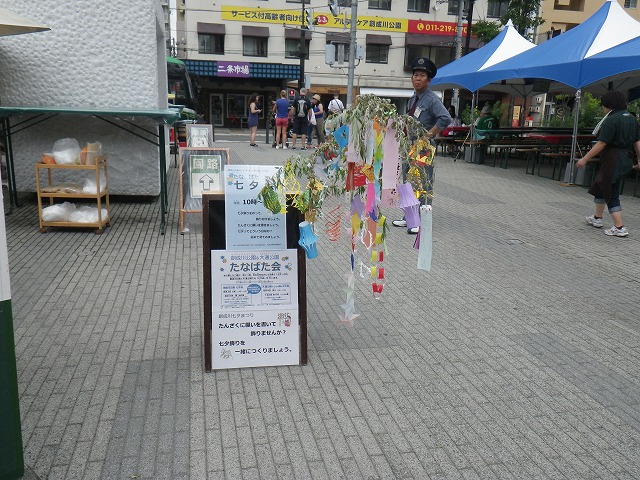 今日、8月3日(水)、小樽ビールさんのご協力を得て「創成川公園七夕会」を開催しました。 天候に恵まれ(すぎて・・・)、たくさんのこどもたち、親子連れが参加してくれました。 みんなで作った飾りを付けた「七夕飾り」が、広場南側のコンテナ花壇の両サイドに設置されました。